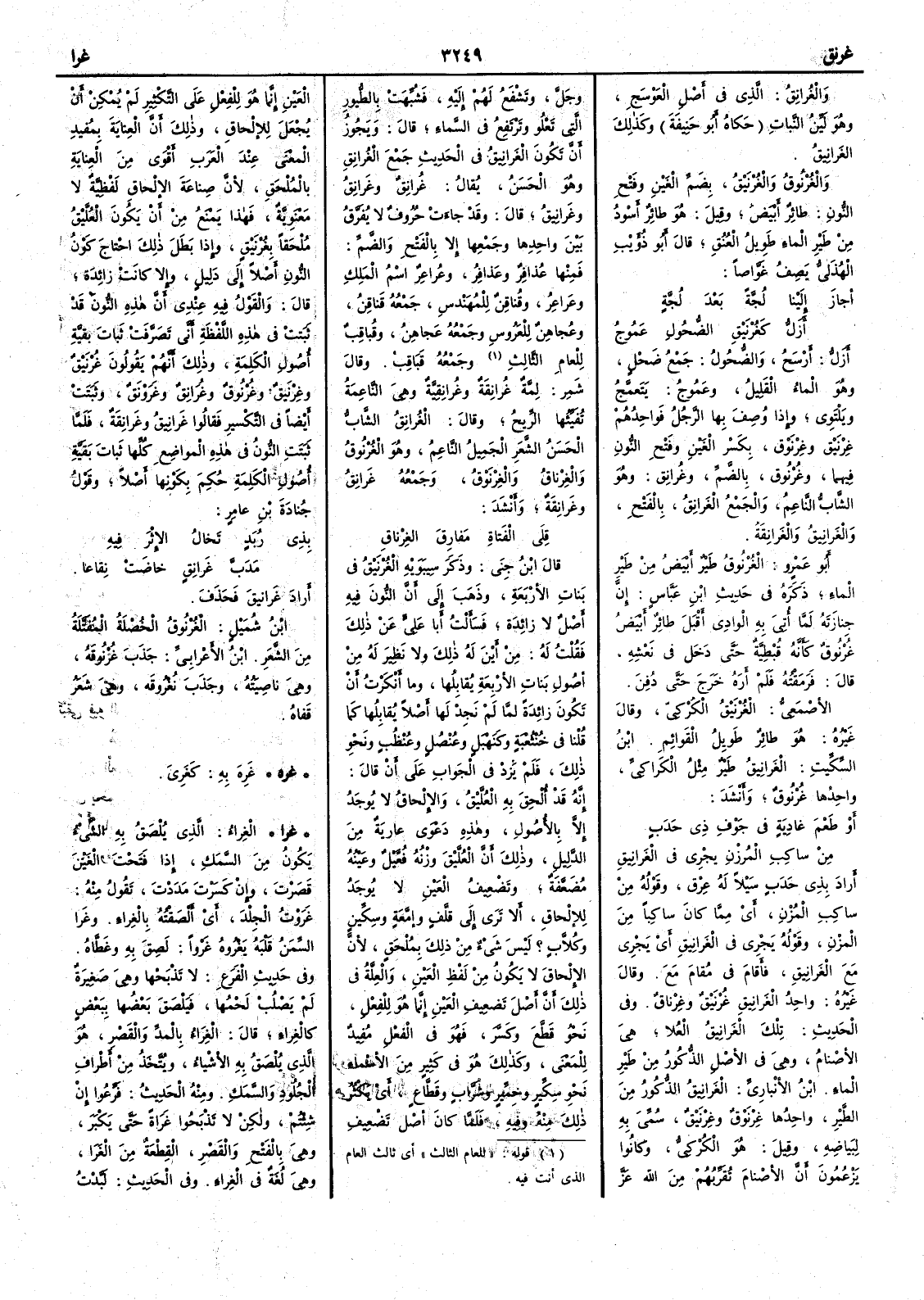 والغُرانِقُ الذي في أصل العَوْسَج وهو لَيِّن النَّبات حكاه أَبو حنيفة وكذلك الغَرانِيق والغُرْنُوق والغُرْنَيْق بضم الغين وفتح النون طائر أَبيض وقيل هو طائر أَسود من طير الماء طويل العُنُق قال أَبو ذَؤَيب الهذلي يصف غوّاصاً أجاز إلينا لُجَّةً بعد لُجّةٍ أزَلَّ كغُرْنَيْق الضُّحُول عَمُوجُ أَزَلَّ أَرْسَح والضُّحُول جمع ضَحْل وهو الماء القليل وعَمُوج يَتَعَمَّج ويلتوي وإذا وصف بها الرجل فواحدهم غِرْنَيق وغِرْنَوْق بكسر الغين وفتح النون فيهما وغُرْنوق بالضم وغُرانِق وهو الشابُّ الناعم والجمع الغَرانِق بالفتح والغَرانِيق والغَرانِقةُ أَبو عمرو الغُرْنُوق طير أَبيض من طير الماء ذكره في حديث ابن عباس إن جنازته لما أُتِيَ به الوادي أَقبل طائر أَبيض غُرْنوق كأنه قُبْطِيّة حتى دخل في نعشه قال فرَمَقْتُه فلم أَرَهُ خرج حتى دفن الأصمعي الغُرْنَيْق الكُرْكيّ وقال غيره هو طائر طويل القوائم ابن السكيت الغَرانِيقُ طير مثل الكَراكي واحدها غُرْنوق وأَنشد أَو طَعْم غاديةٍ في جَوْف ذي حَدَبٍ من ساكِبِ المُزْن يجْري في الغَرانِىقِ أَراد بذي حَدَب سيلاً له عِرْق وقوله من ساكب المُزْن أي مما كان ساكباً من المزن وقوله يجري في الغرانيق أي يجري مع الغرانيق فأَقام في مقام مع وقال غيره واحد الغَرانِيقُ غُرْنَيْق وغِرْناق وفي الحديث تلك الغَرانِيقُ العُلا هي الأَصنام وهي في الأصل الذكور من طير الماء ابن الأنباري الغعرانيق الذكور من الطير واحدها غِرْنَوْق وغِرْنَيْق سمي به لبياضه وقيل هو الكُرْكيّ وكانوا يزعمون أن الأصنام تقرّبهم من الله عز وجل وتشفع لهم إليه فشبهت بالطيور التي تعلو وترتفع في السماء قال ويجوز أن تكون الغَرانيقُ في الحديث جمع الغُرانق وهو الحسن يقال غُرانِق وغَرانِق وغَرانِيق قال وقد جاءت حروف لا يفرق بين واحدها وجمعها إلا بالفتح والضم فمنها عُذَافر وعَذافر وعُراعر اسم الملِك وعَراعر وقُناقِن للمهندس جمعه قَناقن وعُجاهن للعَرُوس وجمعه عَجاهن وقُبَاقب للعام الثالث