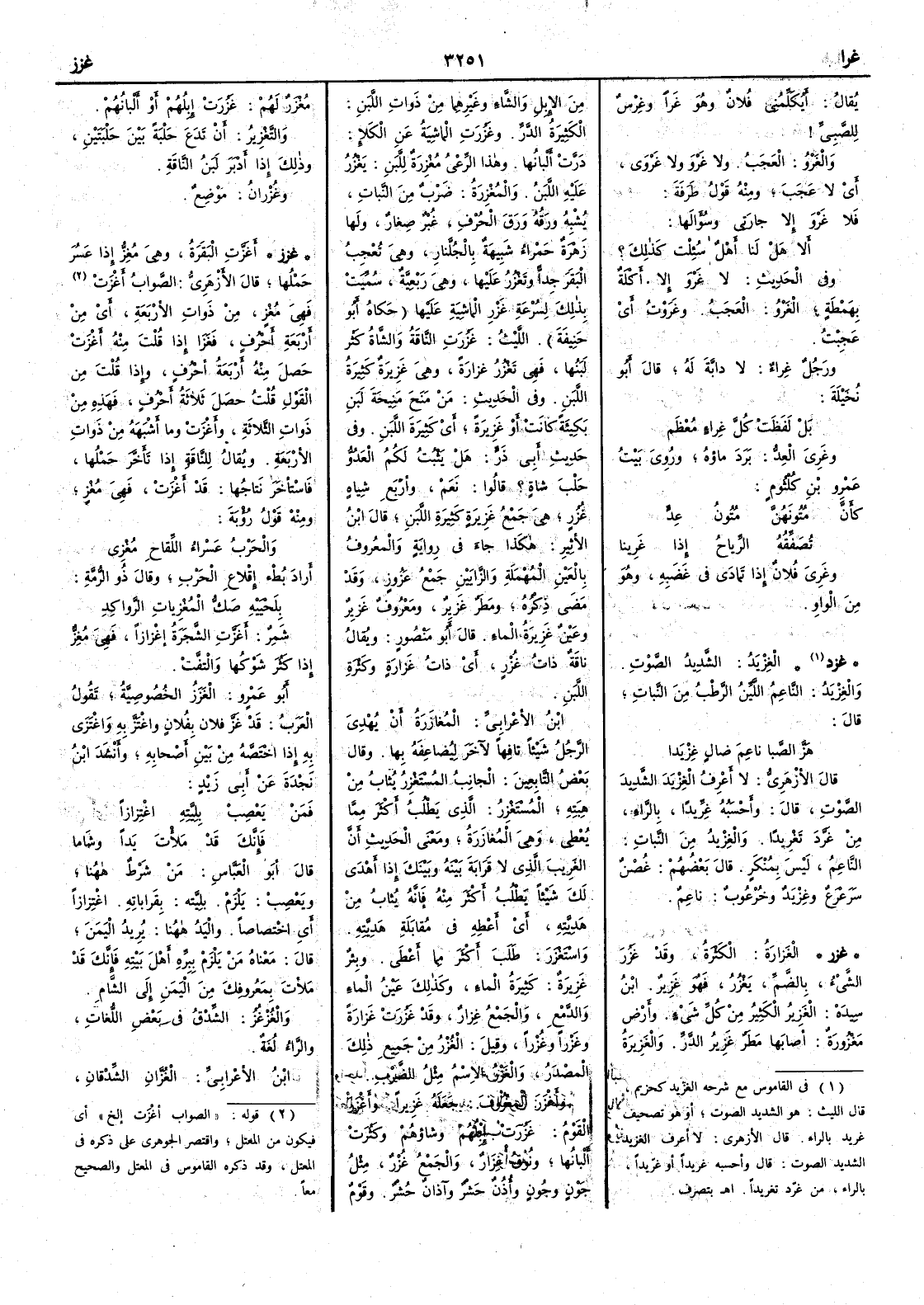 ( غزر ) الغَزارةُ الكثرة وقد غَزُرَ الشيء بالضم يَغْزُر فهو غَزِيرٌ ابن سيده الغَزِيرُ الكثير من كل شيء وأَرض مغزورةٌ أَصابها مطرٌ غَزِيرُ الدَّرِّ والغزِِيرة من الإِبل والشاء وغيرهما من ذوات اللبن الكثيرةُ الدَّرِّ وغَزُرَت الماشيةُ عن الكلإِ دَرَّت أَلبانُها وهذا الرِّعْيُ مُغْزِرةٌ للّبن يَغزُر عليه اللبن والمُغْزِرة ضرْبٌ من النبات يُشْبِه ورَقُه وَرَقَ الحُرْف غُبْرٌ صغار ولها زهرة حمراء شبيهة بالجُلَّنار وهي تعجب البقر جِدًّا وتَغْزُر عليها وهي ربْعيَّة سميت بذلك لسرعة غَزْرِ الماشية عليها حكاه أَبو حنيفة الليث غَزُرَت الناقةُ والشاة كثُرَ لبنُها فهي تَغْزُرُ غَزارةً وهي غَزِيرة كثيرة اللبن وفي الحديث مَنْ مَنَحَ مَنيحةَ لَبَنٍ بَكِيئةً كانت أَو غَزِيرةً أَي كثيرة اللبن وفي حديث أَبي ذر هل يَثْبُت لكم العَدُوُّ حَلْبَ شاةٍ ؟ قالوا نعم وأَرْبَعِ شِيَاهٍ غُزرٍ هي جمع غَزِيرة كثيرة اللبن قال ابن الأَثير هكذا جاء في رواية والمعروف بالعين المهملة والزايين جمع عزوز وسيأْتي ذكره ومطر غَزِيرٌ ومعروف غَزِيرٌ وعينٌ غَزيرة الماء قال أَبو منصور ويقال ناقة ذات غُزْرٍ أَي ذات غزارةٍ وكثرة اللبن ابن الأَعرابي المُغازَرةُ أَن يُهْدِيَ الرجلُ شيئاً تافِهاً لآخر ليُضاعِفَه بها وقال بعض التابعين الجانبُ المُسْتَغْزِرُ يثاب من هبته المُسْتَغْزِرُ الذي يطلب أَكثر مما يعطي وهي المُغازَرة ومعنى الحديث أَن الغَريب الذي لا قرابة بينه وبينك إِذا أَهدى لك شيئاً يطلب أَكثر منه فإِنه يثاب منْ هَدِيّتهِ أَي أَعْطِه في مقابلة هديته واسْتَغْزَرَ طلب أَكثر مما أَعطى وبئر غَزِيرة كثيرة الماء وكذلك عين الماء والدمع والجمع غِزارٌ وقد غَزُرَت غَزارةً وغَزْراً وغُزْراً وقيل الغُزْرُ من جميع ذلك المصدر والغَزْرُ الاسم مثل الضَّرْب وأَغزَرَ المعروفَ جعله غَزيراً وأَغْزَرَ القومُ غَزُرَت إِبلُهم وشاؤُهم وكثرت أَلبانها ونوق غِزَار والجمع غَزْر مثل جَوْن وجُون وأُذن حَشْرٌ وآذانٌ حُشْرٌ وقومٌ مُغْزَرٌ لهم غزُرت إِبلُهم أَو أَلْبانُهم والتَّغْزِير أَن تَدَعَ حَلْبة بين حَلْبتين وذلك إِذا أَدبَر لبنُ الناقةِ وغُزْران موضع
