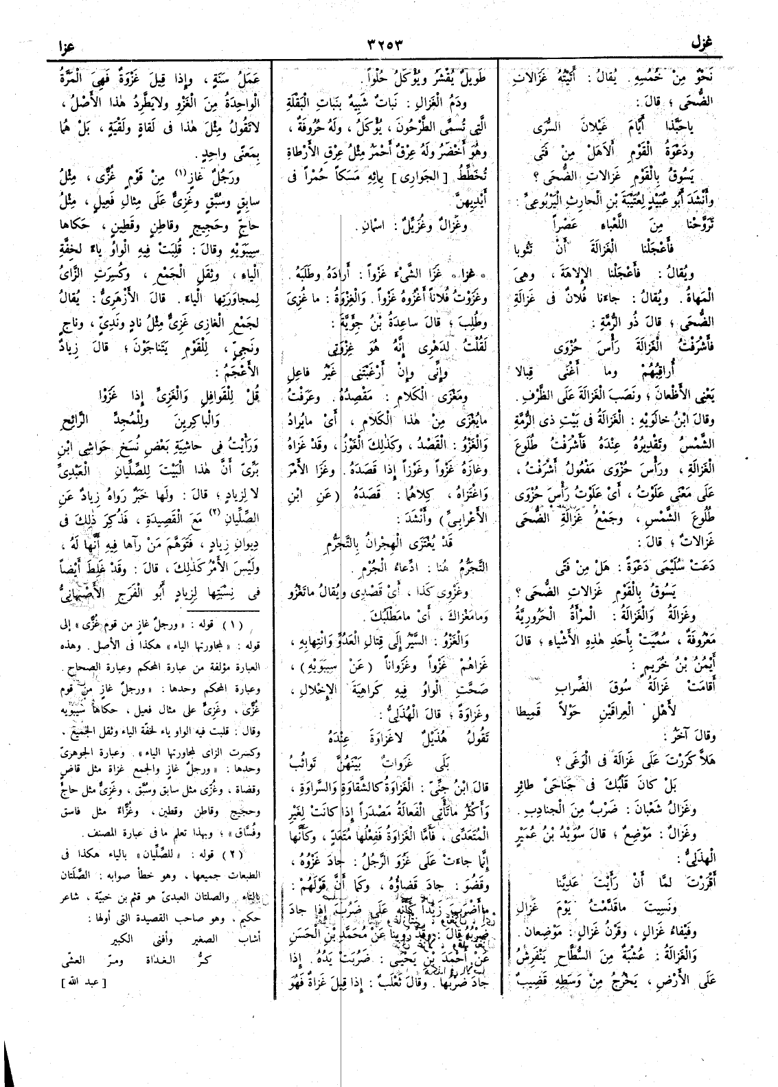 نحوٌ من خُمُسِه يقال أَتيتُه غَزالاتِ الضُّحى قال يا حَبَّذا أَيامَ غَيْلانَ السُّرى ودَعْوةُ القوم أَلا هل مِنْ فتًى يَسُوق بالقوم غَزالاتِ الضحى ؟ وأَنشد أَبو عبيد لعُتَيبة بن الحرث اليربوعي تَرَوَّحْنا من اللَّعْباءِ عَصْراً فأَعْجَلْنا الغَزالةَ أَن تَؤُوبا ويقال فأَعجلنا الإِلاهةَ وهي المَهاة ويقال جاءنا فُلان في غَزالةِ الضحى قال ذو الرمة فأَشرفْتُ الغزالةَ رأْسَ حُزْوى أَراقِبُهم وما أغنى قِبالا يعني الأَظْعانَ ونصب الغزالة على الظرف وقال ابن خالويه الغزالة في بيت ذي الرمة الشمس وتقديرُه عنده فأَشرفتُ طلوعَ الغَزالةِ ورأْس حُزْوى مفعول أَشْرَفْت على معنى علَوْت أَي علوت رأْس حزوى طلوع الشمس وجمعُ غَزالةِ الضحى غَزالاتٌ قال دَعَتْ سُلَيْمى دَعْوَةً هل مِنْ فَتًى يَسُوقُ بالقوم غَزالاتِ الضُّحى ؟ وغَزالةُ والغَزالةُ المرأَة الحَرُوريّة معروفة سميت بأَحد هذه الأَشياء قال أَيْمُنُ بن خُرَيم أَقامَت غَزالةُ سُوقَ الضِّراب لأَهْلِ العِراقَيْن حَوْلاً قَمِيطا وقال آخر هلاَّ كَرَرْتَ على غَزالَة في الوَغى ؟ بل كان قَلْبُك في جَناحَيْ طائر وغَزالُ شَعْبانَ ضربٌ من الجنادب وغَزالٌ موضع قال سويد بن عمير الهذلي أَقْرَرْت لمَّا أَن رأَيت عَدِيَّنا ونَسِيت ما قدّمْت يومَ غَزالِ وفَيْفاء غَزالٍ وقَرْنُ غزال موضعان والغَزالةُ عُشْبة من السُّطَّاح ينفرش على الأَرض يخرج من وسطه قضيب طويل يُقْشَر ويؤكل حلواً ودمُ الغَزال نبات شبيه بنبات البقلة التي تسمى الطَّرْخُون يؤكل وله حُروفة وهو أَخضر وله عِرق أَحمر مثل عرق الأَرْطاة تخطِّط بمائه مَسَكاً حُمْراً في أَيديهن وغَزال وغُزَيّل اسمان ( غزا ) غَزَا الشيءَ غَزْواً أَرادَه وطَلَبَه وغَزَوت فُلاناً أَغْزُوه غَزْواً والغِزْوَة ما غُزِي وطُلِبَ قال ساعدة بن جُؤية لَقُلْتُ لدَهْرِي إِنه هو غِزْوَتي وإِنِّي وإِن أَرْغَبْتَني غيرُ فاعِلِ ومَغْزَى الكلام مَقْصِدُه وعَرفْتُ ما يُغْزَى من هذا الكلام أَي ما يُرادُ والغَزْوُ القَصْدُ وكذلك الغَوْزُ وقد غَزاهُ وغازَهُ غَزْواً وغَوْزاً إِذا قَصَدَه وغَزَا الأَمرَ واغْتَزاه كلاهما قَصَدَه عن ابن الأَعرابي وأَنشد قد يُغْتَزَى الهِجْرانُ بالتَّجَرُّمِ التَّجَرُّمُ هنا ادِّعاءُ الجُرْم وغَزْوِي كذا أَي قَصْدِي ويقال كا تَغْزو وما مَغزاك أَي ما مَطْلَبُك والغَزْوُ السيرُ إِلى قِتالِ العَدُوِّ وانْتِهابه غَزاهُم غَزْواً وغَزَواناً عن سيبويه صحت الواو فيه كراهِية الإِخلالِ وغَزواةً قال الهذلي تقولُ هُذَيْلٌ لا غَزاوة عندَه بَلَى غَزَواتٌ بَينَهُنّ تَواثُبُ قال ابن جني الغَزاوة كالشَّقاوة والسَّراوَةِ وأَكثرُ ما تأْتي الفَعالةُ مصدراً إِذا كانت لغيرِ المُتَعَدِّي فأَكما الغَزاوة ففِعْلُها مُتَعَدٍّ وكأَنها إِنما جاءت على غَزُوَ الرجلُ جاد غَزْوُه وقَضُوَ جادَ قضاؤُه وكما أَن قَوْلَهم ما أَضْرَبَ زيداً كأَنه على ضَرُبَ إِذا جادَ ضَرْبُه قال وقد رُوِينا عن محمد بن الحسن عن أَحمدَ بن يحيى ضَرُبَتْ يَدُهُ إِذا جاد ضَرْبُها وقال ثعلب إِذا قيل غَزاةٌ فهو عَمَلُ سنَةٍ وإِذا قيل غَزْوَةٌ فهي المَرَّةُ الواحدة من الغَزْوِ ولا يَطَّرِدُ هذا الأَصل لا تقول مثلَ هذا في لَقاةٍ ولَقْيَةٍ بل هما بمعنًى واحد ورجل غازٍ من قوم غُزًّى مثل سابقٍ وسُبَّقٍ وغَزِيّ على مثال فَعِيلٍ مثل حاجٍّ وحَجِيجٍ وقاطِنٍ وقَطِينٍ حكاها سيبويه وقال قلبت فيه الواو ياءً لخفة الياء وثقل الجمع وكسرت الزاي لمجاورتها الياء قال الأَزهري يقال لجمع الغازِي غَزِيٌّ مثل نادٍ ونَدِيٍّ وناجٍ ونَجِيٍّ للقوم يَتَناجَوْنَ قال زياد الأَعجم قُلْ للقَوافِلِ والغَزِيِّ إِذا غَزَوْا والباكِرين وللمُجِدِّ الرائِحِ ورأَيتُ في حاشية بعض نسخ حواشي ابن بري أَنَّ هذا البيت للصِّلِّيان العَبْدِي لا لزِياد قال ولها خبر رواه زياد عن الصِّلِّيان مع القصيدة فذُكِر ذلك في ديوان زياد فتَوهَّم من رآ