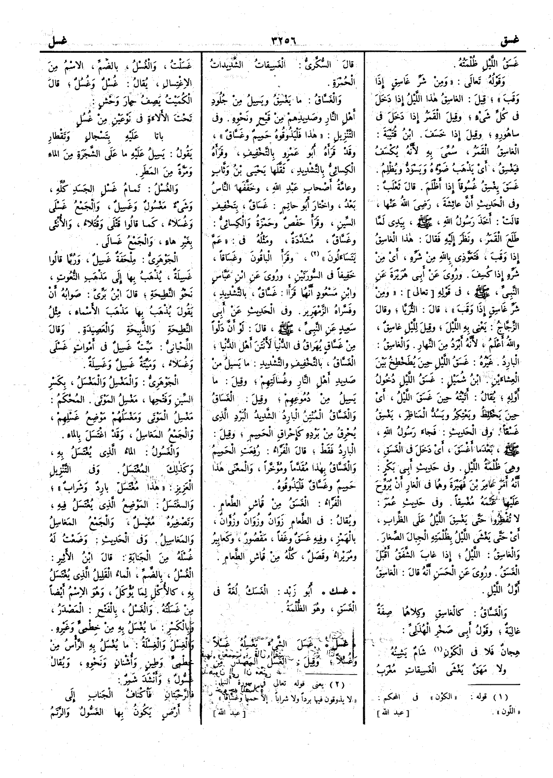 غَسَقُ الليل ظلمته وقوله تعالى ومن شر غاسِقٍ إذا وَقَبَ قيل الغاسِقُ هذا الليل إذا دخل في كل شيء وقيل القمر إذا دخل في ساهورِه وقيل إذا خَسَفَ ابن قتيبة الغاسِقُ القمر سمي به لأنه يُكْسَفُ فيَغْسِقُ أي يذهب ضوءُه ويسودّ ويُظلم غَسَقَ يَغْسِقُ غُسوقاً إذا أَظلم قال ثعلب وفي الحديث أن عائشة رضي الله عنها قالت أَخذ رسول الله صلى الله عليه وسلم بيدي لما طلع القمر ونظر إليه فقال هذا الغاسِقُ إذا وَقَبَ فتعوَّذي بالله من شره أي من شره إذا كُسِفَ وروي عن أَبي هريرة عن النبي صلى الله عليه وسلم في قوله ومن شر غاسِقٍ إذا وَقَبَ قال الثُّرَيّا وقال الزجاج يعني به الليل وقيل لِلَّيل غاسِقٌ والله أعلم لأنه أَبرد من النهار والغاسِق البارد غيره غَسَقُ الليل حين يُطَخْطِخُ بين العشاءين ابن شميل غَسَقُ الليل دخول أَوَّله يقال أَتيته حين غَسَق الليل أي حين يختلط ويعتكر ويسدّ المَناظرَ يغْسِقُ غَسْقاً وفي الحديث فجاء رسول الله صلى الله عليه وسلم بعدما أَغْسَقَ أي دخل في الغَسَق وهي ظلمة الليل وفي حديث أبي بكر أَنه أَمر عامر بن فُهَيْرة وهما في الغار أَن يُرَوِّح عليهما غنمه مُغْسِقاً وفي حديث عمر لا تفطروا حتى يَغْسِق الليل على الظِّراب أي حتى يغشى الليل بظلمته الجبال الصغار والغاسِقُ الليل إذا غاب الشفق أَقبل الغَسَقُ وروي عن الحسن أَنه قال الغاسِقُ أَول الليل والغَسَّاقُ كالغاسِقِ وكلاهما صفة غالبة وقول أبي صخر الهذلي هِجانٌ فَلا في الكَوْنِ شَامٌ يَشِينُهُ ولا مَهَقٌ يَغْشى الغَسِيقاتِ مُغْرَبُ قال السكري الغَسِيقاتُ الشديدات الحمرة والغَسَّاق ما يَغْسِقُ ويسيل من جلود أَهل النار وصديدهم من قيح ونحوه وفي التنزيل هذا فليذوقوه حَميم وغَساقٌ وقد قرأَه أَبو عمرو بالتخفيف وقرأَه الكسائي بالتشديد ثقلها يحيى بن وَثَّاب وعامة أَصحاب عبد الله وخففها الناس بعد واختار أَبو حاتم غَساق بتخفيف السين وقرأَ حفص وحمزة والكسائي وغَسَّاق مشدَّدة ومثله في عَمَّ يتساءلون وقرأَ الباقون وغَسَاقاً خفيفاً في السورتين وروي عن ابن عباس وابن مسعود أَنهما قرآ غَسّاق وبالتشديد وفسَّراه الزَّمْهَرِير وفي الحديث عن أبي سعيد عن النبي صلى الله عليه وسلم قال لو أن دَلْواً من غَساق يُهَراقُ في الدنيا لأَنْتَنَ أَهل الدنيا الغَساق بالتخفيف والتشديد ما يسيل من صَدِيد أَهل النا وغُسالتهم وقيل ما يسيل من دموعهم وقيل الغَسَاق والغَسَّاق المنتن البارد الشديد البرد الذي يُحْرِقُ من برده كإحراق الحميم وقيل البارد فقط قال الفراء رُفِعَت الحَمِيمُ والغَسَّاقُ بهذا مقدَّماً ومؤخراً والمعنى هذا حَميم وغَسَّاق فليذوقوه الفراء الغَسَق من قُماشِ الطَّعام ويقال في الطَّعام زَوَانٌ وزُوَانٌ وزُؤَانٌ بالهمز وفيه غَسَقٌ وغَفاً مقصور وكَعابِير ومُرَيْراء وقَصَلٌ كلُّه من قُماش الطَّعام