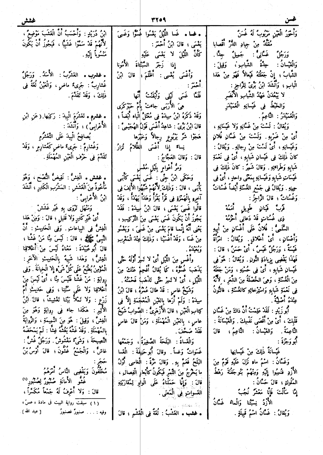 وأَحْوَرُ العينَ مَرْبُوبٌ له غُسَنٌ مُقَلَّدٌ من جيادِ الدُّرِّ أَقْصابا ورجل غَسَانيٌّ جميلٌ جدّاً والغَيْسان حِدَّة الشباب وقيل الشبابُ إن جعلته فَيْعالاً فهو من هذا الباب وأَنشد ابن بري للراجز لا يَبْعُدَنْ عَهْدُ الشَّبابِ الأَنْضَرِ والخَبْطُ في غَيْسانِه الغَمَيْدَرِ والغَمَيْدَرُ الناعم ويقال لستَ من غَسَّانه ولا غَيْسَانِه أَي من ضَرْبِه ولستَ من غَسَّانِ فلان وغَيْسانِه أَي لست من رجاله ويقال كان ذلك في غَيْسانِ شبابه أَي في نَعْمَةِ شبابه وطَراءتِه وقال شمر كان ذلك في غَيْسَاتِ شبابه وغَيْسانِه بمعنى واحدٍ أَي في حِينه ويقال في جمع الغُسْنَة أَيضاً غُسْناتٌ وغُسُنات قال الراجز فَرُبَّ فَيْنانٍ طَويلٍ أَمَمُهْ ذِي غُسُناتٍ قد دَعاني أَحْزُمُهْ السُّلَميُّ فلان على أَغْسانٍ من أَبيه وأَعْسَانٍ أَي أَخلاق ويقال امرأَة غَيْسَة ورجل غَيْسٌ أَي حَسَنٌ قال فهذا يقضي بزيادة النون ويقال هو في غَيْسان شَبابه أَي في حُسْنه ومن جعله من الغُسْنة وهي الخُصْلةُ من الشعر لأَنه في نَعْمَةِ شَبابه واسترخائه كالغُسْنَةِ فالنون عنده أَصلية أَبو زيد لقد علمتُ أَنَّ ذاك من غَسَّانِ قلبك أَي من أَقصى نفسك والغَيْسَانة الناعمة والغَيْسانُ الناعم قال أَبو وَجْزَة غَيْسَانَةٌ ذلك من غَيْسانِها وغَسَّانُ اسم ماء نزل عليه قوم من الأَزْدِ فنُسِبُوا إليه ومنهم بنو جَفْنَة رَهْطُ المُلوكِ قال حسان إما سأَلتَ فإِنا مَعْشَرٌ نُجُبٌ الأَزْدُ نِسْبَتُنا والماء غَسَّانُ ويقال غَسَّان اسم قبيلة ( غسا ) غَسا الليلُ يَغْسُو غُسُوًّا وغَسِيَ يَغْسى قال ابن أَحمر كأَنّ الليلَ لا يَغْسى عَليه إِذا زَجَر السَّبَنْتاةَ الأَمُونا وأَغْسى يُغْسي أَظْلَم قال ابن أَحمر فلما غَسى لَيْلي وأَيْقَنْتُ أَنَّها هي الأُرَبى جاءَت بأُمِّ حَبَوْكَرى وقد ذكره ابن سيده في معتل الياء أَيضاً قال ابن بري شاهدُ أَغْسَى قول الهجيمي هَجَوْا شَرَّ يَرْبوعٍ رجالاً وخَيْرَها نِساءً إِذا أَغْسى الظلامُ تُزارُ قال وقال العجاج ومرّ أَعْوام بلَيْلٍ مُغْسِ وحكى ابنُ جنِّي غَسى يَغْسى كأَبى يأْبى قال وذلك لأَنهم شَبَّهوا الأَلفَ في آخِره بالهمزة في قَرَأَ يقْرأُ وهَدَأَ يَهْدَأُ وقد قالوا غَسِيَ يَغْسى قال ابن سيده فقَدْ يجوز أَن يكون غَسى يَغْسى من التركيب يعني أَنه إِنما قامَ يَغْسى من غَسِيَ ويَغْسُو من غَسا وقد أَغْسَيْنا وذلك عند المغرب وبُعَيْده وأَغْسِ من اللَّيْل أَي لا تَسِرْ أَوَّله حتى يذهَبَ غُسُوُّه كما يقال أَفْحِمْ عنك من اللَّيْلِ أَي لا تَسِرْ حتى تَذْهب فَحْمَتُه وشيخٌ غاسٍ قد طالَ عُمْرُه قال ابن سيده ولم أَرَها بالغين المعجمة إِلاَّ في كتاب العين قال الأَزهري الصواب شيخٌ عاسٍ بالعين المهملة ومن قال غاسٍ فقد صحَّف والغَساةُ البَلَحة الصَّغيرةُ وجمعها غَسَواتٌ وغَساً وقال أَبو حنيفة الغَسا البَلَح فعَمَّ به وقال مَرَّةً الغاسِي أَوْلُ ما يخرُجُ من التَّمْرِ فيكون كأَبْعارِ الفِصالِ قال وإنما حملناه على الواو لمقارَبَتِهِ الغَسواتِ في المعنى ( غشب ) الغَشْبُ لغة في الغَشْم قال ابن دريد وأَحسب أَن الغَشَبَ موضع لأَنهم قد سَمَّوْا غَشَبِيّاً فيجوز أَن يكون منسوباً إِليه