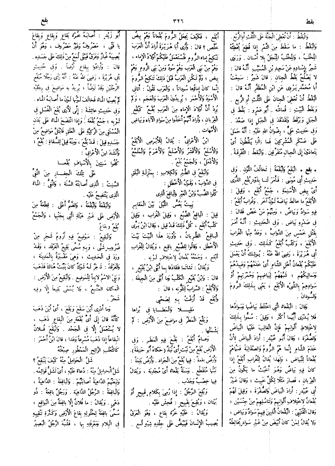 ( بقع ) البَقَعُ والبُقْعةُ تَخالُفُ اللَّوْنِ وفي حديث أَبي موسى فأَمر لنا بذَوْذٍ بُقْعِ الذُّرَى أَي بيض الأَسنمة جمع أَبْقع وقيل الأَبقع ما خالَط بياضَه لونٌ آخر وغُراب أَبقع فيه سواد وبياض ومنهم من خص فقال في صدره بياض وفي الحديث أَنه أَمر بقتل خمس من الدوابّ وعَدَّ منها الغُرابَ الأَبْقَعَ وكَلْب أَبْقَع كذلك وفي حديث أَبي هريرة رضي الله عنه يُوشِكُ أَن يَعْمَلَ عليكم بُقْعانُ أَهل الشام أَي خدَمُهم وعَبِيدُهم وممالِيكُهم شبَّههم لبَياضهم وحُمْرتهم أَو سوادهم بالشيء الأَبْقَع يعني بذلك الرُّوم والسُّودان وقال البَقْعاء التي اختلطَ بياضها وسوادها فلا يُدْرَى أَيُّهما أَكثر وقيل سُمُّوا بذلك لاختلاط أَلوانهم فإِنَّ الغالب عليها البياضُ والصُّفرة وقال أَبو عبيد أَراد البياض لأَنَّ خدم الشام إِنما هم الروم والصَّقالِية فسماهم بُقْعاناً للبياض ولهذا يقال للغراب أَبْقَعُ إِذا كان فيه بياض وهو أَخْبَثُ ما يكون من الغربان فصار مثلاً لكل خَبِيث وقال غير أَبي عبيد أَراد البياض والصفرة وقيل لهم بُقعان لاختلاف أَلوانهم وتَناسُلِهم من جنسين وقال القُتَيْبي البقعان الذين فيهم سواد وبياض ولا يقال لمن كان أَبيض من غير سواد يخالطه أَبْقع فكيف يَجعل الرومَ بقعاناً وهم بَيض خُلَّص ؟ قال وأُرَى أَبا هريرة أَراد أَن العرب تَنْكِحُ إِماءَ الرُّوم فتُستعْمَل عليكم أَولادُ الإِماء وهم من بَني العرب وهم سُود ومن بني الروم وهم بِيض ولم تكن العرب قبل ذلك تَنكِح الرُّوم إِنما كان إِماؤُها سُوداناً والعرب تقول أَتاني الأَسود والأَحمر يريدون العرب والعجم ولم يرد أَنَّ أَولاد الإِماء من العرب بُقْع كبُقْعِ الغِربانِ وأَراد أَنهم أَخذوا من سواد الآباء وبياض الأُمَّهات ابن الأَعرابي يقال للأَبرص الأَبقع والأَسْلَع والأَقْشَر والأَصْلَخ والأَعْرَم والمُلَمَّعُ والأَذْمَلُ والجمع بُقْع والبَقَعُ في الطير والكلاب بمنزلة البَلَقِ في الدوابّ وقول الأَخطل كُلُوا الضَّبَّ وابنَ العَيْرِ والباقِع الذي يَبِيتُ يَعُسُّ الليلَ بينَ المَقابِرِ قيل الباقِعُ الضَّبُع وقيل الغراب وقيل كَلب أَبْقع كلُّ ذلك قد قيل وقال ابن بري الباقِعُ الظَّرِبانُ وأَورد هذا البيتَ بيتَ الأَخطل وقالوا للضبع باقِع ويقال للغراب أَبْقع وجمعه بُقْعان لاختلاف لونه ويقال تَشاتَما فتَقاذَفا بما أَبقى ابن بُقَيْعٍ قال وابن بُقَيْع الكلب وما أَبقى من الجِيفة والأَبقعُ السَّرابُ لتلَوُّنه قال وأَبْقَع قد أَرَغْتُ به لِصَحْبي مَقِيلاً والمَطايا في بُراها وبَقَّع المطرُ في مواضع من الأَرض لم يَشْمَلْها وعام أَبْقَع بَقَّع فيه المطر وفي الأَرض بُقَع من نَبْت أَي نُبَذٌ حكاه أَبو حنيفة وأَرض بقِعة فيها بُقَع من الجَراد وأَرض بَقِعة نبتها مُتَقطع وسَنة بَقْعاء أَي مُجْدِبة ويقال فيها خِصْب وجَدْب وبُقِعَ الرجل إِذا رُميَ بكلام قَبِيح أَو بُهْتان وبُقِع بقَبِيح فُحِشَ عليه ويقال عليه خُرْءُ بِقاع وهو العَرَقُ يُصِيب الإِنسانَ فيَبْيَضُّ على جلده شبه لُمَعٍ أَبو زيد أَصابه خُرء بَقاعِ وبِقاعٍ وبِقاعَ يا فتى مصروف وغير مصروف وهو أَن يصيبه غبار وعرَقٌ فيبقى لُمَعٌ من ذلك على جسده قال وأَرادوا ببقاع أَرضاً وفي حديث أَبي هريرة رضي الله عنه أَنه رأَى رجلاً مُبَقَّع الرجلين وقد توَضّأَ يريد به مواضع في رجليه لم يُصِبها الماء فحالف لونُها لونَ ما أَصابه الماء وفي حديث عائشة إِني لأَرى بُقَعَ الغسل في ثوبه جمع بُقْعة وإِذا انْتَضح الماء على بدن المُسْتَقِي من الرَّكيَّةِ على العَلَقِ فابتَلَّ مواضعُ من جسده قيل قد بَقَّعَ ومنه قيل للسُّقاة بُقْعٌ وأَنشد ابن الأَعرابي كُفُوا سَنِتِين بالأَسْيافِ بُقْعاً على تِلْكَ الجِفارِ مِنَ النَّفِيِّ السَّنِتُ الذي أَصابته السنة والنَّفِيُّ الماء الذي يَنْتضِحُ عليه البَقْعةُ والبُقْعةُ والضم أَعْلى قِطْعة من الأَرض على غير هيئة التي بجَنبها والجمع 