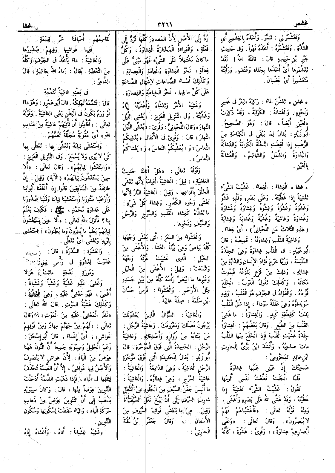 ( غشن ) تَغَشَّنَ الماءُ رَكِبَه البَعَرُ في غَدير ونحوه والغُشانة الكُِرَابة وقد ذكرت بالعين أَيضاً قال وهو الصحيح أَبو زيد يقال لما يبقى في الكِبَاسَة من الرُّطَب إذا لُقِطَتْ النخلة الكُِرَابة والغُشانة والبُذارة والشَّمَلُ والشُّماشِمُ والعُشانة بالعين ( غشا ) الغِشاءُ الغِطاءُ غَشَّيْت الشيءَ تَغْشِية إِذا غَطَّيْته وعلى بَصَره وقَلْبِه غَشْوٌ وغَشْوةٌ وغُشْوة وغِشْوة وغِشاوةٌ وغَشَاوَة وغُشاوةٌ وغاشِيةٌ وغُشْية وغُشاية وغِشايةٌ هذه الثلاث عن اللحياني أَي غِطاءٌ وغاشِية القَلْب وغِشاوتُه قَمِيصُه قال أَبو عبيد في القَلْبِ غِشاوةٌ وهي الجِلْدة المُلْبَسة وربما خرج فؤادُ الإِنسانِ والدابَّة من غِشائه وذلك من فَزَعٍ يَفْزَعه فيموتُ مكانه وكذلك تقول العرب أَنْخَلَعَ فؤادُه والفؤادُ في الجَوْفِ هو القَلْبُ وفيه سُوَيداؤه وهي عَلَقةٌ سَوْداءُ إِذا شُقَّ القَلْبُ بَدَتْ كقِطْعة كَبِدٍ والغِشاوةُ ما غَشِيَ القَلْبَ من الطَّبَع وقال بعضهم الغِشاوةُ جِلْدةٌ غُشِّيَتِ القَلْبَ فإِذا انْخَلَعَ منها القَلْب ماتَ صاحبُه وأَنشد ابن بري للحرث بن خالد المخزومي صَحِبْتُكَ إِذْ عَيْني عليها غِشاوةٌ فلمّا انْجَلَتْ قَطَّعْتُ نَفْسي أَلُومُها تقول غَشَّيْت الشيءَ تَغْشِيةً إِذا غَطَّيْته وقد غَشَّى اللهُ على بَصَرِه وأَغْشى ومنه قوله تعالى فأَغْشَيْناهم فهم لا يُبْصِرُون وقال تعالى وعلى أَبْصارِهِمْ غِشاوةٌ وقرئ غَشْوة كأَنه رُدَّ إِلى الأَصل لأَن المصادر كلها تردّ إِلى فَعْلة والقراءة المختارة الغِشاوة وكل ما كان مشتملاً على الشيء فهو مبنيٌّ على فِعالَةٍ نحو الغِشاوةِ والعِمامة والعِصابة وكذلك أَسماءُ الصِّناعاتِ لاشْتِمالِ الصِّناعةِ على كلِّ ما فيها نحو الخِياطة والقِصارةِ وغَشِيَه الأَمْرُ وتغَشَّاه وأَغْشَيْته إِيَّاه وغَشَّيْته وفي التنزيل العزيز يُغْشِي الليلَ النهارَ وقال اللحياني وقرئ يُغَشِّي الليلَ النهارَ قال وقرئ في الأَنْفال يُغْشِيكُم النُّعاسَ ويُغَشِّكم النعاسَ ويَغْشاكُم النُّعاسُ وقوله تعالى هل أَتاكَ حديث الغاشِيَة قيل الغاشِيَة القيامة لأَنها تَغْشى الخَلْق بأَفْزاعِها وقيل الغاشِية النارُ لأَنَّها تَغْشى وجُوه الكُفَّار وغِشاءُ كلِّ شيءٍ ما تَغَشَّاه كغِشاءِ القَلْب والسَّرْجِ والرَّحْلِ والسَّيْفِ ونحوِها والغَشْواءُ من المَعَزِ التي يَغْشى وجْهَها كلَّه بياضٌ وهي بَيِّنةُ الغَشا والأَغْشى من الخَيْلِ الذي غَشِيَتْ غُرَّتُه وجْهَه واتَّسَعَتْ وقيل الأَغْشى من الخَيْلِ وغيرها ما ابْيَضَّ رأْسُه كلُّه من بَيْنِ جَسدِه مثل الأَرْخَمِ والغَشْواءُ فَرَس حَسَّانَ ابنِ سَلَمة صِفةٌ غالِبة والغاشِيةُ السُّؤَّالُ الذين يَغْشَوْنَكَ يَرْجُون فَضْلَكَ ومَعْرُوفَكَ وغاشِية الرجُلِ مَنْ يَنْتابُه من زُوَّارِه وأَصْدقائه وغاشِيةُ الرَّحْلِ الحَديدة التي فوقَ المؤخرَةِ قال أَبو زيد يقال للحديدة التي فوق مؤخِرَةِ الرَّحْلِ الغاشِية وهي الدامِغة والغاشية غاشية السَّرْج وهي غِطاؤه والغاشِية ما أُلْبِسَ جَفْنُ السَّيْفِ من الجُلودِ من أَسْفلِ شاربِ السَّيفِ إِلى أَن يَبْلُغَ نَعْلَ السَّيْفِ وقيل هي ما يَتَغَشَّى قوائِمَ السُّيوفِ من الأَسْفانِ