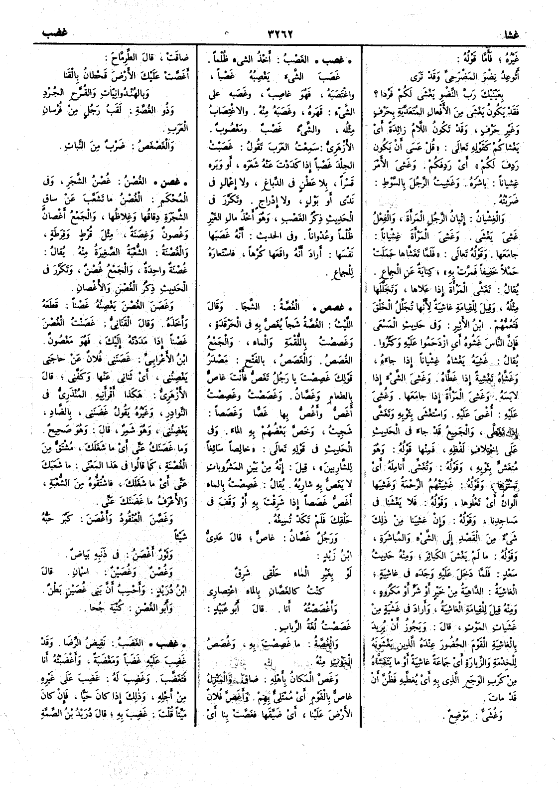 ( غصب ) الغَصْبُ أَخْذُ الشيءِ ظُلْماً غَصَبَ الشيءَ يَغْصِبُه غَصْباً واغْتَصَبَه فهو غاصِبٌ وغَصَبه على الشيءِ قَهَره وغَصَبَه منه والاغْتِصَابُ مِثْلُه والشَّيْءُ غَصْبٌ ومَغْصُوب الأَزهري سمعت العرب تقول غَصَبْتُ الجِلْدَ غَصْباً إِذا كَدَدْتَ عنه شَعَرَه أَو وَبَره قَسْراً بِلا عَطْن في الدِّباغِ ولا إِعْمالٍ في نَدًى أَو بَوْلٍ ولا إِدراج وتكرّر في الحديثِ ذِكْرُ الغَصْبِ وهو أَخْذُ مالِ الغَيْرِ ظُلْماً وعُدْواناً وفي الحديث أَنه غَصَبَها نَفْسَها أَراد أَنه واقَعَها كُرْهاً فاستعاره للجِماعِ ( غصص ) الغصة الشَّجَا وقال الليث الغُصّةُ شَجاً يُغَصُّ به في الحَرْقَدة وغَصصْت باللقمة والماء والجمع الغُصَصُ والغَصَصُ بالفتح مصدرُ قولك غَصِصْت يا رجل تَغَصُّ فأَنت غاصٌّ بالطعام وغصّانُ وغَصَصْت وغَصِصْت أَغَصُّ وأَغُصُّ بها غَصّاً وغَصََصاً شَجِيت وخصّ بعضهم به الماء وفي الحديث في قوله تعالى خالصاً سائغاً للشاربين قيل إِنه من بَينِ المشروبات لا يَغَصُّ به شارِبُه يقال غَصِصْت بالماء أَغَصُّ غَصََصاً إِذا شَرِقْت به أَو وَقفَ في حَلْقِكَ فلم تكدْ تُسِيغُه ورجل غَصّانُ غاصٌّ قال عدي بن زيد لو بِغَيْرِ الماءِ حَلْقِي شَرِقٌ كنْتُ كالغَصّانِ بالماء اعْتِصارِي وأَغْصَصْته أَنا قال أَبو عبيد غَصَصْت لغة الرِّباب والغُصّةُ ما غَصِصْت به وغُصَصُ الموتِ منه وغَصَّ المكانُ بأَهْله ضاقَ والمنزلُ غاصٌّ بالقوم أَي ممتلئ بهم وأَغَصَّ فلانٌ الأَرضَ علينا أَي ضَيّقها فغَصَّت بنا أَي ضاقت قال الطرماح أَغَصَّتْ عليك الأَرضَ قَحْطانُ بالقَنا وبالهُنْدُوانِيّات والقُرَّحِ الجُرْدِ وذو الغُصّة لقبُ رجل من فُرْسان العرب والغَصْغَصُ ضرْبٌ من النبات ( غصن ) الغُصْنُ غُصْنُ الشجر وفي المحكم الغُصْنُ ما تشعب عن ساق الشجرة دِقاقُها وغِلاظُها والجمع أَغْصانٌ وغُصُون وغِصَنة مثل قُرْطٍ وقِرَطَةٍ والغُصْنة الشُّعْبة الصغيرة منه يقال غُصْنَة واحدة والجمع غُصْنٌ وتكرّر في الحديث ذكر الغُصْنِ والأَغْصانِ وغَصَنَ الغُصْنَ يَغْصِنُه غَصْناً قَطَعه وأَخَذَه وقال القَنانيُّ غَصَنْتُ الغُصْنَ غَصْناً إذا مددته إليك فهو مَغْصُون ابن الأَعرابي غَصَنني فلان عن حاجتي يَغْصِنُني أَي ثناني عنها وكفني قال الأَزهري هكذا أَقْرأَنيه المُنْذري في النوادر وغيره يقول غَضَنَني بالضاد يَغْضِنُني وهو شمر قال وهو صحيح وما غَصَنك عني أَي ما شَغَلك مشتق من الغُصْنَة كما قالوا في هذا المعنى ما شَعَبك عني أَي ما شَغَلك فاشتقوه من الشُّعْبَةِ والأَعرف ما غَضَنك عني وغَصَّنَ العُنْقُودُ وأَغْصَنَ كَبُر حَبُّه شيئاً وثور أَغْصَن في ذنبه بياض وغُصْنٌ وغُصَيْن اسمان قال ابن دريد وأَحْسِبُ أَن بني غُصَيْن بطن وأَبو الغُصْن كُنْيَة جُحَا