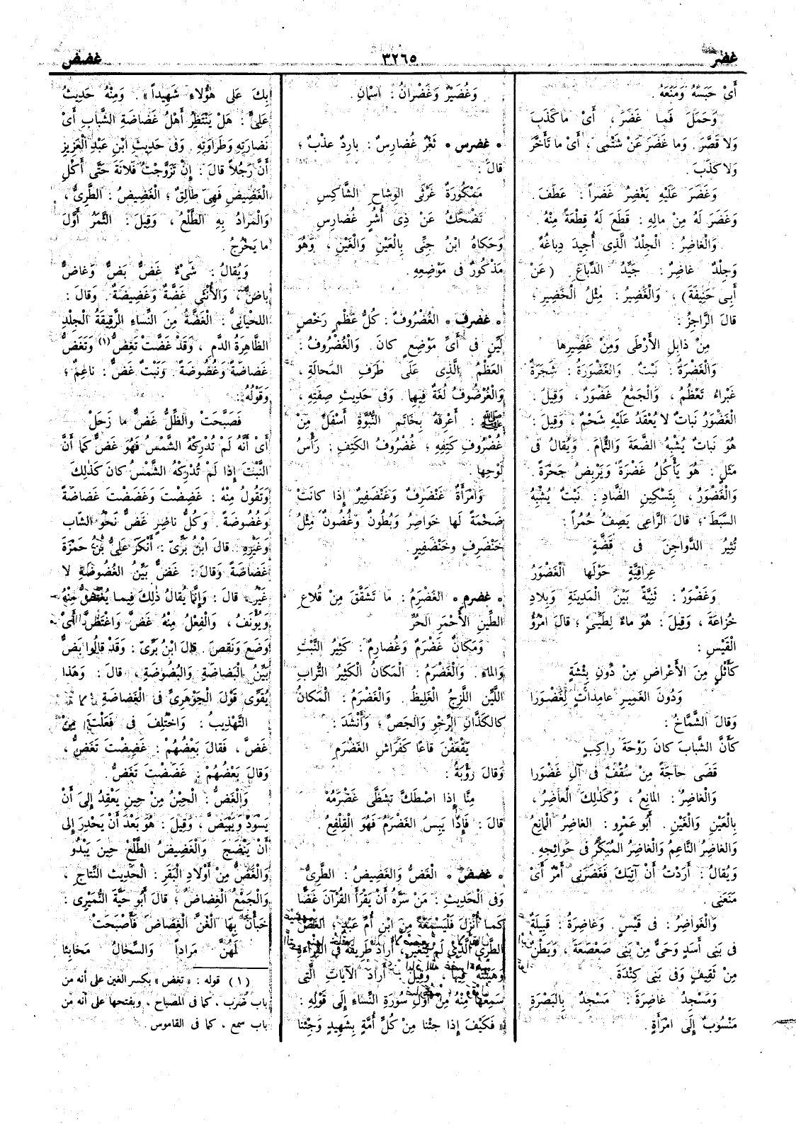 ( غضرس ) ثَغْرٌ غُضارِس باردٌ عذْب قال مَمْكُورَة غَرْثَى الوِشاحِ الشَّاكِسِ تَضْحَك عن ذي أُشُر غُضارِسِ وحكاه ابن جني بالعين والغين وهو مذكور في موضعه ( غضرف ) الغُضْرُوف كلُّ عَظم رَخْص ليّن في أَيّ موضع كان والغُضْرُوف العَظم الذي على طرف المَحالةِ والغُرْضُوفُ لغة فيهما وفي حديث صفته صلى اللّه عليه وسلم أَعْرفه بخاتم النُّبوة أَسْفَل من غُضْروف كتِفه غُضْروفُ الكتِف رأْس لَوْحِه وامرأَة غَنْضَرِفٌ وغَنْضفِير إذا كانت ضَخْمة لها خَواصِر وبطون وغُضون مثل خَنْضرف وخَنْضفير ( غضرم ) الغِضْرِمُ ما تَشَقَّق من قُلاعِ الطين الأَحمر الحُرِّ ومكانٌ غَضْرَمٌ وغُضارِمٌ كثير النَّبْت والماء والغَضْرَم المكان الكثير التراب اللَّيِّن اللَّزِجُ الغليظُ والغَضْرَمُ المكانُ كالكَذَّانِ الرِّخْوِ والجَصِّ وأَنشد يَقْعَفْنَ قاعاً كَفَرَاشِ الغَضْرَم وقال رؤبة مِنَّا إذا اصْطَكَّ تَشَظَّى غَضْرَمُه قال فإذا يَبِسَ الغَضْرَمُ فهو القِلْفِع( غضض ) الغَضُّ والغَضِيضُ الطَّرِيُّ وفي الحديث مَنْ سَرَّه أَن يَقرأَ القرآن غَضّاً كما أُنْزِلَ فَلْيَسْمَعْه من ابنِ أُمّ عَبْدٍ الغَضُّ الطريّ الذي لم يتغير أَراد طريقه في القِراءة وهيأَته فيها وقيل أَراد الآيات التي سمعها منه من أَول سورة النساء إِلى قوله فكيف إِذا جئنا من كل أُمة بشهيد وجئنا بك على هؤلاء شهيداً ومنه حديث عليّ هل يَنْتَظِرُ أَهلُ غَضاضةِ الشباب أَي نَضارَتِه وطَراوَتِه وفي حديث ابن عبد العزيز أَن رجلاً قال إِن تزوّجت فلانة حتى أَكل الغَضِيض فهي طالق الغَضِيضُ الطريّ والمراد به الطَّلْعُ وقيل الثَّمَرُ أَوَّلَ ما يخرج ويقال شيء غَضٌّ بَضٌّ وغاضٌّ باضٌّ والأُنثى غَضّةٌ وغَضِيضةٌ وقال اللحياني الغضّةُ من النساءِ الرَّقيقةُ الجلدِ الظاهرةُ الدمِ وقد غَضَّتْ تَغِضُّ