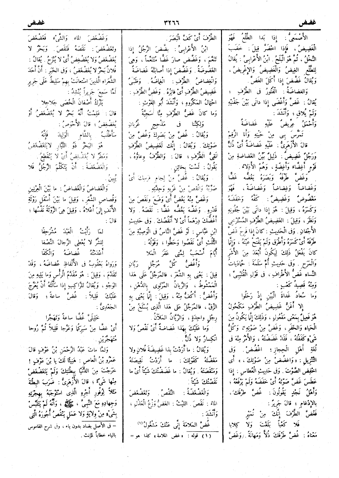 الأَصمعي إِذا بدا الطَّلعُ فهو الغَضِيضُ فإِذا اخْضَرَّ قيل خَضَبَ النخلُ ثم هو البلح ابن الأَعرابي يقال للطَّلْعِ الغِيضُ والغَضِيضُ والإِغْرِيضُ ويقال غَضَّضَ إِذا أَكل الغَضَّ والغَضاضةُ الفُتُورُ في الطرف يقال غَضَّ وأَغْضى إِذا دانى بين جفنيه ولم يُلاقِ وأَنشد وأَحْمَقُ عِرِّيضٌ عَلَيْهِ غَضاضةٌ تَمَرَّسَ بي مِنْ حَيْنِه وأَنا الرَّقِمْ قال الأَزهري عليه غَضاضةٌ أَي ذُلّ ورجل غَضِيضٌ ذَلِيلٌ بَيِّنُ الغَضاضةِ من قوم أَغِضّاءَ وأَغِضّةٍ وهم الأَذِلاّءُ وغَضَّ طَرْفَه وبَصره يَغُضُّه غَضّاً وغَضاضاً وغِضاضاً وغَضاضةً فهو مَغْضُوضٌ وغَضِيضٌ كفَّه وخَفَضَه وكسره وقيل هو إِذا دانى بين جفونه ونظر وقيل الغَضِيضُ الطرْفِ المُسْتَرْخي الأَجفانِ وفي الحديث كان إِذا فَرِحَ غَضَّ طرْفَه أَي كسَره وأَطرَق ولم يفتح عينه وإِنما كان يفعل ذلك ليكون أَبعد من الأَشَرِ والمَرَحِ وفي حديث أُم سلمة حُمادَياتُ النساءِ غَضُّ الأَطرافِ في قول القتيبي ومنه قصيد كعب وما سُعادُ غَداةَ البين إِذ رَحَلُوا إِلا أَغَنُّ غَضِيضُ الطَّرْفِ مَكْحُولُ هو فَعِيلٌ بمعنى مَفْعول وذلك إِنما يكون من الحَياءِ والخَفَرِ وغَضَّ من صوته وكلُّ شيء كَفَفْته فقد غَضَضْتَه والأَمر منه في لغة أَهل الحجاز اغْضُضْ وفي التنزيل واغضُض من صوتك أَي اخْفِضِ الصوت وفي حديث العُطاسِ إِذا عَطَسَ غَضَّ صوتَه أَي خَفَضَه ولم يرفعه وأَهل نجد يقولون غُضَّ طرْفَك بالإدْغامِ قال جرير فَغُضَّ الطرْف إِنَّكَ من نُمَيْرٍ فلا كَعْباً بَلَغْتَ ولا كِلابا معناه غُضَّ طَرْفَكَ ذُلاًّ ومَهانَة وغَضَّ الطرْفَ أَي كَفَّ البَصَرَ ابن الأَعرابي بضَّضَ الرجلُ إِذا تَنَعَّمَ وغَضَّضَ صار غَضّاً مُتَنَعِّماً وهي الغَضُوضةُ وغَضَّضَ إِذا أَصابته غَضاضةٌ وانْغِضاضُ الطرْفِ انْغِماضُه وظبي غَضِيضُ الطرْفِ أَي فاتِرُه وغَضُّ الطرْفِ احتمالُ المكروه وأَنشد أَبو الغوث وما كانَ غَضُّ الطرْفِ مِنَّا سَجِيَّةً ولَكِنَّنا في مَذْحِجٍ غُرُبان ويقال غُضَّ من بصرك وغُضَّ من صوتك ويقال إِنك لَغَضِيضُ الطرْفِ نَقِيُّ الظَّرْفِ قال والظَّرْفُ وِعاؤه يقول لسْتَ بخائن ويقال غُضَّ من لجام فرَسك أَي صَوِّبْه وانْقُص من غَرْبِه وحِدّتِه وغَضَّ منه يَغُضُّ أَي وَضَعَ ونَقَصَ من قدره وغَضَّه يَغُضُّه غَضّاً نَقَصَه ولا أَغُضُّكَ دِرْهَماً أَي لا أَنْقُصُكَ وفي حديث ابن عباس لَوْ غَضَّ الناسُ في الوصِيَّة من الثلُث أَي نَقَصُوا وحَطُّوا وقوله أَيّامَ أَسْحَبُ لِمَّتي عَفَرَ المَلا وأَغُضُّ كلَّ مُرَجَّلٍ رَيّان قيل يعني به الشَّعَر فالمُرَجَّلُ على هذا المَمْشُوطُ والرّيانُ المُرْتَوِي بالدهن وأَغُضُّ أَكُفُّ منه وقيل إِنما يعني به الزِّقّ فالمُرَجَّلُ على هذا الذي يُسْلَخُ من رجل واحدة والرّيّانُ المَلآنُ وما عليك بهذا غَضاضةٌ أَي نَقْصٌ ولا انْكسارٌ ولا ذُلٌّ ويقال ما أَرَدْت بذا غَضيضةً فلان ولا مَغَضَّتَه كقولك ما أَردت نقيصته ومَنْقَصَته ويقال ما غَضَضْتك شيئاً أَي ما نَقَصْتُك شيئاً والغَضْغَضةُ النقص وتَغَضْغَضَ الماءُ نقَص الليث الغَضُّ وَزْعُ العَذْلِ وأَنشد غُضّ المَلامةَ إِنِّي عَنْك مَشْغُولُ