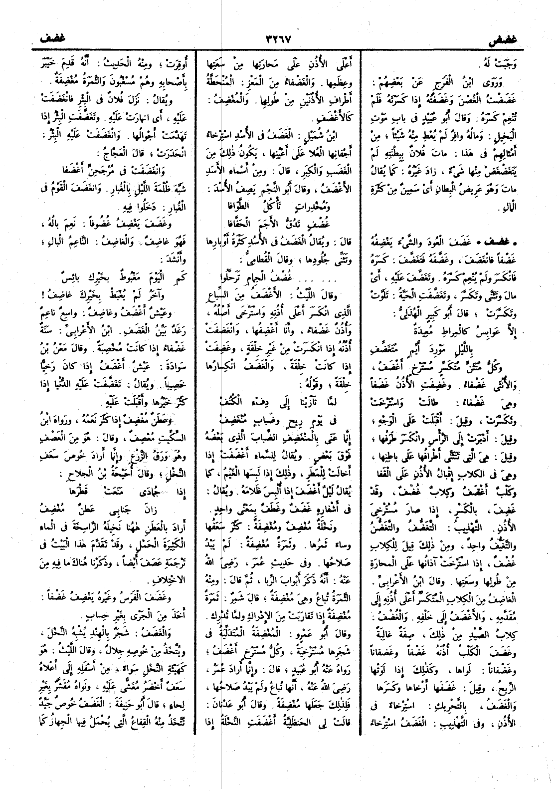 ( غضف ) غَضَفَ العُودَ والشيءَ يَغْضِفُه غَضْفاً فانغضَفَ وغَضَّفَه فَتَغَضَّفَ كسره فانكسر ولم يُنْعِم كسره وتغضَّف عليه أَي مالَ وتَثنَّى وتكسَّر وتَغَضَّفت الحَيّة تلَوّت وتكسّرت قال أَبو كبير الهُذلي إلا عَوابِسُ كالمِراطِ مُعِيدةٌ باللَّيلِ مَوْرِدَ أَيِّمٍ مُتَغَضِّفِ وكلُّ متثن متكسّر مُسترْخ أَغْضَفُ والأُنثى غَضْفاء وغَضِفت الأُذن غَضَفاً وهي غَضْفاء طالت واسْترخت وتكسّرت وقيل أَقبلت على الوجه وقيل أَدبرت إلى الرأْس وانكسر طرَفُها وقيل هي التي تتثنى أَطرافها على باطنها وهي في الكلاب إقبال الأُذن على القفا وكلبٌ أَغْضَفُ وكلاب غُضْف وقد غَضِفَ بالكسر إذا صار مسترخي الأُذن التهذيب التَّغَضُّفُ والتغَضُّنُ والتغيُّفُ واحد ومن ذلك قيل للكلاب غُضْفٌ إذا استرخت آذانها على المحارة من طولها وسَعتها وقال ابن الأَعرابي الغاضِفُ من الكلاب المتكسّر أَعلى أُذنه إلى مقدَّمه والأَغضفُ إلى خلفه والغُضْفُ كلاب الصيْد من ذلك صفة غالبة وغَضَفَ الكلبُ أُذنه غَضْفاً وغَضَفاناً وغَضْفاناً لَواها وكذلك إذا لوتْها الرِّيح وقيل غَضَفها أَرخاها وكسرها والغَضَفُ بالتحريك اسْتِرْخاء في الأُذن وفي التهذيب الغضف استرخاء أَعلى الأُذن على محارتها من سَعتها وعِظَمها والغَضْفاء من المعز المُنْحَطَّةُ أَطراف الأُذنين من طولهما والمُغْضِفُ كالأَغضف ابن شميل الغَضَفُ في الأُسْد استرخاء أَجفانها العُلا على أَعينها يكون ذلك من الغَضَب والكِبَر قال ومن أَسماء الأَسد الأَغْضَفُ وقال أَبو النجم يصف الأُسد ومُخْدِرات تأْكل الطَّوّافا غُضْف تَدُقُّ الأَجَمَ الحَفَّافا قال ويقال الغَضَفُ في الأُسُد كثرة أَوبارها وتثنِّي جلودها وقال القُطامي غُضْف الجِمامِ تَرَحَّلُوا وقال الليث الأَغْضف من السباع الذي انكسر أَعلى أُذنه واستَرخَى أَصله وأُذنٌ غَضْفاء وأَنا أَغْضِفُها وانْغَضفَت أُذنه إذا انكسرت من غير خِلْقة وغَضِفت إذا كانت خِلْقة والغَضَفُ انكسارها خلقة وقوله لما تآزَيْنا إلى دِفء الكُنُفْ في يَوْمِ ريحٍ وضَبابٍ مُنْغَضِفْ إنما عنى بالمنغضف الضباب الذي بعضه فوق بعض ويقال للسماء أَغْضَفَت إذا أَخالَت للمطر وذلك إذا لَبِسها الغَيم كما يقال ليل أَغضف إذا أُّلبِسَ ظَلامه ويقال في أَشفاره غَضَفٌ وغَطَف بمعنى واحد ونخلة مُغْضِف ومُغْضِفة كثر سَعَفُها وساءَ ثمرها وثمرة مُغْضِفة لم يَبْدُ صَلاحُها وفي حديث عمر رضي اللّه عنه أَنه ذكر أَبواب الرِّبا ثم قال ومنه الثمرة تُباع وهي مُغْضِفة قال شمر ثمَرَة مُغْضفة إذا تقاربت من الإدْراك ولمَّا تُدْرِك وقال أَبو عمرو المُغْضِفَة المُتدَلِّية في شجرها مسترخية وكلُّ مُسترخ أَغضف رواه عنه أَبو عبيد قال وإنما أَراد عمر رضي اللّه عنه أَنها تباع ولم يَبْدُ صَلاحُها فلذلك جعلها مُغْضفة وقال أَبو عدنان قالت لي الحَنظلِيّة أَغْضفَت النخلة إذا أُوقِرَتْ ومنه الحديث أَنه قدم خَيْبر بأَصحابه وهم مُسْعِنُون والثمرةُ مُغضفة ويقال نزل فلان في البئر فانغَضَفَت عليه أَي انهارت عليه وتغضفت البئر إذا تهدَّمت أَجْوالُها وانْغَضَفت عليه البئر انْحَدرت قال العجاج وانْغَضَفَتْ في مُرْجَحِنّ أَغْضَفا شبه ظلمة الليل بالغُبار وانغَضَف القوم في الغبار دخلوا فيه وغَضَف يَغْضِفُ غُضُوفاً نَعِم بالُه فهو غاضِفٌ والغاضِفُ الناعمُ البال وأَنشد كَمِ اليومَ مَغْبُوطٌ بخَيْرِك بائسٌ وآخَرُ لم يُغْبَطْ بخَيْرِك غاضِفُ وعَيْشٌ أَغْضَفُ وغاضف واسع ناعِم رَغَدٌ بَيِّنُ الغَضَف ابن الأَعرابي سنة غَضْفاء إذا كانت مخْصِبة وقال مَعْن بن سَوادةَ عيشٌ أَغضف إذا كان رَخِيّاً خَصِيباً ويقال تَغَضَّفت عليه الدنيا إذا كثر خيرها وأَقبلت عليه وعَطَنٌ مُغْضِفٌ إذا كثُر نَعَمُه ورواه ابن السكيت مُعْصِف وقال هو من العَصْف وهو ورق الزرع وإنما أَراد خُوص سعَف النخل وقال أُحَيحةُ بن الجلاح إذا جُمادى مَنَعَتْ قَطْرَها زانَ جَنابي عَطنٌ مُغْضِفُ أَ