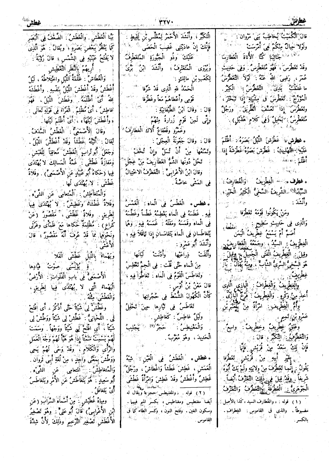 قال الكُمَيت يخاطب بني مَرْوان ولولا حِبالٌ منكمُ هي أَمْرَسَتْ جَنائِبَنا كُنَّا الأُتاةَ الغَطارِسَا وقد تَغَطْرَسَ فهو مُتَغَطْرِس وفي حديث عمر رضي اللَّه عنه لولا التَّغَطْرُس ما غَسَلْت يَدي التَّغَطْرُس الكِبر المُؤَرِّج تَغَطْرس في مِشْيَتِه إِذا تَبَخْتَر وتَغَطْرَس إِذا تَعسَّف الطريق ورجل مُتَغَطْرِس بخيل في كلام هذيل ( غطرش ) غَطْرَشَ الليلُ بصَرَه أَظلم عليه التهذيب غطرَش بصرُه غَطْرَشةً إِذا أَظلم ( غطرف ) الغِطْريف والغُطارِف السيد الشريفُ السخِيّ الكثير الخير وأَنشد ومَن يَكُونوا قوْمه تَغَطْرَفا والذي في حديث سَطِيح أَصَمَّ أَم يَسْمَعُ غِطريفُ اليَمن الغِطريف السيِّد وجمعه الغَطاريف وقيل الغِطْريف الفتى الجميل وقيل هو السخِيّ السَّريُّ الشابُّ ومنه يقال بازٌ غِطْريف والغِطْريف والغِطْراف البازي الذي أُخذ من وكْره والغِطريف فَرْخُ البازي وأُمّ الغِطريف امرأَة من بَلْغَنْبَر بن عمرو بن تميم وعنَقٌ غِطْريف وخِطْريف واسع والتَّغَطْرُف التكَبُّر قال فإنْ يَكُ سَعْدٌ من قُرَيْشٍ فإنَّما بَغَيْرِ أَبِيه من قُرَيْشٍ تَغَطْرَفا يقول إنما تَغَطْرَفَ من ولايته ولم يكُ أَبوه شريفاً وقد قيل في ذلك التَّغَتْرُف أَيضاً الجوهري الغَطْرَفةُ والتَّغَطْرُف والتَّغَتْرُف التكبر وأَنشد الأَحمر لمُغلس بن لَقِيط فإنَّك إنْ عادَيْتَني غَضِبَ الحصَى عليْكَ وذو الجَبُّورةِ المُتَغَطْرِفُ ويروى المُتَغَتْرِفُ وأَنشد ابن بري لكعب بن مالك الحمد للّه الذي قد شَرَّفا قوْمي وأَعْطاهْم معاً وغَطْرَفا قال وقال ابن الطَّيْفانِيّة وإني لَمِنْ قَوْمٍ زُرارةُ منهمُ وعَمْرو وقَعْقاعٌ أُلاكَ الغطارِفُ قال وقال جَعْونة العجلي وتَمْنَعُها من أَن تُسَلَّ وإن تُخَفْ تَحُلْ دُونها الشُّمُّ الغَطارِيفُ من عجْلِ وقال ابن الأَعرابي التَّغَطرُف الاخْتيال في المَشي خاصّة ( غطس ) الغَطْس في الماء الغَمْسُ فيه غَطَسَه في الماء يَغْطِسُه غَطْساً وغَطَّسَه في الماء وقَمَسَه ومَقَلَه غَمَسَه فيه وهما يَتَغاطَسان في الماء يَتَقامَسان إِذا تَماقَلاَ فيه وأَنشد أَبو عمرو وأَلْقَتْ ذِراعَيْها وأَدْنَتُ لَبَانَها مِنَ الماء حتى قُلْت في الجَمِّ تَغْطِسُ وتَغاطَسَ القومُ في الماء تَغاطُّوا فيه قال مَعْن ابن أَوس كأَنَّ الكُهُولَ الشُّمْطَ في حُجُراتِها تَغاطَسُ ي تَيَّارِها حِين تَحْفِلُ وليلٌ غاطِس كغاطِش والمَغْنِيطِسُ حَجَرٌ