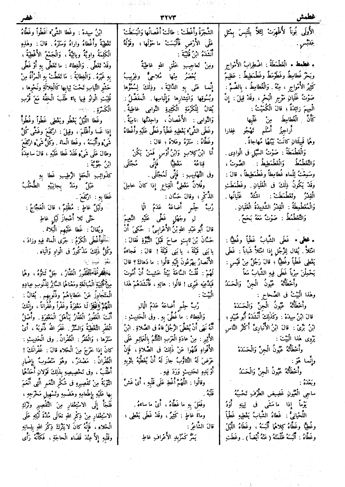 الأُولى نوناً لأَظْهِرَتْ لئلا يلْتَبِس بمثل عَدَبّس ( غطمط ) الغَطْمَطَةُ اضْطِرابُ الأَمْواج وبحر غُطامِطٌ وغَطَوْمَطٌ وغَطْمَطِيطٌ عظيمٌ كثير الأَمواجِ منه والغُطامِطُ بالضم صوت غَلَيانِ مَوْجِ البحر وقد قيل إِن الميم زائدة قال الكميت كأَنَّ الغُطامِطَ من غَلْيها أَراجِيزُ أَسْلَم تَهْجُو غِفارا وهما قبيلتان كانت بينهما مُهاجاة والغَطْمَطَةُ صوت السيل في الوادِي والتَّغَطْمُطُ والغَطْمَطِيطُ الصوتُ وسمعت للماء غُطامِطاً وغَطْمَطِيطاً قال وقد يكون ذلك في الغَلَيانِ وغَطْمَطَتِ القِدْر وتغَطْمَطَت اشْتَدَّ غَلَيانُها والمُغطْمِطةُ القِدْر الشديدةُ الغَلَيانِ والتَغَطْمُطُ صوت معه بحَح ( غطي ) غَطَى الشَّبابُ غَطْياً وغُطِيّاً امْتَلأَ يقال للرجُلِ إِذا امْتَلأَ شَباباً غَطَى يَغْطِي غَطْياً وغُطِيّاً قال رجل من قيس يَحْمِلْنَ سِرْباً غَطَى فيه الشَّبابُ مَعاً وأَخْطَأَتْه عُيونُ الجِنِّ والحَسَدُ وهذا البيت في الصحاح وأَخْطأَتْه عيونُ الجِنِّ والحَسَدَهْ قال ابن سيده وكذلك أَنشده أَبو عبيد ابن بري قال ابن الأَنباري أَكثرُ الناسِ يروي هذا البيت وأَخْطأَتْه عيونُ الجِنِّ والحَسَدَهْ وإِنما هو وأَخْطأَتْه عيونُ الجنِّ والحَسَدُ وبعده ساجِي العُيونِ غَضِيض الطَّرْفِ تَحْسِبُه يوماً إِذا ما مَشى في لِينِه أَوَدُ اللحياني غَطاهُ الشبابُ يَغْطِيه غَطْياً وغُطِيّاً وغَطَّاه كلاهما أَلْبَسَه وغَطَاه الليلُ وغَطَّاه أَلْبَسَه ظُلْمَته عنه أَيضاً وغَطَتِ الشَجرة وأَغْطتْ طالَتْ أَغْصانُها وانْبَسَطَت على الأَرض فأَلْبَسَت ما حولها وقوله أَنشده ابن قتيبة ومِن تَعاجِيبِ خَلْقِ اللهِ غاطِيَةٌ يُعْصَرُ منها مُلاحِيٌّ وغِرْبِيبُ إِنما عَنى به الداليَةَ وذلك لسُمُوِّها وبُسُوقها وانتِشارِها وإِلْباسِها المفضل يقال للكَرْمةِ الكثيرةِ النَّوامي غاطِيةٌ والنَّوامي الأَغْصانُ واحِدَتُها نامِيةٌ وغَطَى الشيءَ يَغْطِيه غَطْياً وغَطَّى عليه وأَغْطاه وغَطَّاه سَتَره وعَلاه قال أَنا ابنُ كِلابٍ وابنُ أَوْسٍ فمَنْ يَكُنْ قِناعُه مَغْطِيّاً فإِني مُجْتَلى وفي التهذيب فإني لَمُجْتَلى وفلانٌ مَغْطِيُّ القِناعِ إِذا كان خامِلَ الذِّكْرِ وقال حسان رُبَّ حِلْمٍ أَضاعه عَدَمُ الما ل وجَهْلٍ غَطَّى عليه النَّعِيمُ قال أَبو عبد الله بنُ الأَعرابي حُكِيَ أَنَّ حسانَ بنَ ثابت صاحَ قبلَ النُّبوّة فقال يا بَني قَيْلةَ يا بَني قَيْلة قال فجاءه الأَنصارُ يْهْرَ عُونَ إِليه قالوا ما دَهاكَ ؟ قال لهم قلتُ الساعةَ بيتاً خَشِيتُ أَن أَموتَ فيَدّعِيَه غيري قالوا هاتِه فأَنشَدهم هذا البيت رُبَّ حِلْمٍ أَضاعَه عَدَمُ المالِ والغِطاءُ ما غُطِّيَ به وفي الحديث أَنه نَهَى أَن يُغَطِّيَ الرجلُ فاهُ في الصلاةِ ابن الأَثير من عادة العرب التَّلَثُّم بالعَمائمِ على الأَفْواه فنُهوا عن ذلك في الصلاة فإِنْ عَرَضَ له التَّثاؤب جاز له أَن يُغَطِّيه بثَوْبه أَو يده لحديث ورد فيه وقالوا اللهمَّ أَغْطِ على قَلْبه أَي غَشِّ قلْبَه وفعَلَ به ما غطاه أَي ما ساءَه وماءٌ غاطٍ كثيرٌ وقد غَطى يَغْطِي قال الشاعر يَمُرُّ كمُزْبِدِ الأَعْرافِ غاطِ ابن سيده وغَطا الشيءَ غَطْواً وغَطَّاه تَغْطِيةً وأَغْطاه واراهُ وسَتَرَه قال وهذه الكلمة واويَّة وبائيَّة والجمع الأَغْطِيَة وقد تَغَطَّى والغِطاءُ ما تَغَطَّى به أَو غَطَّى به غيرَه والغِطايةُ ما تغَطَّتْ به المرأَةُ من حشْو الثياب تحت ثيابها كالغِلالة ونحوها قُلبَت الواو فيها ياء طَلَبَ الخفَّة مع قربِ الكسرة وغَطا الليلُ يَغْطُو ويَغْطِي غُطْواً وغَطُوّاً إِذا غَسا وأَظْلَم وقيل ارْتَفَع وغَشَّى كلَّ شيءٍ وأَلبسه وغَطا الماء وكل شيءٍ ارْتَفَع وطالَ على شيءٍ فقدْ غَطا عليه قال ساعدة بن جُؤيَّة كذَوائِب الحَفاءِ الرَّطِيبِ غَطا به عَبْلٌ ومَدَّ بجانبيه الطُّحْلُبُ غَطا به ارْتَفَع وليلٌ غاطٍ مظْلِمٌ قال الع
