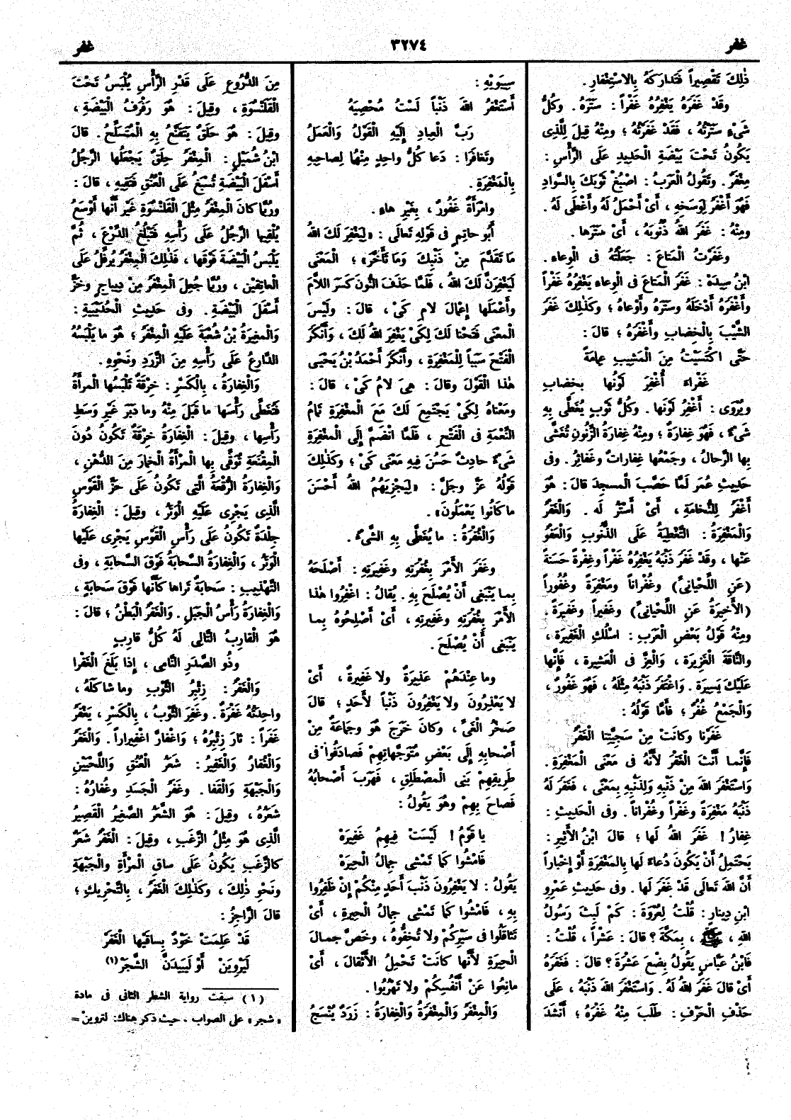 ذلك تقصيراً فتداركه بالاستغفار وقد غَفَرَه يَغْفِرُه غَفراً ستره وكل شيء سترته فقد غَفَرْته ومنه قيل للذي يكون تحت بيضة الحديد على الرأْس مِغْفَرٌ وتقول العرب اصْبُغْ ثوبَك بالسَّوادِ فهو أَغْفَرُ لوَسَخِه أَي أَحْمَلُ له وأَغطى له ومنه غَفَرَ اللّه ذنوبه أَي سترها وغَفَرْتُ المتاع جعلته في الوعاء ابن سيده غَفَرَ المتاعَ في الوعاء يَغْفِرُه غَفْراً وأَغْفَرَه أَدخله وستره وأَوعاه وكذلك غَفَرَ الشيبَ بالخِضاب وأَغْفَرَه قال حتى اكْتَسَيْتُ من المَشِيب عِمامةً غَفراءَ أُغْفِر لَوْنُها بِخِضابِ ويروى أَغْفِرُ لونها وكلُّ ثوب يغطَّى به شيء فهو غِفارة ومنه غِفارة الزِّنُون تُغَشَّى بها الرحالُ وجمعها غِفارات وغَفائِر وفي حديث عمر لمَّا حَصَّبَ المسجدَ قال هو أَغْفَرُ للنُّخامة أَي أَسْتَرُ لها والغَفْرُ والمَغْفِرةُ التغطية على ابذنوب والعفوُ عنها وقد غَفَرَ ذنبه يَغْفِرُه غَفْراً وغِفْرةً حَسَنة عن اللحياني وغُفْراناً ومَغْفِرة وغُفوراً الأَخيرة عن اللحياني وغَفيراً وغَفيرةً ومنه قول بعض العرب اسلُك الغفيرة والناقةَ الغَزيرة والعزَّ في العَشيرة فإِنها عليك يَسيرة واغْتَفَر ذنبَه مثله فهو غَفُور والجمع غُفُرٌ فأَما قوله غَفَرْنا وكانت من سَجِيّتِنا الغَفْرُ فإِنما أَنَث الغَفْرَ لأَنه في معنى المَغْفِرة واسْتَغْفَرَ اللَّه من ذنبه ولذنبه بمعنى فغَفَرَ له ذنبه مَغْفِرةً وغَفُراً وغُفْراناً وفي الحديث غِفارُ غَفَرَ اللَّه لها قال ابن الأَثير يحتمل أَن يكون دعاءً لها بالمَغْفِرة أَو إِخباراً أَن اللَّه تعالى قد غَفَرَ لها وفي حديث عَمْرو بن دينار قلت لعروة كم لَبِثَ رسولُ اللَّه صلى اللَّه عليه وسلم بمكة ؟ قال عَشْراً قلت فابنُ عباس يقول بِضْعَ عَشْرة ؟ قال فغَفَره أَي قال غَفَر اللَّه له واسْتَغْفَر اللَّه ذنبَه على حذف الحرف طلب منه غَفْرَه أَنشد سيبويه أَسْتَغْفَرُ اللهَ ذنباً لَسْتُ مُحْصِيَه ربّ العباد إليه القولُ والعملُ وتَغافَرَا دَعا كلُّ واحد منهما لصاحبه بالمَغْفِرة وامرأَة غَفُور بغير هاء أَبو حاتم في قوله تعالى لِيَغعُثرَ ليَغْفِرَ اللهُ لك ما تَقَدَّمَ من ذَنْبِكَ وما تأَخَّر المعنى لَيَغْفِرَنَّ لك اللهُ فلما حذف النون كسر اللام وأَعْملها إِعمال لامِ كي قال وليس المعنى فتحنا لك لكي يغفر اللهُ لك وأَنْكَر الفتح سبباً للمغفرة وأَنكر أَحمد بن يحيى هذا القول وقال هي لام كي قال ومعناه لكي يجتَمِع لك مع المغفرة تمامُ النعمة في الفتح فلما انضم إِلى المغفرة شيء حادث حَسُنَ فيه معنى كي وكذلك قوله عز وجل لِيَجْزِيَهم اللَّه أَحْسَنَ ما كانوا يَعْمَلون والغُفْرةُ ما يغطَّى به الشيء وغَفَرَ الأَمْرَ بِغُفْرته وغَفيرتِه أَصلحه بما ينبغي أَن يَصْلَح به يقال اغْفِروا هذا الأَمرَ بِغُفْرتِه وغَفيرتِه أَي أَصْلحوه بما ينبغي أَن يُصْلَح وما عندهم عَذيرةٌ ولا غَفِيرة أَي لا يَعْذِرون ولا يَغفِرون ذنباً لأَحد قال صخر الغَيّ وكان خرج هو وجماعة مت أَصحابهإلى بعض متوجّهاتهم فصادفوا في طريقهم بني المصطلق فهرب أَصحابه فصاح بهم وهو يقول يا قوم لَيْسَت فيهمُ غَفِيرهْ فامْشُوا كما تَمْشي جِمالُ الحِيرهْ يقول لا يغفرون ذنب أَحد منكم إِن ظفروا به فامشوا كما تمشي جمالُ الحيرة أَي تَثاقَلوا في سيركم ولا تُخِفّوه وخصّ جمالَ الحيرة لأَنها كانت تحمل الأَثقال أَي مانِعوا عن أَنفسكم ولا تَهْرُبوا والمِغْفرُ والمِغْفرةُ والغِفارةُ زَرَدٌ ينسج من الدروع على قدر الرأْس يلبس تحت القلنسوة وقيل هورَفْرَفُ البيضة وقيل هو حَلقٌ يَتَقَنَّعُ به المُتَسَلِّح قال ابن شميل المِغْفَرُ حِلَقٌ يجعلُها الرجل أَسفلَ البيضة تُسْبَغ على العنُق فتَقِيه قال وربما كان المِغْفَرُ مثلَ القلنسوة غير أَنها أَوسع يُلْقِيها الرجل على رأْسه فتبلغ الدرع ثم يَلْبَس البيضة فوقها فذلك المِغْفرُ يُرفّلُ على العاتقين وربما جُعل المِغْفَرُ من ديباج وخَزٍّ أَسفلَ الب