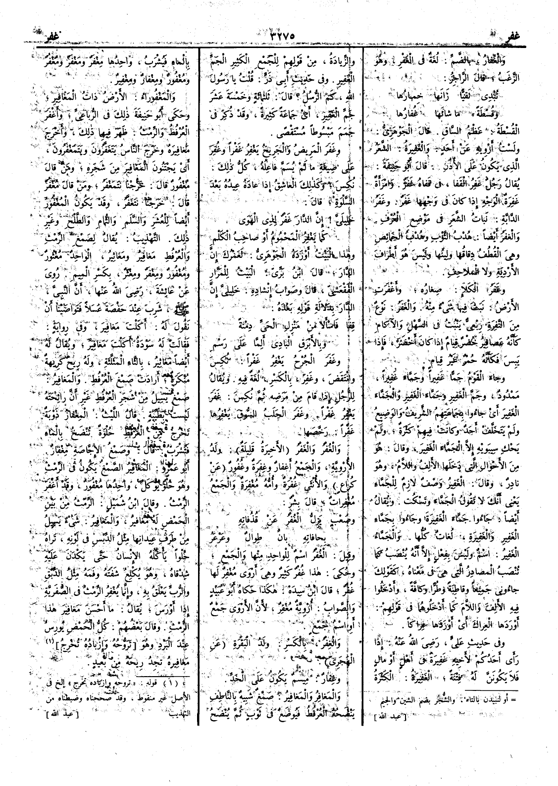 والغُفارُ بالضم لغة في الغَفْر وهو الزغب قال الراجز تُبْدِي نَقيًّا زانَها خِمارُها وقُسْطةً ما شانَها غُفارُها القُسْطة عَظْمُ الساق قال الجوهري ولست أَرويه عن أَحد والغَفيرةُ الشعر الذي يكون على الأُذُن قال أَبو حنيفة يقال رجل غَفِرُ القفا في قفاه غَفَرٌ وامرأَة غَفِرةُ الوجهِ إِذا كان في وجهها غَفَرٌ وغَفَرُ الدابة نباتُ الشعر في موضع العرف والغَفَرُ أَيضاً هُدْبُ الثوب وهدبُ الخمائص وهي القُطُ دِقاقُها ولِينُها وليس هو أَطرافَ الأَرْدِيةِ ولا الملاحفِ وغَفَرُ الكلإِ صِغارُه وأَغْفَرت الأَرضُ نبَتَ فيها شيء منه والغَفَرُ نوع من التَّفِرة رِبْعِيٌّ ينبت في السَّهْل والآكام كأَنه عصافيرُ خُضْرٌ قِيامٌ إِذا كان أَخضر فإِذا يبس فكأَنه حُمْرٌ غير قيام وجاء القوم جَمًّا غَفيراً وجَمَّاءَ غَفيراً ممدود وجَمَّ الغَفِيرِ وجمّاء الغَفيرِ والجَمّاءَ الغَفيرَ أَي جاؤوا بجماعتهم الشريفُ والوضيع ولم يتخلّفْ أَحد وكانت فيهم كثرة ولم يَحْكِ سيبويه إِلا الجَمَّاءَ الغَفيرَ وقال هو من الأَحوال التي دخلها الأَلف واللام وهو نادر وقال الغَفير وصفٌ لازم للجَمّاء يعني أَنك لا تقول الجَمّاء وتسكت ويقال أَيضاً جاؤوا جَمّاءَ الغَفيرة وجاؤوا بجَمَّاءِ الغَفير والغَفيرة لغات كلها والجَمّاء الغَفير اسم وليس بفعل إِلاَّ أَنه ينصب كما تنصب المصادر التي هي في معناه كقولك جاؤوني جميعاً وقاطبةً وطُرًّا وكافَّةً وأَدخلوا فيه الأَلف واللام كما أَدخلوهما في قولهم أَوْرَدَها العِراكَ أَي أَوردها عِراكاً وفي حديث علي رضي الله عنه إِذا رأَى أَحدُكم لأَخِيه غَفِيرةً في أَهلٍ أَو مالٍ فلا يكونَنَّ له فِتْنة الغَفِيرةُ الكثرةُ والزيادةُ من قولهم للجمع الكثير الجَمّ الغَفِير وفي حديث أَبي ذر قلت يا رسول الله كم الرسلف قال ثَلثمائةٍ وخمسة عَشر جَمِّ الغَفِير أَي جماعة كثيرة وقد ذكر في جمم مبسوطاً مستقصى وغَفَرَ المريضُ والجريحُ يَغْفِرُ غَفْراً وغُفِرَ على صيغة ما لم يسمَّ فاعله كلُّ ذلك نُكِسَ وكذلك العاشِقُ إِذا عادَه عيدُه بعد السَّلْوة قال خَلِيليّ إِن الدارَ غَفْرٌ لِذِي الهَوَى كما يَغْفِرُ المَحْمُومُ أَو صاحِبُ الكَلْمِ وهذا البيت أَورده الجوهري لَعَمْرُكَ إِن الدار قال ابن بري البيت للمرّار الفقعسي قال وصواب إِنشاده خليلي إِن الدار بدلالة قوله بعده قِفَا فاسأَلا منْ مَنْزِلِ الحَيِّ دِمْنةً وبالأَبْرَقِ البادِي أَلِمّا على رَسْمِ وغَفَرَ الجرحُ يَغْفِرُ غَفْراً نُكِسَ وانتقض وغَفِرَ بالكسر لغة فيه ويقال للرجل إِذا قام من مرضه ثم نُكِسَ غَفَرَ يَغْفِرُ غَفْراً وغَفَرَ الجَلَبُ السُّوقَ يَغْفِرُها غَفْْراً رَخّصها والغُفْرُ والغَفْرُ الأَخيرة قليلة ولدُ الأُرْوِيّة والجمع أَغْفارٌ وغِفَرةٌ وغُفورٌ عن كراع والأُنثى غُفْرة وأُمُّهُ مُغْفِرةٌ والجمع مُغْفِرات قال بشر وصَعْب يَزِلّ الغُفْرُ عن قُذُفاتِه بحافاته بانٌ طِوالٌ وعَرْعَرُ وقيل الغُفْر اسم للواحد منها والجمع وحكي هذا غُفْرٌ كثير وهي أَرْوَى مُغْفِرٌ لها غُفْرٌ قال ابن سيده هكذا حكاه أَبو عبيد والصواب أُرْوِيّةٌ مُغْفِر لأَن الأَرْوَى جمع أَو اسمُ جمع والغِفْرُ بالكسر ولدُ البقرة عن الهَجَريّ وغِفارٌ مِيسمٌ يكون على الخد والمَغافرُ والمَغافِيرُ صمغ شبيه بالناطِفِ ينضحه العُرْفط فيوضع في ثوب ثم يُنْضَح بالماء فيُشْرب واحدها مِغْفَر ومَغْفَر ومُغْفُر ومُغْفور ومِغْفار ومِغْفِير والمَغْفوراءُ الأَرضَ ذات المَغافِير وحكى أَبو حنيفة ذلك في الرباعي وأَغْفَر العُرْفُط والرِّمْثُ ظهر فيهما ذلك وأَخرج مَغافِيرَه وخرج الناس يَتَغَفَّرُون ويَتَمَغْفَرُون أَي يجتَنُون المَغافيرَ من شجره ومن قال مُغْفور قال خرجنا نتَمَغْفَر ومن قال مُغْفُر قال خرجنا نتَغَفَّر وقد يكون المُغْفورُ أَيضاً العُشَر والسَّلَم والثُّمام والطلح وغير ذلك التهذيب يقال لصمغ الرِّمْث والعرفط مَغافِير ومَغاثِي