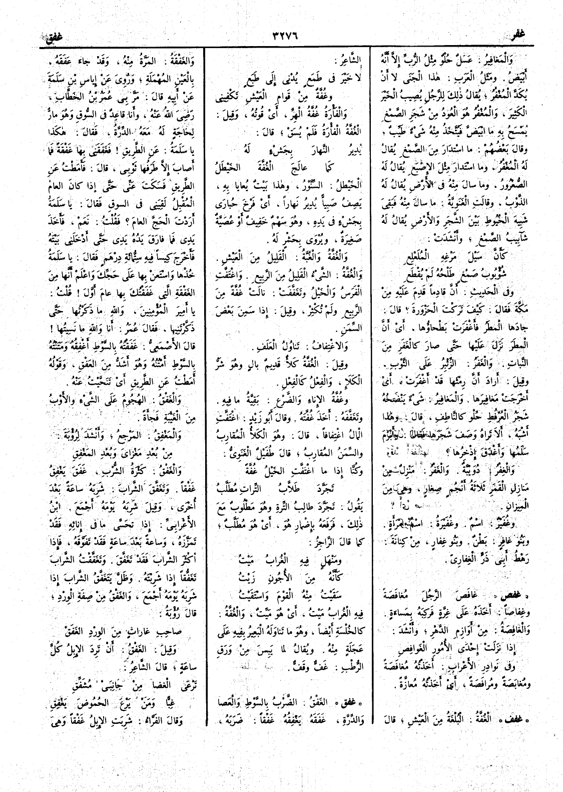 والمَغافيرُ عسل حلو مثل الرُّبّ إِلا أَنه أَبيض ومَثَلُ العربِ هذا الجَنى لا أَن يُكَدَّ المُغْفُر يقال ذلك للرجل يصيب الخير الكثير والمُغْفُرُ هو العود من شجر الصمغ يمسح به ما ابيضّ فيتخذ منه شيء طيب وقال بعضهم ما استدار من الصمغ يقال له المُغْفُر وما استدار مثل الإِصبع يقال له الصُّعْرور وما سال منه في الأَرض يقال له الذَّوْبُ وقالت الغنوية ما سال منه فبقي شَبيه الخيوط بين الشجر والأَرض يقال له شَآبِيب الصمغ وأَنشدت كأَنَّ سَيْلَ مَرْغِه المُلَعْلِعِ شُؤْبوبُ صَمْغٍ طَلْحُه لم يُقْطَعِ وفي الحديث أَن قادِماً قَدِم عليه من مكة فقال كيف تركتَ الحَزْوَرة ؟ قال جادَها المطرُ فأَغْفَرَتْ بَطْحاؤها أَي أَن المطر نزل عليها حتى صار كالغَفَر من النبات والغَفَرُ الزِّئْبِرُ على الثوب وقيل أَراد أَن رِمْثَها قد أَغْفَرت أَي أَخرجت مَغافيرَها والمَغافيرُ شيء ينضحه شجر العرفط حلو كالناطف قال وهذا أَشْبَه أَلا تراه وصف شجرها فقال وأَبْرَم سَلمُها وأَغْدَق إِذْخِرُها والغِفْرُ دُوَيْبّة والغَفْرُ منزل من منازل القمر ثلاثةُ أَنْجُم صغار وهي من الميزان وغُفَير اسم وغُفَيرة اسم امرأَة وبنو غافِرٍ بطن وبنو غِفارٍ من كنانة رهط أَبي ذر الغِفارِيّ ( غفص ) غافَصَ الرجلَ مُغافَصةً وغِفاصاً أَخذه على غرّةٍ فَركِبَه بمَساءة والغافِصةُ من أَوازِم الدهر وأَنشد إِذا نَزَلَت إِحْدَى الأُمورِ الغَوافِص وفي نوادر الأَعراب أَخذْتُه مُغافَصةً ومُغابَصةً ومُرافَصةً أَي أَخذْتُه مُعازّة( غفف ) الغُفَّةُ البُلْغَةُ من العَيْش قال الشاعر لا خَيرَ في طَمَعٍ يُدْني إلى طَبَعٍ وغُفَّةٌ من قَوامِ العَيشِ تَكْفِيني والفَأْرةُ غُفَّة الهِرّ أَي قُوتُه وقيل الغفة الفأْرة فلم يُسَقْ قال يُدِيرُ النَّهارَ بجَشْءٍ له كما عالَجَ الغُفَّةَ الخَيْطَلُ الخَيْطلُ السِّنَّوْر وهذا بيت يُعايا به يصف صبيّاً يدير نَهاراً أَي فَرْخَ حُبارَى بجَشء في يده وهو سَهْم خَفِيف أَو عُصيّةٌ صغيرة ويروى بحَشْر له والغُفَّة والغُبّةُ القليل من العيش والغُفة الشيء القليل من الرَّبيع واغْتَفَّتِ الفرس والخيل وتَغَفَّفَت نالت غُفة من الرَّبيع ولم تُكْثِر وقيل إذا سَمِن بعض السِّمَن والاغْتِفافُ تناوُل العلَف وقيل الغُفة كلأ قديم بالٍ وهو شرُّ الكلإ والفعل كالفعل وغُفة الإناء والضرْع بقيّة ما فيه وتَغَفَّفه أَخذ غُفَّته وقال أَبو زيد اغْتَفَّتِ المالُ اغْتِفافاً قال وهو الكلأ المُقارِبُ والسِّمنُ المُقارِب قال طُفَيْل الغَنَوِيّ وكُنّا إذا ما اغْتَفَّتِ الخيلُ غُفَّةً تَجَرَّدَ طَلاَّبُ التِّراتِ مُطَلَّب يقول تَجَرَّدَ طالِبُ التِّرة وهو مَطلوب مع ذلك فرفَعه بإضمار هو أَي هو مُطَلَّبٌ كما قال الراجز ومَنْهَلٍ فيه الغُرابُ مَيْتُ كأَنه من الأُجُونِ زَيْتُ سَقَيْتُ منه القومَ واستقَيْتُ فيه الغراب ميت أَي هو ميت والغُفَّةُ كالخُلْسةِ أَيضاً وهو ما تَناوَله البعير بفِيه على عجلة منه ويقال لما يَبس من ورق الرُّطْب غَفٌّ وقَفٌّ