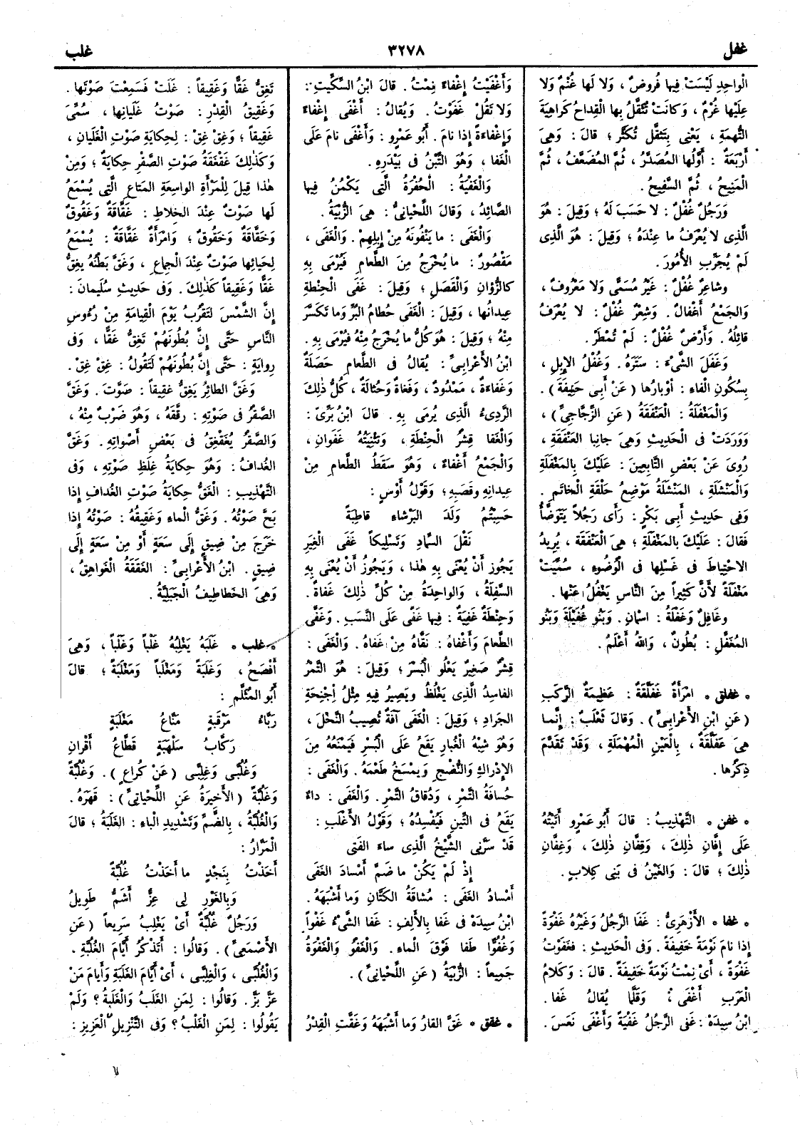 الواحد ليست فيها فُروضٌ ولا لها غُنْم ولا عليها غُرْم وكانت تُثَقَّل بها القِداحُ كراهية التُّهَمَة يعني بتثقّل تكثّر قال وهي أَربعة أَولها المُصَدَّرُ ثم المُضَعَّف ثم المَنِيح ثم السَّفيح ورجل غُفْل لا حسَب له وقيل هو الذي لا يعرف ما عنده وقيل هو الذي لم يجرِّب الأُمور وشاعر غُفْل غير مسمى ولا معروف والجمع أَغْفال وشِعْر غُفْل لا يعرف قائله وأَرض غُفْل لم تُمْطَر وغفَل الشيءَ ستَره وغُفْل الإِبل بسكون الفاء أَوبارُها عن أَبي حنيفة والمَغْفَلة العَنْفَقة عن الزجاجي ووردت في الحديث وهي جانبا العَنْفَقة روي عن بعض التابعين عليك بالمَغْفَلة والمَنْشَلة المَنْشَلةُ موضع حلقة الحاتم وفي حديث أَبي بكر رأَى رجلاً يتوضأ فقال عليك بالمَغْفَلةِ هي العَنْفقة يريد الاحتياط في غسلها في الوضوء سميت مَغْفَلة لأَن كثيراً من الناس يُغْفلُ عنها وغافلٌ وغَفْلة اسمان وبنو غُفَيْلة وبنو المُغَفَّل بُطون والله أَعلم ( غفلق ) امرأَة غَفَلَّقَةٌ عظيمة الرَّكَب عن ابن الأعرابي وقال ثعلب إنما هي عَفَلَّقَة بالعين المهملة وقد تقدم ذكرها