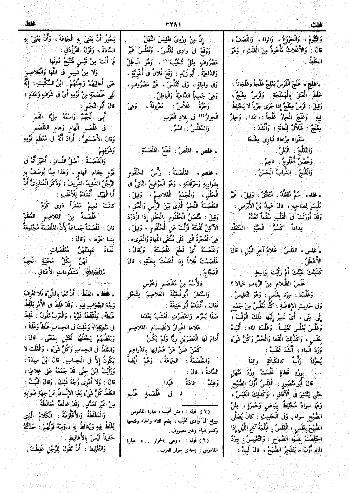 ( غلص ) الغَلْصُ قَطْعُ الغَلْصَمةِ( غلصم ) الغَلْصَمَةُ رأْس الحُلْقوم بشواربه وحَرْقدته وهو الموضع الناتئ في الحَلْق والجمع الغَلاصِمُ وقيل الغَلْصَمةُ اللَّحم الذي بين الرأْس والعُنُق وقيل مُتَّصَلُ الحلقوم بالحلق إذا ازْدَرَدَ الآكلُ لُقْمَته فَزَلَّتْ عن الحلقوم وقيل هي العُجرةُ التي على مُلْتَقَى اللَّهاةِ والمَرِيءِ وغَلْصَمَه أي قَطَع غَلْصَمَتَه ويقال غَلْصَمْتُ فلاناً إذا أخذت بحَلْقِه قال العجاج فالأُسْدُ مِنْ مُغَلْصَمٍ وخُرْسِ واستعار أبو نُخَيْلة الغَلاصِمَ للنَّخْل فقال أَنشده أَبو حنيفة صَفَا بُسْرُها واخْضَرَّتِ العُشْبُ بَعْدَما عَلاها اغْبِرارٌ لانْضِمامِ الغَلاصِمِ أدامَ لهَا العَصْرَيْنِ رِيّاً ولم يَكُنْ كَمَنْ ضَنَّ عَن عُمْرانِها بالدَّراهِمِ والغَلْصَمَةُ الجماعةُ وهم أَيضاً السادةُ قال وهِنْدٌ غادةٌ غَيْدا ءُفي ؟ ؟ غَلْصَمةٍ غُلْبِ يجوز أن يعني به الجماعة وأن يعني به السادة وقول الفرزدق فما أنتَ من قَيْسٍ فَتَنْبَح دُونَها ولا من تَمِيمٍ في اللَّها والغلاصِم عَنَى أَعاليَهم وجِلَّتَهم ابن السكيت إنه لفي غَلْصَمَةٍ من قومه أي في شَرَفٍ وعَدَدٍ قال أَبو النجم أَبي لُجَيْمٌ واسْمُهُ ملءُ الفَمِ في غَلْصَمِ الهامِ وهامِ الغَلْصَمِ وقال الأَصمعي أراد أَنه في مُعْظَم قومه وشرَفِهم والغَلْصَمةُ أَصلُ اللسان أخبر أَنه في قَومٍ عِظام الهامِ وهذا مما يوصف به الرجلُ الشديدُ الشريفُ وذكر المُنذري أَن أَبا الهيثم أَنشده للأغلب كانَتْ تَمِيمُ مَعْشَراً ذَوِي كَرَم غَلْصَمةً مِنَ الغَلاصِمِ العُظَم قال غَلْصَمَةً جماعة لأن الغَلْصمة مجتمعة بما حولها وقال غَداةَ عَهِدْتُهُنَّ مُغَلْصَماتٍ لَهُنَّ بِكُلِّ مَحْنِيَة نَحِيمُ مُغَلْصَماتٍ مشدودات الأعناق ( غلط ) الغَلَطُ أَن تَعْيا بالشيء فلا تَعْرِفَ وجه الصواب فيه وقد غَلِطَ في الأمر يَغْلَطُ غَلَطاً وأَغْلَطَه غيره والعرب تقول غَلِطَ في مَنْطِقِه وغَلِتَ في الحِساب غَلَطاً وغَلَتاً وبعضهم يجعلُهما لغتين بمعنىً قال والغَلَطُ في الحِساب وكلِّ شيءٍ والغَلَتُ لا يكون إِلا في الحساب قال ابن سيده ورأَيت ابن جني قد جمعَه على غِلاطٍ قال ولا أَدْري وجْهَ ذلك وقال الليث الغَلَطُ كل شيءٍ يَعْيا الإِنسان عن جهة صوابه من غير تعمد وقد غالَطَه مُغالَطةً والمَغْلَطةُ والأُغْلُوطةُ الكلام الذي يُغْلَطُ فيه ويُغالَطُ به ومنه قولهم حَدَّثْتُه حديثاً ليس بالأَغالِيطِ والتغْلِيطُ أَن تقول للرجل غَلِطْتَ