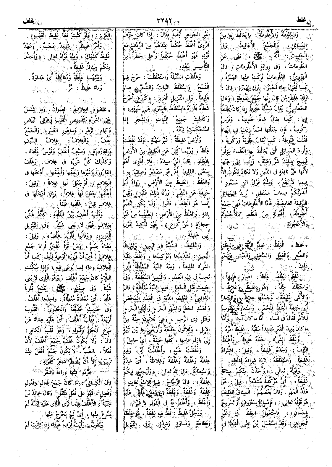 والمَغْلَطةُ والأُغْلُوطةُ ما يُغالَطُ به من المسائل والجمع الأَغالِيطُ وفي الحديث أَنه صلّى اللّه عليه وسلّم نَهى عن الغَلُوطاتِ وفي رواية الأُغْلُوطاتِ قال الهرويّ الغَلُوطاتُ تُركت منها الهمزة كما تقول جاء لَحْمَرُ بترك الهمزة قال وقد غَلِطَ مَن قال إِنها جمع غَلُوطةٍ وقال الخطابي يقال مسأَلة غَلُوطٌ إِذا كان يُغْلَطُ فيها كما يقال شاة حَلُوبٌ وفرَس رَكُوب فإِذا جعلتها اسماً زِدْتَ فيها الهاء فقلت غَلُوطة كما يقال حَلوبة ورَكوبة وأَراد المسائل التي يُغالَطُ بها العلماء ليَزِلُّوا فيَهِيجَ بذلك شَرٌّ وفِتنة وإِنما نهَى عنها لأَنها غير نافعة في الدِّين ولا تكاد تكون إِلا فيما لا يقع ومثله قول ابن مسعود أَنْذَرْتُكم صِعابَ المَنْطِق يريد المسائلَ الدَّقيقةَ الغامِضةَ فأَما الأُغْلُوطاتُ فهي جمع أُغْلوطة أُفْعولة من الغَلَط كالأُحْدُوثةِ والأُعْجُوبةِ ( غلظ ) الغِلَظُ ضدّ الرّقّةِ في الخَلْق والطبْعِ والفِعْل والمَنْطِق والعيْش ونحو ذلك غَلُظَ يَغْلُظ غِلَظاً صار غلِيظاً واستغلظ مثله وهو غَلِيظ وغُلاظ والأُنثى غَلِيظة وجمعها غِلاظٌ واستعار أَبو حنيفة الغِلَظَ للخمْر واستعاره يعقوب للأَمر فقال في الماء أَمّا ما كان آجِناً وأَمّا ما كان بَعِيدَ القعر شديداً سقيُه غَليظاً أَمرُه وغلَّظ الشيءَ جعله غَليظاً وأَغْلَظَ الثوبَ وجده غَليظاً وقيل اشتراه غليظاً واسْتَغلظَه ترك شراءه لغِلَظه وقوله تعالى وأَخَذْن منكم مِيثاقاً غليظاً أَي مؤكّداً مشدَّداً قيل هو عَقْد المَهر وقال بعضهم الميثاق الغليظ هو قوله تعالى فإِمْساكٌ بمعروف أَو تَسْريح بإِحسان فاستُعمل الغِلَظُ في غير الجَواهِر وقد استعمل ابن جني الغِلظ في غير الجواهر أَيضاً فقال إِذا كان حرف الروي أَغْلَظ حكماً عندهم من الرِّدف مع قوّته فهو أَغْلظ حكماً وأَعلى خطَراً من التأْسيس لبُعده وغَلُظَت السُّنبلة واسْتَغْلظت خرج فيها القمح واستغلظ النباتُ والشجر صار غَلِيظاً وفي التنزيل العزيز كزرْع أَخرج شَطْأَه فآزَرَه فاستغلظ فاستوى على سُوقه وكذلك جميع النبات والشجر إِذا استحكمت نِبْتَتُه وأَرض غلِيظة غير سَهلة وقد غَلُظت غِلَظاً وربما كني عن الغَلِيظ من الأَرض بالغِلَظ قال ابن سيده فلا أَدري أَهو بمعنى الغَلِيظ أَم هو مصدر وصف به والغَلْظُ الغَلِيظُ من الأَرض رواه أَبو حنيفة عن النضر ورُدَّ ذلك عليه وقيل إِنما هو الغِلَظُ قالوا ولم يكن النضر بثقة والغَلْظُ من الأَرض الصُّلْب من غير حجارة عن كراع فهو تأْكيد لقول أَبي حنيفة والتغْلِيظ الشدّة في اليمين وتَغْلِيظُ اليمين تشدِيدُها وتَوكِيدها وغَلَّظ عليه الشيءَ تغليظاً ومنه الدية المُغَلّظة التي تجب في شبه العمد واليمينُ المُغلَّظة وفي حديث قتل الخَطإِ ففيها الدِّية مغلّظة قال الشافعي تغليظ الدية في العَمْد المَحْض والعمد الخطإِ والشهرِ الحرامِ والبَلدِ الحرام وقتل ذي الرحم وهي ثلاثون حِقّة من الإِبل وثلاثون جَذَعة وأَربعون ما بين ثِنِيّة إِلى بازِل عامِها كلُّها خَلِفة أَي حامل وغَلَّظْتُ عليه وأَغْلَظْتُ له وفيه غِلْظة وغُلْظة وغَلْظة وغِلاظةٌ أَي شِدَّة واسْتطالة قال اللّه تعالى وليَجِدوا فيكم غِلْظة قال الزجاج فيها ثلاث لغات غِلظة وغُلظة وغَلظة وقد غلَّظَ عليه وأَغْلَظ وأَغْلَظ له في القول لا غير ورجل غَلِيظ فَظٌّ فيه غِلْظة ذو غِلْظة وفَظاظةٍ وقَساوة وشدّة وفي التنزيل العزيز ولو كنتَ فَظّاً غَلِيظَ القلبِ وأَمر غَلِيظٌ شَدِيد صَعْب وعَهْد غليظ كذلك ومنه قوله تعالى وأَخذْن منكم مِيثاقاً غَلِيظاً وبينهما غِلْظةٌ ومغالظةٌ أَي عَداوة وماء غَلِيظ مُرٌّ ( غلف ) الغِلاف الصِّوان وما اشتمل على الشيء كقَمِيص القَلْب وغِرْقِئِ البيض وكِمام الزَّهْر وساهُور القَمر والجمع غُلُفٌ والغِلافُ غلاف السيف والقارورة وسيف أَغْلَف وقوس غَلْفاء وكذلك كل شيء في غِلاف وغَلَف القارُورة وغيرها وغلَّفها وأَغْلَفها أَدخلها في الغِلاف أَ