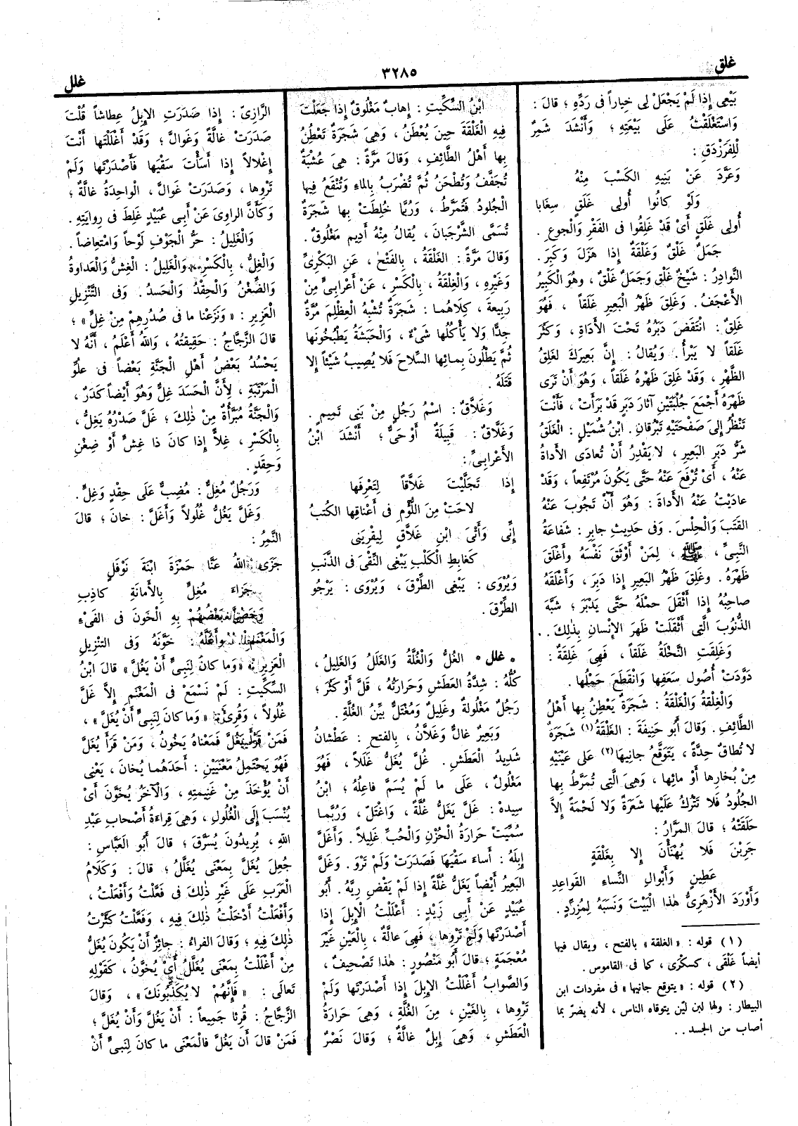 بَيْعي إذا لم يجعل لي خياراً في ردِّه قال واسْتَغْلَقتُ على بيعته وأَنشد شمر للفرزدق وعَرَّد عن بَنِيهِ الكَسْبَ منه ولو كانوا أُولي غَلَقٍ سِغَابا أُولي غَلَقٍ أي قد غَلِقُوا في الفقر والجوع جمل غَلْق وغَلْقَةٌ إذا هزل وكبر النوادر شيْخٌ غَلْقٌ وجمل غَلْقٌ وهو الكبير الأعْجَفُ وغَلِقَ ظهرُ البعير غَلَقاً فهو غَلِقٌ انتقض دَبَرهُ تحت الأَدَاةِ وكثُر غَلَقاً لا يبرأُ ويقال إن بعيرك لغَلِقُ الظهر وقد غَلِقَ ظهرهُ غَلَقاً وهو أَن ترى ظهره أَجْمَعَ جُلُْبَتَين آثار دبَرٍ قد برأَت فأَنت تنظر إلى صفحتيه تَبْرُقان ابن شميل الغَلَقُ شرُّ دَبَر البعير لا يقدر أن تُعادَى الأَداةُ عنه أي ترفع عنه حتى يكون مرتفعاً وقد عادَيْت عنه الأَداةَ وهو أن تجوب عنه القَتَب والحِلْس وفي حديث جابر شفاعة النبي صلى الله عليه وسلم لمن أوثَقَ نفسَه وأَغْلَقَ ظهرَه وغَلِقَ ظهرُ البعير إذا دَبِرَ وأَغْلَقَهُ صاحبه إذا أَثقل حمله حتى يَدْبَرَ شبه الذنوب التي أَثقلت ظهر الإنسان بذلك وغَلِقَت النخلة غَلَقاً فهي غَلِقةٌ دوَّدَتْ أُصول سَعَفها وانقطع حَمْلُها والغِلْقةُ والغَلْقةُ شجرة يَعْطِنُ بها أَهلُ الطائف وقال أَبو حنيفة الغَلْقة شجرة لا تطاق حِدَّة يَتَوَقَّعُ جانيها علي عينيه من بخارها أو مائها وهي التي تُمَرَّطُ بها الجلود فلا تترك عليها شعرة ولا لحمة إلاَّ حلقته قال المرار جَرِبْنَ فلا يُهْنَأْنَ إلاَّ بِغَلْقَةٍ عَطِينٍ وأَبوالِ النِّساءِ القَواعِدِ وأورد الأزهري هذا البيت ونسبه لمزَزَّدّ ابن السكيت إهَابٌ مَغْلُوق إذا جعلت فيه الغَلْقَة حين يُعْطَنُ وهي شجرة تَعْطِنُ بها أهل الطائف وقال مرة هي عشبة تجفَّف وتطحن ثم تُضْرَبُ بالماء وتنقع فيها الجلود فتمرّط وربما خلطت بها شجرة تسمى الشَّرْجَبان يقال منه أَديم مَغْلوق وقال مرة الغَلْقةُ بالفتح عن البكري وغيره والغِلْقَةُ بالكسر عن أَعرابي من ربيعة كلاهما شجرة تشبه العِظْلِمَ مُرَّة جدّاً ولا يأْكلها شيء والحبشة يطبخونها ثم يطلون بمائها السلاح فلا يصيب شيئاً إلا قتله وغَلاَّق اسم رجل من بني تميم وغَلاَّق قبيلة أَو حيّ أنشد ابن الأَعرابي إذا تَجَلَّيْتَ غَلاَّقاً لِتَعْرِقَها لاحَتْ من اللُّؤْمِ في أَعْناقها الكُتبُ إنِّي وأَتْيَ ابنِ غَلاَّقٍ لِيَقْرِيَني كغابط الكلب يَبْغي النِّقْيَ في الذَّنَبِ ويروى يبغي الطِّرْقَ ويروى يرجو الطِّرْق