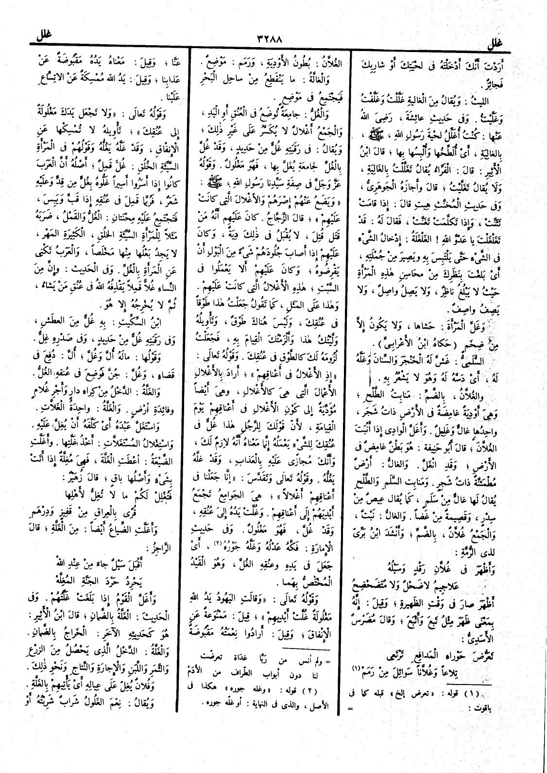 ( * قوله « وغله جوره » هكذا في الأصل والذي في النهاية أو غله جوره ) أَي جعل في يده وعنقه الغُلّ وهو القيد المختص بهما وقوله تعالى وقالت اليهود يَدُ الله مَغْلولة غُلَّت أَيديهم قيل ممنوعة عن الإِنفاق وقيل أَرادوا نعمتُه مقبوضة عنَّا وقيل معناه يَدُه مقبوضة عن عذابنا وقيل يدُ الله ممسكة عن الاتساع علينا وقوله تعالى ولا تجعلْ يدَك مغْلولة إِلى عنُقك تأْويله لا تُمْسِكها عن الإِنفاق وقد غَلَّه يَغُلُّه وقولهم في المرأَة السَّيِّئة الخُلُق غُلٌّ قَمِلٌ أَصله أَن العرب كانوا إِذا أَسَروا أَسيراً غَلُّوه بغُلّ من قِدّ وعليه شعر فربما قَمِلَ في عُنقه إِذا قَبّ ويبس فتجتمع عليه مِحْنَتان الغُلّ والقَمْل ضربه مثلاً للمرأَة السيئة الخُلق الكثيرة المَهْر لا يجد بَعْلها منها مخلصاً والعرب تكني عن المرأَة بالغُلّ وفي الحديث وإِن من النساء غُلاًّ قَمِلاً يقذِفه الله في عُنق من يشاء ثم لا يخرجه إِلا هو ابن السكيت به غُلّ من العطش وفي رقبته غُلّ من حديد وفي صدره غِلّ وقولها ما له أُلَّ وغُلَّ أُلَّ دُفِع في قضاء وغُلّ جُنّ فوضع في عُنقه الغُلّ والغَلّة الدَّخْل من كِراءِ دار وأَجْر غلام وفائدة أَرض والغَلَّة واحدة الغَلاَّت واستَغَلّ عبدَه أَي كلَّفه أَن يُغِلّ عليه واسْتِغْلال المُسْتَغَلاَّت أَخْذُ غَلّتها وأَغَلَّت الضَّيْعة أَعطت الغَلَّة فهي مُغِلَّة إِذا أَتت بشيء وأَصلها باقٍ قال زهير فتُغْلِلْ لكم ما لا تُغِلّ لأَهْلِها قُرىً بالعراق من قَفِيزٍ ودِرْهَم وأَغَلَّت الضِّياع أَيضاً من الغَلَّة قال الراجز أَقْبَل سَيْلٌ جاء من عِند الله يَحْرِدُ حَرْدَ الجَنَّةِ المُغِلَّهْ وأَغَلَّ القومُ إِذا بلغت غَلّتهم وفي الحديث الغَلَّة بالضَّمان قال ابن الأَثير هو كحديثه الآخر الخَراجُ بالضَّمان والغَلَّة الدَّخْل الذي يحصل من الزرع والثمر واللبن والإِجارة والنِّتاج ونحو ذلك وفلان يُغِلّ على عِياله أَي يأْتيهم بالغَلَّة ويقال نِعْم الغَلول شَراب شَرِبْتُه أَو