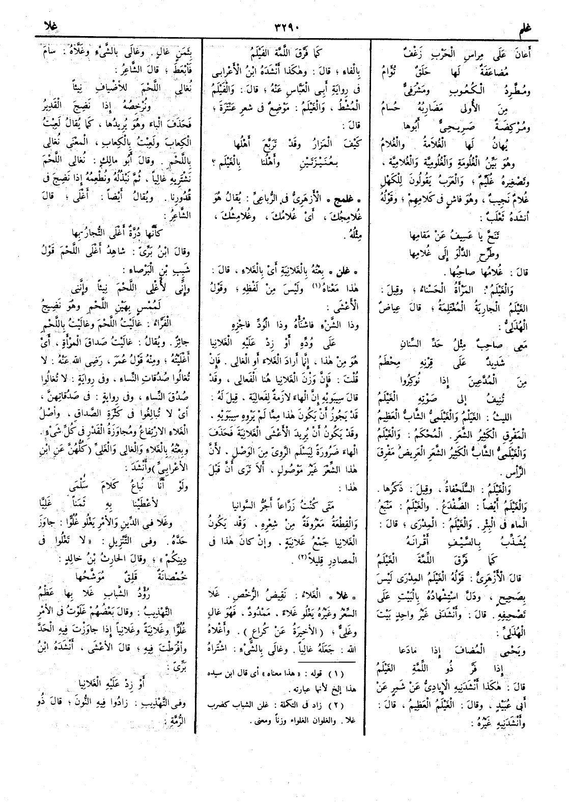 ( غلمج ) الأَزهري في الرباعي يقال هو غُلامِجُكَ أَي غُلامُك وغُلامِشُكَ مثلُه ( غلن ) بِعْتُه بالغَلانية أَي بالغَلاء قال هذا معناه وليس من لفظه وقول الأَعشى وذا الشَّنْءِ فاشْنَأْهُ وذا الوُدّ فاجْزِه على وُدِّه أَو زِدْ عليه الغَلانيا هو من هذا إِنما أَراد الغلاءَ أَو الغالي فإِن قلت فإِنّ وَزْنَ الغَلانيا هنا الفَعالي وقد قال سيبويه إِن الهاء لازمة لفَعالية قيل له قد يجوز أَن يكون هذا مما لم يروه سيبويه وقد يكون أَن يريد الأَعشى الغَلانية فحذف الهاء ضرورة ليسلم الرَّوِيّ من الوصل لأَن هذا الشعر غير موصول أَلا ترى أَن قبل هذا مَتى كُنْتُ زَرَّاعاً أَجُرُّ السَّوانيا والقطعة معروفة من شعره وقد يكون الغلانيا جمع غلانية وإن كان هذا في المصادر قليلاً