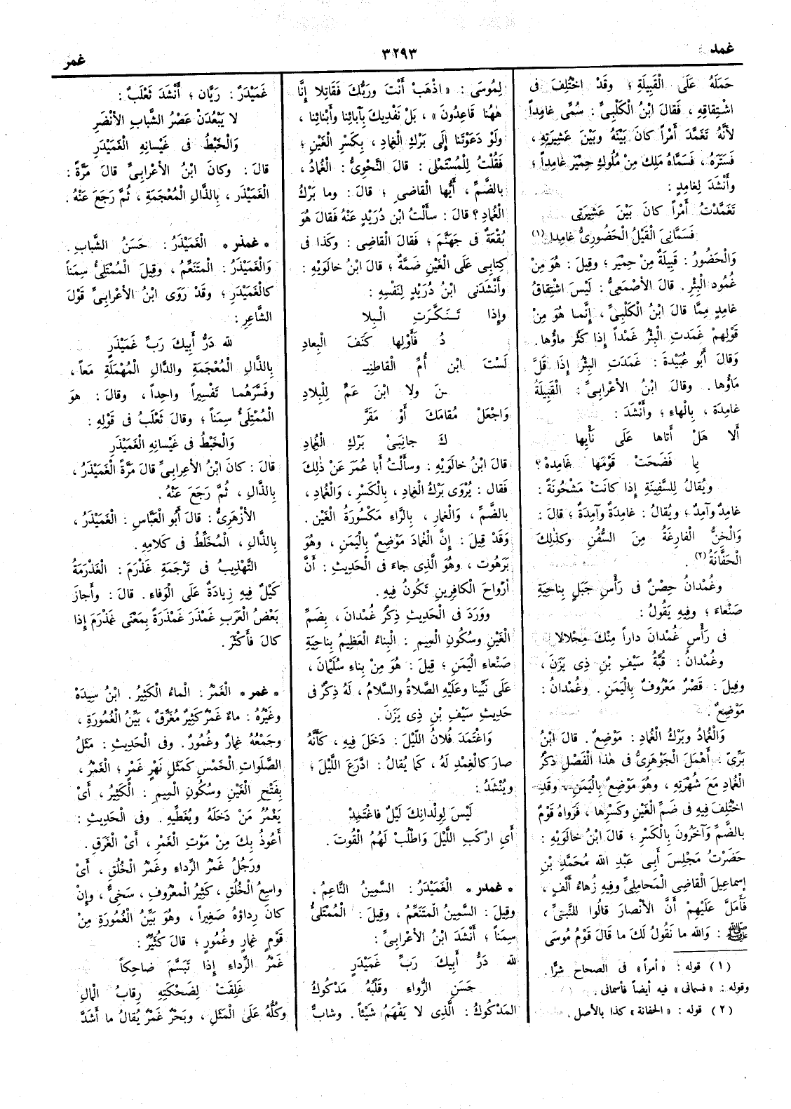 ( * قوله « الحفانة » كذا بالأصل ) وغُمْدان حِصْن في رأْس جبل بناحية صنعاء وفيه يقول في رأْسِ غُمْدانَ داراً منكَ مِحْلالا وغُمْدانُ قُبَّةُ سَيْفِ بن ذي يَزِن وقيل قصر معروف باليمن وغُمْدانُ موضع والغُمادُ وبَرْكُ الغُمادِ موضع قال ابن بري أَهمل الجوهري في هذا الفصل ذكر الغُمادِ مع شهرته وهو موضع باليمن وقد اختلف فيه في ضم الغين وكسرها رواه قوم بالضم وآخرون بالكسر قال ابن خالويه حضرت مجلس أَبي عبد الله محمد بن إِسمعيل القاضي المحاملي وفيه زُهاء أَلف فَأَمَلَّ عليهم أَن الأَنصار قالوا للنبي صلى الله عليه وسلم والله ما نقول لك ما قال قوم موسى لموسى اذهب أَنتَ وربك فقاتلا إِنا ههنا قاعدون بل نَفْدِيك بآبائتا وأَبنائنا ولو دعوتنا إِلى بَرْك الغِماد بكسر الغين فقلت للمستملي قال النحوي الغُماد بالضم أَيها القاضي قال وما بَرْكُ الغُماد ؟ قال سأَلت ابن دريد عنه فقال هو بقعة في جهنم فقال القاضي وكذا في كتابي على الغبن ضمة قال ابن خالويه وأَنشدني ابن دريد لنفسه وإِذا تَنَكَّرَتِ البِلا دُ فَأَولِها كَنَفَ البِعادِ لَسْتَ ابنَ أُمِّ القاطِنِي نَ ولا ابنَ عَمٍّ للبِلادِ واجْعَلْ مُقامَكَ أَو مَقَرَّ لَ جانِبَيْ بَرْكِ الغِمُادِ قال ابن خالويه وسأَلت أَبا عُمَر عن ذلك فقال يروى برك الغِماد بالكسر والغُماد بالضم والغِمار بالراء مكسورة الغين وقد قيل إِن الغماد موضع باليمن وهو بَرَهُوت وهو الذي جاء في الحديث أَن أَرواح الكافرين تكون فيه وورد في الحديث ذكر غُمْدانَ بضم الغين وسكون الميم البِناء العظيم بناحية صَنْعاءِ اليمن قيل هو من بناءِ سليمان على نبينا وعليه الصلاة والسلام له ذكر في حديث سيف بن ذي يَزَن واغْتَمدَ فلان الليل دخل فيه كأَنه صار كالغِمْدِ له كما يقال ادَّرَعَ الليلَ وينشد لَيْسَ لِوِلْدانِكَ لَيْلٌ فاغْتَمِدْ أَي اركب الليل واطلُبْ لهم القُوتَ