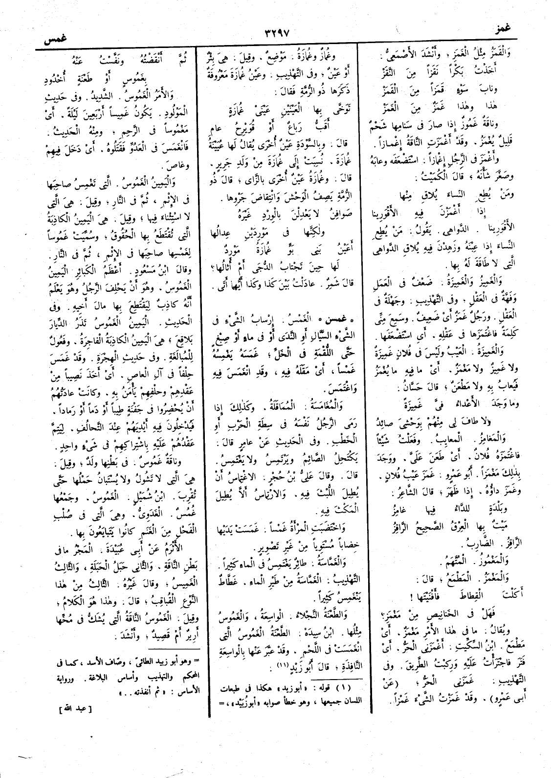 والقَمَزُ مثل الغَمَز وأَنشد الأَصمعي أَخَذْتُ بَكْراً نَقَزاً من النَّقَزْ ونابَ سَوْءٍ قَمَزاً من القَمَزْ هذا وهذا غَمَزٌ من الغَمَزْ وناقة غَمُوزٌ إِذا صار في سَنامِها شحم قليل يُغْمَزُ وقد أَغْمَزَتِ اناقة إِغْمازاً وأَغْمَزَ في الرجل إِغْمازاً استضعفه وعابه وصَغَّرَ شأْنه قال الكميت ومن يُطِعِ النّساءَ يُلاقِ منها إِذا أَغْمَزْنَ فيه الأَقْوَرِينا الأَقْوَرينا الدواهي يقول من يطع النساء إِذا عِبْنه وزَهِدْنَ فيه يلاقِ الدواهي التي لا طاقة له بها والغَمِيزُ والغَمِيزَةُ ضَعْفٌ في العملِ وفَهَّةٌ في العَقْل وفي التهذيب وجَهْلَة في العقل ورجل غَمَزٌ أَي ضعيف وسَمِعَ مني كلمةً فاغْتَمَزَها في عقله أَي استضعفها والغَمِيزة العَيْب وليس في فلان غَمِيزة ولا غَمِيزٌ ولا مَغْمَزٌ أَي ما فيه ما يُغْمَزُ فَيُعاب به ولا مَطْعَنٌ قال حسان وما وَجَدَ الأَعْداءُ فِيَّ غَمِيزَةً ولا طافَ لي منهم بِوَحْشِيَ صائِدُ والمَغامِزُ المعايب وفعلتُ شيئاً فاغْتَمَزَه فلانٌ أَي طَعَنَ عليّ ووجد بذلك مَغْمَزاً أَبو عمرو غَمَزَ عَيْبُ فلان وغَمَزَ داؤُه إِذا ظهر قال الشاعر وبَلْدَة لَلدَّاءُ فيها غامِزُ مَيْتٌ بها العِرْقُ الصحيحُ الرَّاقِزُ الرَّاقِزُ الضاربُ والمَغْمُوزُ المُتَّهَمُ والمَغْمَزُ المَطْمَعُ قال أَكَلْتَ القِطاطَ فأَفْنَيْتَها فهل في الخَنانِيصِ من مَغْمَزِ ؟ ويقال ما في هذا الأَمر مَغْمَزٌ أَي مَطْمَعٌ ابن السكيت أَغْمَزَني الحَرُّ أَي فَتَر فاجْتَرَأْتُ عليه وركبت الطريق وفي التهذيب غَمَزَني الحَرُّ عن أَبي عمرو وقد غَمَزْتُ الشيء غَمْزاً وغُمازٌ وغُمازَة موضع وقيل هي بئر أَو عين وفي التهذيب وعين غُمازَةَ معروفة ذكرها ذو الرمة فقال تَوَخَّى بها العَيْنَيْنِ عَيْنَيْ غُمازَة أَقَبُّ رَباعٌ أَو قُوَيْرِحُ عامِ قال وبالسَّوْدَةِ عين أُخرى يقال لها عُيَيْنَةُ غُمازَةَ نسبت إِلى غُمازَة من وَلَدِ جَرِير قال وغُمازَةُ عين أُخرى بالزاي قال ذو الرمة يصف الوحش وانتقاض جَرْوِها صَوافِنُ لا يَعْدِلْنَ بالوِرْدِ غَيْرَهُ ولكنها في مَوْردَيْنِ عِدالُها أَعَيْنُ بَني بَوٍّ غُمازَةُ مَوْرِدٌ لها حين تجْتابُ الدُّجَى أَم أُثالُها ؟ قال شمر عادلت بين كذا وكذا أَيُّهما أَتى