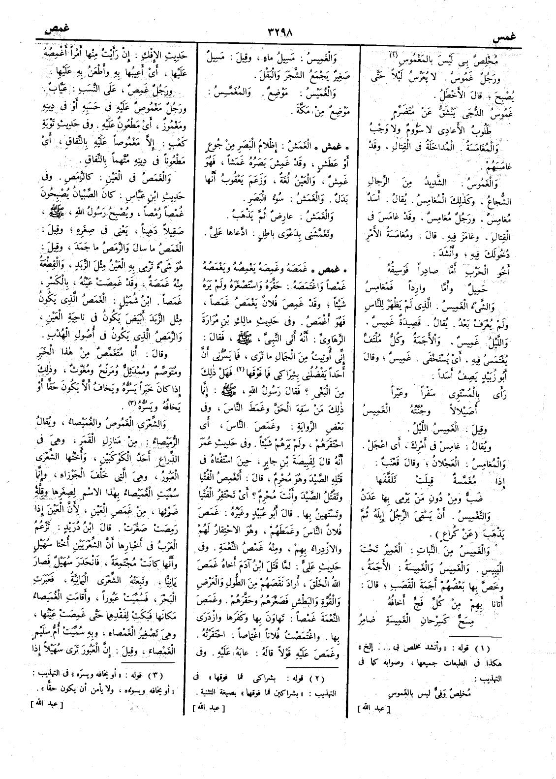 ( غمص ) غَمَصَه وغَمِصَه يَغْمِصُه ويَغْمَصُه غَمْصاً واغْتَمَصَه حَقَّرَه واسْتَصْغَره ولم يره شيئاً وقد غَمِصَ فلانٌ يَغْمَصُ غَمَصاً فهو أَغْمَصُ وفي حديث مالك بن مُرَارة الرَّهَاوِيّ أَنه أَتى النبيَّ صلّى اللّه عليه وسلّم فقال إِني أُوتِيتُ من الجَمالِ ما تَرى فما يسُرُّني أَن أَحداً يَفْضُلني بشِرَاكي فما فوقها فهل ذلك من البَغْي ؟ فقال رسول اللّه صلّى اللّه عليه وسلّم إِنما ذلك مَنْ سَفِهَ الحقَّ وغَمَطَ الناس وفي بعض الرواية وغَمَصَ الناسَ أَي احْتَقَرهم ولم يَرَهم شيئاً وفي حديث عمر أَنه قال لقَبِيصة بن جابر حين اسْتَفْتاه في قَتْلِه الصيدَ وهو مُحْرِم قال أَتَغْمِصُ الفُتْيا وتقْتُل الصيدَ وأَنتَ مُحْرم ؟ أَي تحتقر الفتيا وتَسْتَهِينُ بها قال أَبو عبيد وغيره غَمَصَ فلان الناس وغَمَطهم وهو الاحتقار لهم والازْدِراءُ بهم ومنه غَمْصُ النعمة وفي حديث عليّ لما قَتَلَ ابنُ آدمَ أَخاه غَمَصَ اللّهُ الخلقَ أَراد نَقَصَهم من الطول والعرض والقوّة والبَطْش فصغّرهم وحقَّرهم وغَمَصَ النعمة غَمْصاً تهاوَنَ بها وكفَرَها وازْدَرَى بها واغْتَمَصْت فلاناً اغْتِماصاً احتقرته وغَمَصَ عليه قولاً قاله عابَه عليه وفي حديث الإِفك إِن رأَيتُ منها أَمْراً أَغْمِصُه عليها أَي أَعِيبُها به وأَطْعَنُ به عليها ورجلٌ غَمِصٌ على النسب عَيّاب ورجل مَغْموص عليه في حَسبَه أَو في دِينِه ومَغْموزٌ أَي مطعون عليه وفي حديث توبة كعب إِلاَّ مَغْموصاً عليه بالنِّفَاق أَي مطعوناً في دِينه متَّهماً بالنفاق والغَمَصُ في العين كالرَّمَص وفي حديث ابن عباس كان الصبيان يُصْبِحُون غُمْصاً رُمْصاً ويُصْبِح رسولُ اللّه صلّى اللّه عليه وسلّم صَقِيلاً دَهِيناً يعني في صِغَره وقيل الغَمَصُ ما سالَ والرَّمَصُ ما جَمَدَ وقيل هو شيء تَرْمِي به العينُ مثل الزَّبَدِ والقطعة منه غَمَصة وقد غَمِصَت عينُه بالكسر غَمَصاً ابن شميل الغَمَصُ الذي يكون مثل الزبد أَبيض يكون في ناحية العين والرَّمَصُ الذي يكون في أُصول الهُدْب وقال أَنا مُتَغَمِّصٌ من هذا الخبر ومتوصِّمٌ ومُمْدَئِلٌّ ومرنّحٌ ومُغَوثٌ وذلك إِذا كان خبراً يسُرّه ويخاف أَن لا يكون حقّاً أَو يخافه ويسره والشِّعْرَى الغَمُوص والغُمَيْصاء ويقال الرميصاء من منازل القمر وهي في الذراع أَحد الكوكبين وأُخْتُها الشعرى العَبُور وهي التي خَلْف الجوزاءِ وإِنما سميت الغُمَيْصاء بهذا الاسم لصِغرَها وقلة ضوئها من غَمَصِ العين لأَن العين إِذا رَمِصَت صَغُرت قال ابن دريد تزعم العرب في أَخبارها أَن الشِّعْرَيَين أُخْتا سُهَيْلٍ وأَنها كانت مجتمعة فانحدَرَ سُهَيْلٌ فصار يمانيّاً وتَبِعَتْه الشعرى اليمانية فعَبَرت البحرَ فسُمِّيت عبُوراً وأَقامت الغُمَيصاءُ مكانَها فبَكَتْ لِفَقْدِهما حتى غَمِصت عينُها وهي تصغير الغَمْصاء وبه سميت أُم سليم الغَمْصاء وقيل إِن العَبُور ترى سُهَيلاً إِذا