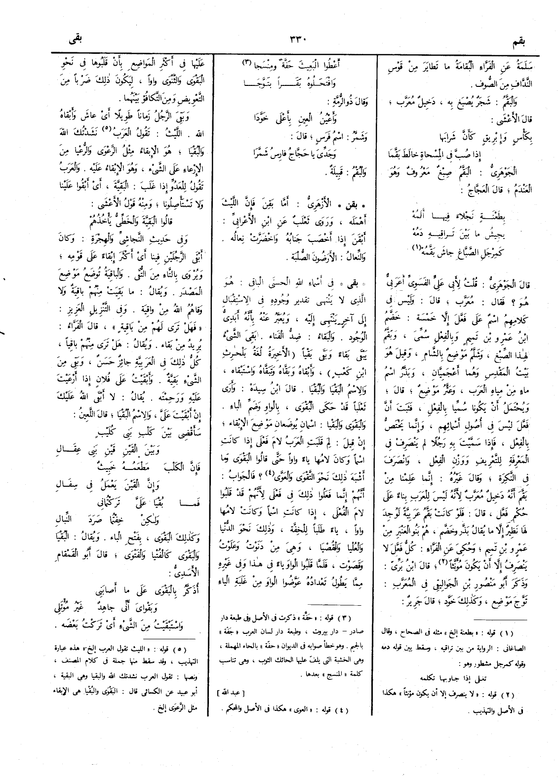 ( * قوله « الليث تقول العرب إلخ » هذه عبارة التهذيب وقد سقط منها جملة في كلام المصنف ونصها تقول العرب نشدتك الله والبقيا وهي البقية أبو عبيد عن الكسائي قال البقوى والبقيا هي الإبقاء مثل الرعوى إلخ ) نَشَدْتُك الله والبُقْيَا هو الإبقاء مثل الرَّعْوى والرُّعْيا من الإرْعاء على الشيء وهو الإبْقاء عليه والعرب تقول للعدوّ إذا غَلَبَ البَقِيَّةَ أَي أَبْقُوا علينا ولا تستأْصلونا ومنه قول الأَعشى قالوا البَقِيَّة والخَطِّيُّ يأْخُذُهم وفي حديث النجاشي والهجرة وكان أَبْقَى الرجلين فينا أَي أَكثر إبقاء على قومه ويروى بالتاء من التُّقى والباقِيةُ توضع موضع المصدر ويقال ما بَقِيَتْ منهم باقِيةٌ ولا وَقاهم الله من واقِيَة وفي التنزيل العزيز فهل تَرى لهم من باقية قال الفراء يريد من بَقاء ويقال هل ترى منهم باقياً كل ذلك في العربية جائز حسن وبَقِيَ من الشيء بَقِيَّةٌ وأَبْقَيْتُ على فلان إذا أَرْعَيْتَ عليه ورَحِمْتَه يقال لا أَبْقَى اللهُ عليك إن أَبْقَيْتَ عليَّ والإسم البُقْيَا قال اللَّعِين سَأَقْضِي بين كَلْبِ بَني كُلَيْبٍ وبَيْنَ القَيْنِ قَيْنِ بَني عِقَالِ فإنَّ الكلبَ مَطْعَمُه خَبيثٌ وإنَّ القَيْنَ يَعْمَلُ في سِفَالِ فما بُقْيَا عليّ ترَكْتُماني ولكنْ خِفْتُما صَرَدَ النِّبالِ وكذلك البَقْوى بفتح الباء ويقال البُقْيَا والبَقْوَى كالفُتْيا والفَتْوَى قال أَبو القَمْقام الأَسَدِيُّ أُذَكِّرُ بالبَقْوَى على ما أَصابَني وبَقْوايَ أَنِّي جاهِدٌ غَير مُؤتَلي واسْتَبْقَيتُ من الشيء أَي تركت بعضه