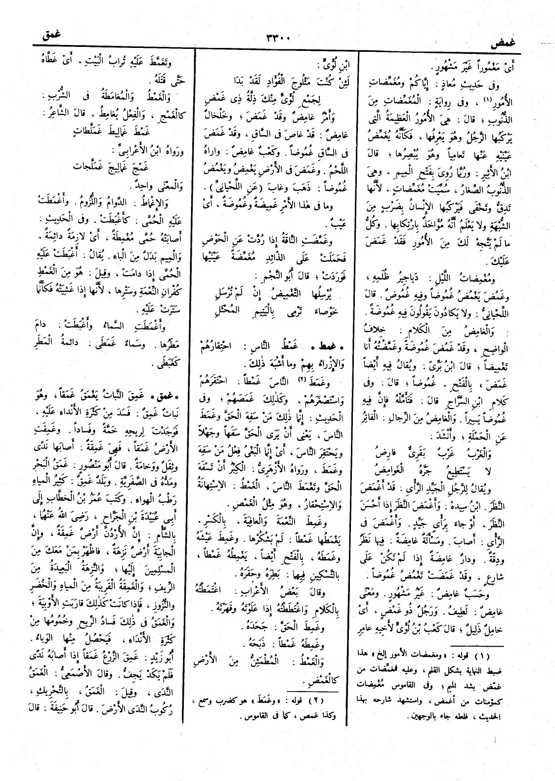 ( * قوله « ومغمضات الأمور إلخ » هذا ضبط النهاية بشكل القلم وعليه فمغمضات من غمض بشد الميم وفي القاموس مغمضات كمؤمنات من اغمض واستشهد شارحه بهذا الحديث فلعله جاء بالوجهين ) وفي رواية المُغَمِّضاتِ من الذنوب قال هي الأُمور العظيمة التي يَرْكَبُها الرجل وهو يعرفها فكأَنه يُغَمِّضُ عينيه عنها تَعامِياً وهو يُبْصِرُها قال ابن الأَثير وربما روي بفتح الميم وهي الذنوب الصغار سميت مُغَمِّضاتٍ لأَنها تَدِقُّ وتخفى فيركبها الإِنسان بِضَرْب من الشُّبْهة ولا يعلم أَنه مُؤاخذ بارتكابها وكلُّ ما لم يَتَّجِهْ لك من الأُمور فقد غَمَضَ عليك ومُغْمِضاتُ الليلِ دَياجِير ظُلَمِه وغَمُضَ يَغْمُضُ غُمُوضاً وفيه غُمُوضٌ قال اللحياني ولا يكادون يقولون فيه غُموضةٌ والغامِضُ من الكلام خلافُ الواضحِ وقد غَمُضَ غُموضةً وغَمَّضْتُه أَنا تَغْمِيضاً قال ابن بري ويقال فيه أَيضاً غَمَضَ بالفتح غَمُوضاً قال وفي كلام ابن السراج قال فتأَمله فإِنّ فيه غُمُوضاً يَسِيراً والغامِضُ من الرجال الفاتِرُ عن الحَمْلةِ وأَنشد والغَرْبُ غَرْبٌ بَقَرِيٌّ فارِضُ لا يَسْتَطيعُ جَرَّه الغَوامِضُ ويقال للرجل الجيِّدِ الرأْي قد أَغْمَضَ النظر ابن سيده وأَغْمَضَ النظر إِذا أَحْسَنَ النظر أَو جاء برأْي جيِّد وأَغْمَضَ في الرأْي أَصابَ ومسأَلة غامِضةٌ فيها نَظر ودِقّةٌ ودارٌ غامِضةٌ إِذا لم تكن على شارع وقد غَمَضَتْ تَغْمُضُ غُمُوضاً وحَسَبٌ غامِض غير مشهور ومعنىً غامِضٌ لطِيف ورجل ذُو غَمْضٍ أَي خامل ذلِيل قال كعب بن لؤيّ لأَخيه عامر بن لؤيّ لئن كنتَ مَثْلُوجَ الفُؤادِ لقد بَدَا لِجَمْعِ لُؤيٍّ منكَ ذِلَّةُ ذي غَمْضِ وأَمرٌ غامِض وقد غَمَضَ وخَلْخالٌ غامِض قد غاصَ في السَّاق وقد غَمَضَ في السَّاق غُموضاً وكعْبٌ غامِض واراه اللحم وغَمَضَ في الأَض يَغْمِضُ ويَغْمُضُ غُموضاً ذهَب وغاب عن اللحياني وما في هذا الأَمر غَمِيضةٌ وغُمُوضةٌ أَي عَيْب وغَمَّضَتِ الناقةُ إِذا رُدَّت عن الحَوْض فحمَلَت على الذّائد مُغمِّضة عَيْنَيْها فَوَرَدَت قال أَبو النجم يُرْسِلُها التغْمِيضُ إِنْ لم تُرْسَلِ خَوْصاء ترمي باليَتِيمِ المُحْثَلِ