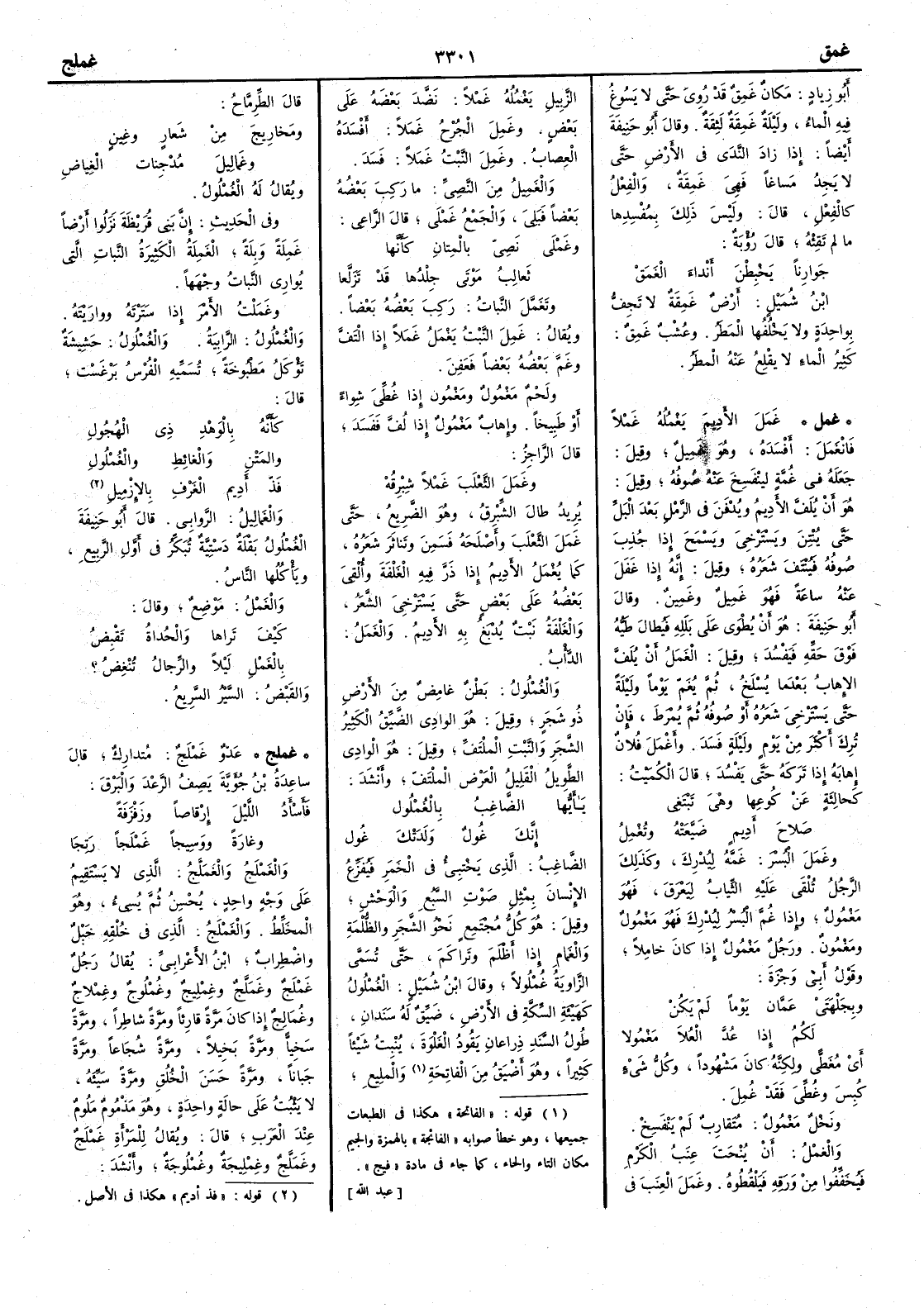 ( غمل ) غَمَلَ الأَدِيمَ يَغْمُله غَمْلاً فانْغَمَل أَفسده وهو غَمِيل وقيل جعله في غُمَّة لينفسخ عنه صوفه وقيل هو أَن يُلفَّ الأَديمُ ويدفَن في الرمل بعد البَلِّ حتى يُنْتِن ويسْتَرْخِي ويسْمَح إِذا جذب صوفه فينتَف شعره وقيل إِنه إِذا غفل عنه ساعة فهو غَمِيل وغَمِين وقال أَبو حنيفة هو أَن يطوى على بَلَلِه فيُطال طيّة فوق حقِّه فيفسد وقيل الغَمَل أَن يلفّ الإِهاب بعدما يسلَخ ثم يغمّ يوماً وليلة حتى يسترخي شعره أَو صوفه ثم يمرط فإِن ترك أَكثر من يوم وليلة فسد وأَغْمَلَ فلان إِهابه إِذا تركه حتى يفسد قال الكميت كَحالِئَةٍ عن كوعها وهي تبتغي صَلاحَ أَديمٍ ضَيَّعَته وتُغْمِل وغَمَل البُسْرَ غَمَّه ليُدرك وكذلك الرجل تلقى عليه الثياب ليَعرق فهو مَغْمول وإِذا غُمّ البسر ليدرك فهو مَغْمُول ومَغْمُون ورجل مَغْمول إِذا كان خاملاً وقول أَبي وجزة وبِجَلْهَتَيْ عَمَّان يوماً لم يكن لكمُ إِذا عُدّ العُلى مَغْمُولا أَي مغطّى ولكنه كان مشهوداً وكل شيء كُبِس وغطّي فقد غُمِل ونخل مَغْمول متقارب لم ينفسخ والغَمْل أَن ينحت عنب الكَرْم فيخفِّفوا من ورقه فيلقُطوه وغَمَل العنبَ في الزَّبيل يَغْمُله غَمْلاً نضّد بعضه على بعض وغَمِل الجُرح غَمَلاً أَفسده العِصاب وغَمِل النبتُ غَمَلاً فسد والغَمِيل من النَّصِيّ ما ركب بعضه بعضاً فبلي والجمع غَمْلى قال الراعي وغَمْلى نَصِيّ بالمِتانِ كأَنها ثَعالِب مَوْتى جلدُها قد تَزَلَّعا وتَغَمَّل النبات ركب بعضه بعضاً ويقال غَمِل النبت يَغْمَل غَمَلاً إِذا التف وغمّ بعضه بعضاً فعَفِن ولحم مَغْمول ومَغْمُون إِذا غطي شواء أَو طبيخاً وإِهاب مَغْمول إِذا لفّ ففسد قال الراجز وغَمَل الثعلبَ غَمْلاً شِبْرِقُهْ يريد طال الشِّبْرق وهن الضَّرِيع حتى غَمَل الثعلبَ وأَصلحه فسمن وتناثر شعره كما يُغْمَل الأَديم إِذا ذرّ فيه الغَلْفَة والقي بعضه على بعض حتى يسترخي الشعر والغَلْفَة نبت يدبغ به الأَديم والغَمَل الدأْب والغُمْلُول بطن غامض من الأَرض ذو شجر وقيل هو الوادي الضيّق الكثير الشجر والنبت الملتفّ وقيل هو الوادي الطويل القليل العَرْض الملتفّ وأَنشد يا أَيها الضَّاغِبُ بالغُمْلول إِنَّكَ غُولٌ ولَدَتْكَ غُول الضَّاغِب الذي يَخْتبئ في الخَمَرِ فيفزِّع الإِنسان بمثل صوت السبُع والوحش وقيل هو كل مجتمع نحو الشجر والظلمة والغَمام إِذا أَظلم وتَراكم حتى تسمى الزَّاوِية غُمْلُولاً وقال ابن شميل الغُمْلول كهيئة السِّكة في الأَرض ضيِّق له سَنَدان طول السَّنَدِ ذراعان يَقود الغَلْوة ينبت شيئاً كثيراً وهو أَضيق من الفاتِحة والمليع قال الطرماح ومَخارِيجَ من شَعارٍ وغِينٍ وغَمالِيل مُدْحِيات الغِياضِ