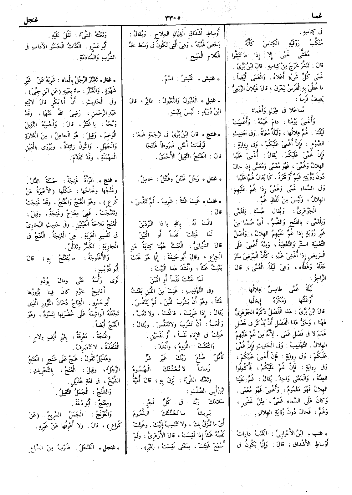 ( غنب ) ابن الأَعرابي الغُنَبُ داراتُ أَوساطِ الأَشْداقِ قال وإِنما يكون في أَوساط أَشداقِ الغِلْمانِ المِلاح ويقال بَخَصَ غُنْبَتَه وهي التي تكون في وَسَط خَدِّ الغُلام المَلِيح ( غنبش ) غَنْبَشٌ اسم ( غنبل ) الغُنْبُول والنُّغْبُول طائر قال ابن دريد ليس بثبت ( غنتج ) قال ابن بري في ترجمة ضعا فَوَلَدَتْ أَعْثَى ضَروطاً غَنْتَجَا قال الغَنْتَجُ الثقيل الأَحمق ( غنتل ) رجل غَنْتَل وغُنْتُل خامل ( غنث ) غَنِثَ غَنَثاً شَرِبَ ثم تَنَفَّس قال قالتْ له باللهِ يا ذا البُرْدَيْن لَمَّا غَنِثْتَ نَفَساً أَو اثْنَيْن قال الشيباني الغَنَثُ ههنا كناية عن الجماع وقال أَبو حنيفة إِنما هو غَنَثَ يَغْنِثُ غَنْثاً وأَنشد هذا البيت لَمَّا غَنَثَتْ نَفَساً أَو اثْنين وفي التهذيب غَنِثَ من اللبن يَغْنَثُ غَنَثاً وهو أَن يَشْرَبَ اللبنَ ثم يَتَنَفَّسَ يقال إِذا شَرِبْتَ فاغْنَثْ ولا تَعُبَّ والعَبُّ أَن تَشْرَبَ ولا تَتَنَفَّسَ ويقال غَنِثْتُ في الإِناء نَفَساً أَو نَفَسَين والتَّغَنُّثُ اللُّزوم وأَنشد تَأَمَّلْ صُنْعَ رَبِّكَ غَيْرَ شَرٍّ زَماناً لا تُغَنِّثْكَ الهُمومُ وتَغَنَّثه الشيءُ لَزِقَ به قال أُمية بن أَبي الصَّلْت سَلامَكَ رَبَّنا في كلأثُ فَجْرٍ بَريئاً ما تَغَنَّثُكَ الذُّمُومُ أَي ما تَلْزقُ بك ولا تَنْتَسِبُ إِليك وغَنِثَتْ نَفْسُه غَنَثاً إِذا لَقِسَتْ قال الأَزهري ولم أَسمع غَنِثَتْ بمعنى لَقِسَتْ لغيره وتَغَنَّثه الشيءُ ثَقُلَ عليه أَبو عمرو الغُنَّاثُ الحَسَنُو الآداب في الشُّرْب والمُنادمة ( غنثر ) تَغَنْثَرَ الرجلُ بالماء شربه عن غير شهوة والغُنْثُر ماء بعينه عن ابن جني وفي الحديث أَن أَبا بكر قال لابنه عبد الرحمن رضي الله عنهما وقد وَبَّخَه يا غُنْثَرُ قال وأَحسِبُه الثقيلَ الوَخِمَ وقيل هو الجاهل من الغَثارةِ والجَهْل والنون زائدة ويروى بالعين المهملة وقد تقدم ( غنج ) امرأَة غَنِجَة حسَة الدَّلّ وغُنْجُها وغُناجُها شَكْلُها الأَخيرة عن كراع وهو الغُنْجُ والغُنُجُ وقد غَنِجَتْ وتَغَنَّجَتْ فهي مِغْناجٌ وغَنِجَة وقيل الغُنْجُ مَلاحَة العَينين وفي حديث البخاري في تفسير العَرِبَةِ هي الغَنِجَةُ الغُنْجُ في الجارية تَكَسُّرٌ وتَدَلُّلٌ والأُغْنُوجَة ما يُتَغَنَّجُ به قال أَبو ذؤَيب لَوَى رأْسَه عَني ومالَ بِوُدِّهِ أَغانِيج خَوْدٍ كان فينَا يَزُورُها أَبو عمرو الغِنَاجُ دُخَان النُّؤورِ الذي تجعله الواشمة على خضرتها لِتَسْوَدَّ وهو الغُنْجُ أَيضاً وغُنَجَةُ معرِفة بغير أَلف ولامٍ القُنفُذَة لا تنصرف وهذيل تقول غَنَجٌ على شَنَجٍ الغَنَجُ الرجل وقيل الغَنَجُ بالتحريك الشيخ في لغة هذيل والشَّنَجُ الجمل الثقيل ومِغْنَج أَبو دُغَةَ والغَوْنَجُ الجمل السريع عن كراع قال ولا أَعرفها عن غيره
