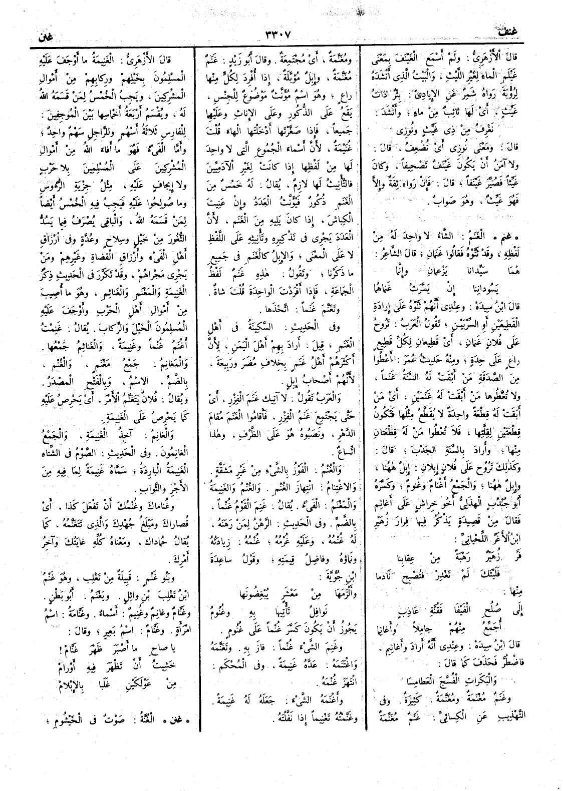 قال الأَزهري ولم أَسمع الغَيْنَف بمعنى غَيْلَم الماء لغير الليث والبيت الذي أَنشده لرؤبة رواه شمر عن الإيادِيّ بئر ذات غَيِّثٍ أَي لها ثائِبٌ من ماء وأَنشد نَغْرِفُ من ذي غَيِّثٍ ونُوزي قال ومعنى نُوزِي أَي نُضْعِفُ قال ولا آمَنُ أَن يكون غَيْنَفٌ تصحيفاً وكان غَيّثاً فصُيِّر غَيْنفاً قال فإن رواه ثقةٌ وإلا فهو غَيِّثٌ وهو صواب ( غنم ) الغَنَم الشاء لا واحد له من لفظه وقد ثَنَّوْه فقالوا غنَمانِ قال الشاعر هُمَا سَيِّدانا يَزْعُمانِ وإنَّما يَسُودانِنا إن يَسَّرَتْ غَنماهُما قال ابن سيده وعندي أَنهم ثنوه على إرادة القَطِيعين أو السِّرْبين تقول العرب تَرُوح على فلان غَنمانِ أي قطيعان لكل قَطِيع راع على حدة ومنه حديث عمر أَعْطُوا من الصَّدقة من أَبْقت له السنة غَنماً ولا تُعطوها من أَبقت له غَنمَيْنِ أي من أَبقت له قِطعةً واحدة لا يُقَطَّعُ مثلها فتكون قِطْعتين لقلتها فلا تُعطوا من له قطعتان منها وأَراد بالسَّنة الجَدْب قال وكذلك تروح على فلان إبلان إبل ههنا وإبل ههنا والجمع أَغْنام وغُنوم وكسَّره أَبو جندب الهذلي أَخو خِراش على أَغانِم فقال من قصيدة يذكر فيها فِرار زُهير بن الأَغرّ اللحياني فَرَّ زُهَيْرٌ رَهْبةً مِن عِقابنا فَلَيْتَكَ لم تَغْدِرْ فتُصْبِح نَادما منها إلى صلح الفَيْفَا فَقُنَّةِ عَاذِبٍ أُجَمِّعُ منهم جامِلاً وأَغانِما قال ابن سيده وعندي أَنه أَراد وأَغانيم فاضطر فحذف كما قال والبَكَراتِ الفُسَّجَ العَطامِسَا وغَنَم مُغْنَمةٌ ومُغَنَّمَة كثيرة وفي التهذيب عن الكسائي غنم مُغَنِّمة ومُغَنَّمَة أي مُجتمعة وقال أَبو زيد غنم مُغَنَّمة وإبل مُؤبَّلة إذا أُفرد لكل منها راع وهو اسم مؤنث موضوع للجنس يقع على الذكور وعلى الإناث وعليهما جميعاً فإذا صغرتها أَدخلتها الهاء قلت غُنَيْمة لأَن أَسماء الجموع التي لا واحد لها من لفظها إذا كانت لغير الآدميين فالتأْنيث لها لازم يقال له خمس من الغنم ذكور فيؤنث العدد وإن عنيت الكِباش إذا كان يليه من الغنم لأَن العدد يجري في تذكيره وتأْنيثه على اللفظ لا على المعنى والإبل كالغنم في جميع ما ذكرنا وتقول هذه غنم لفظ الجماعة فإذا أَفردت الواحدة قلت شاة وتَغَنَّم غَنَماً اتخذها وفي الحديث السَّكِينةُ في أَهل الغَنَم قيل أراد بهم أَهل اليمن لأن أَكثرهم أَهل غنم بخلاف مُضر ورَبيعة لأَنهم أَصحاب إبل والعرب تقول لا آتيك غَنَمَ الفِزْرِ أَي حتى يجتمع غنم الفزر فأَقاموا الغنم مقام الدهر ونصبوه هو على الظرف وهذا اتساع والغُنْم الفَوْز بالشي من غير مشقة والاغتِنام انتهاز الغُنم والغُنم والغَنِيمة والمَغْنم الفيء يقال غَنِمَ القَوم غُنْماً بالضم وفي الحديث الرَّهْن لمن رَهَنه له غُنْمه وعليه غُرْمه غُنَّمه زيادته ونَماؤه وفاضل قيمته وقول ساعدة بن جُؤية وأَلزمَهَا من مَعْشَرٍ يُبْغِضُونها نَوافِلُ تأْتيها به وغُنومُ يجوز أَن يكون كسَّر غُنْماً على غُنوم وغَنِم الشيءَ غُنْماً فاز به وتَغَنَّمه واغْتَنَمه عدّه غَنِيمة وفي المحكم انتهز غُنْمه وأَغْنَمه الشيءَ جعله له غَنِيمة وغَنَّمته تَغْنِيماً إذا نفَّلته قال الأَزهري الغَنِيمة ما أَوجَف عليه المسلمون بخيلهم وركابهم من أَموال المشركين ويجب الخمس لمن قَسَمه الله له ويُقسَم أَربعةُ أخماسها بين المُوجِفين للفارس ثلاثة أَسهم وللراجل سهم واحد وأَما الفَيء فهو ما أَفاء الله من أَموال المشركين على المسلمين بلا حرب ولا إيجاف عليه مثل جِزية الرؤوس وما صُولحوا عليه فيجب فيه الخمس أَيضاً لمن قسمه الله والباقي يصرف فيما يَسُد الثغور من خيل وسلاح وعُدّة وفي أَرزاق أَهل الفيء وأَرزاق القضاة ومن غيرهم ومن يجري مَجراهم وقد تكرر في الحديث ذكر الغنيمة والمَغنم والغنائم وهو ما أُصيب من أَموال أهل الحرب وأَوجَف عليه المسلمون الخيل والركاب يقال غَنِمت أَغْنَم غُنماً وغَنيمة والغنائم جمعها والمَغانم جمع مَغْنم والغنم بالضم الاسم وبالفتح المصدر ويقال فلان يتغنم 
