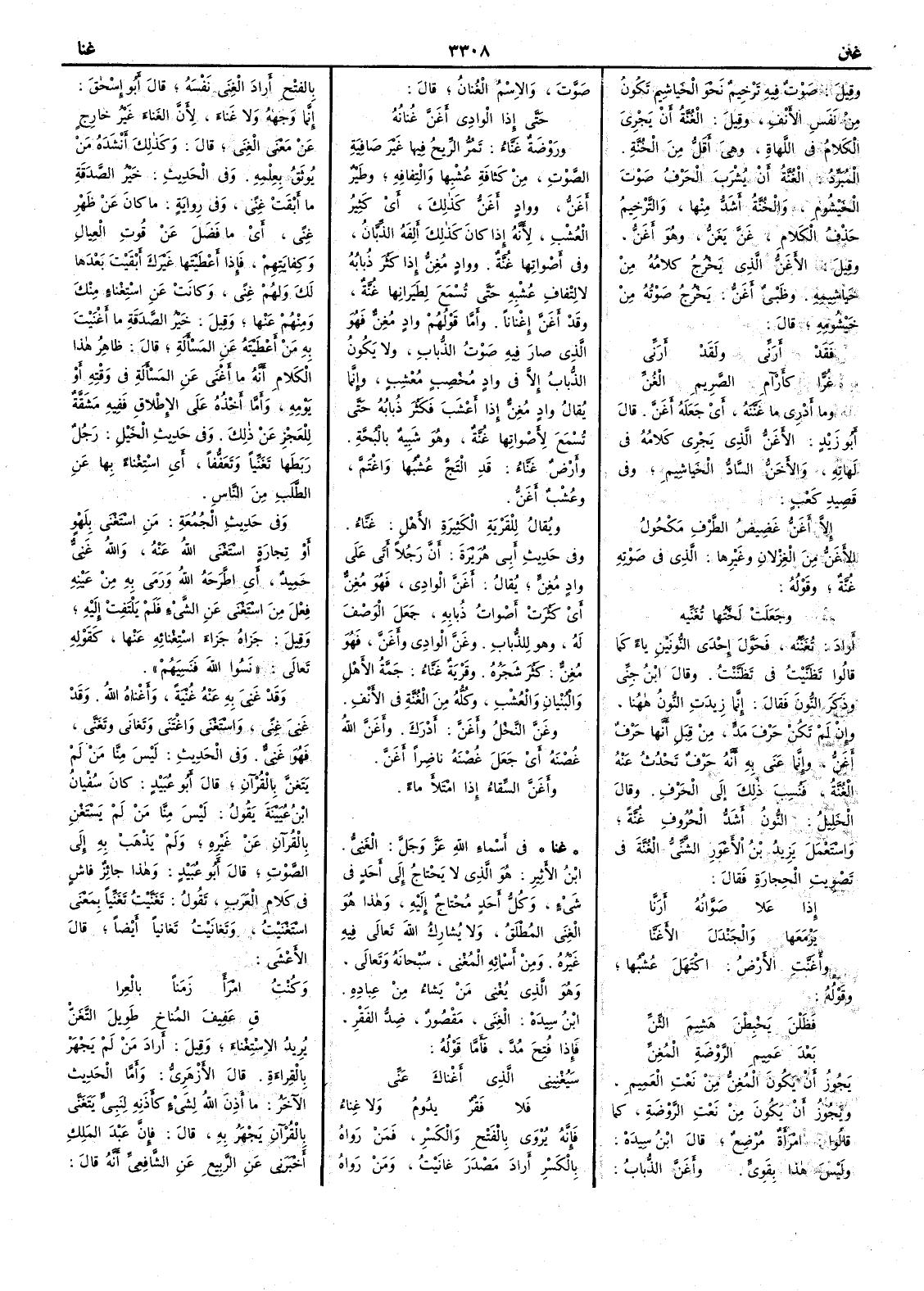 وقيل صوت فيه ترخيمٌ نحوَ الخياشيم تكون من نفس الأَنف وقيل الغُنَّة أَن يجري الكلامُ في اللَّهاةِ وهي أَقل من الخُنَّة المبرد الغُنَّة أَن يُشْرَبَ الحرفُ صوتَ الخيشوم والخُنَّة أَشد منها والترخيم حذف الكلام غَنَّ يَغَنُّ وهو أغنُّ وقيل الأَغَنُّ الذي يخرج كلامه من خياشيمه وظبي أَغَنُّ يخرج صوته من خَيْشومه قال فقد أَرَنِّي ولقد أَرَنِّي غُرّاً كأَرْآم الصَّرِيمِ الغُنِّ وما أَدري ما غَنَّنَهُ أَي جعله أَغَنَّ قال أَبو زيد الأَغَنُّ الذي يجري كلامه في لَهاته والأَخَنُّ السادُّ الخياشيم وفي قصيد كعب إِلاَّ أَغَنّ غَضِيض الطَّرْفِ مكحولُ الأَغَنُّ من الغِزْلانِ وغيرها الذي صوته غُنَّة وقوله وجَعَلَتْ لَخَّتُها تُغَنِّيه أَراد تُغَنِّنُه فحوَّل إحدى النونين ياء كما قالوا تَظَنَّيْتُ في تظننت وقال ابن جني وذكر النون فقال إنما زيدت النون ههنا وإن لم تكن حرف مدّ من قبل أَنها حرف أَغنّ وإِنما عنى به أَن حرف تحدث عنه الغُنَّة فنسب ذلك إلى الحرف وقال الخليل النون أَشَدُّ الحروف غنة واستعمل يزيدُ بنُ الأَعْور الشَّنِّيُّ الغُنَّةَ في تصويت الحجارة فقال إذا عَلا صَوَّانُهُ أَرَنَّا يَرْمَعَها والجَنْدَلَ الأَغَنَّا وأَغَنَّتِ الأَرضُ اكْتَهل عُشْبُها وقوله فظَلْنَ يَخْبِطْنَ هَشِيمَ الثِّنِّ بعدَ عَمِيمِ الرَّوْضَةِ المُغِنِّ يجوز أَن يكون المُغِنُّ من نَعْتِ العَميم ويجوز أَن يكون من نعت الروضة كما قالوا امرأَة مُرْضِعٌ قال ابن سيده وليس هذا بقوي وأَغَنَّ الذُّبابُ صَوَّت والاسم الغُنانُ قال حتى إذا الوادي أَغَنَّ غُنانُه وروضة غَنَّاءُ تمرّ الريح فيها غَيْرَ صافيةِ الصَّوْت من كَثافةِ عُشْبِها والتفافِه وطيرٌ أَغَنُّ ووادٍ أَغَنُّ كذلك أَي كثير العُشْبِ لأَنه إذا كان كذلك أَلفه الذِّبَّانُ وفي أَصواتها غُنَّة ووادٍ مُغِنٌّ إذا كثر ذبابه لالتفاف عُشبه حتى تسمع لطيرانها غُنَّة وقد أَغَنَّ إِغْناناً وأَما قولهم وادٍ مُغِنٌّ فهو الذي صار فيه صوتُ الذباب ولا يكون الذباب إلاّ في وادٍ مُخْصِبٍ مُعْشِبٍ وإِنما يقال وادٍ مُغِنٌّ إِذا أَعْشَبَ فكثر ذُبابه حتى تسمع لأَصواتها غُنَّة وهو شبيه بالبُحَّة وأَرض غَنَّاءُ قد الْتَجَّ عُشْبُها واغْتَمَّ وعُشْبٌ أَغَنُّ ويقال للقرية الكثيرة الأَهل غَنَّاء وفي حديث أَبي هريرة أَن رجلاً أَتى على وادٍ مُغِنٍّ يقال أَغَنَّ الوادي فهو مُغِنٌّ أَي كثرت أَصواتُ ذُبابه جعل الوصف له وهو للذباب وغَنَّ الوادي وأَغَنَّ فهو مُغِنٌّ كثر شجره وقرية غَنَّاء جَمَّةُ الأَهل والبُنْيان والعُشْب وكله من الغُنَّةِ في الأَنف وغَنَّ النخل وأَغَنَّ أَدْرك وأَغَنَّ اللهُ غُصْنَه أَي جعل غُصْنَه ناضِراً أَغَنَّ وأَغَنَّ السِّقاءُ إذا امتلأَ ماء ( غنا ) في أَسْماء الله عز وجل الغَنِيُّ ابن الأثير هو الذي لا يَحْتاجُ إلى أَحدٍ في شيءٍ وكلُّ أَحَدٍ مُحْتاجٌ إليه وهذا هو الغِنى المُطْلَق ولا يُشارِك الله تعالى فيه غيرُهُ ومن أَسمائه المُغْني سبحانه وتعالى وهو الذي يُغني من يشاءُ من عِباده ابن سيده الغنى مقصورٌ ضدُّ الفَقْر فإذا فُتِح مُدَّ فأَما قوله سَيُغْنِيني الذي أَغْناكَ عني فلا فَقْرٌ يدوُمُ ولا غِناءٌ فإنه يُروى بالفتح والكسر فمن رواه بالكسر أَراد مصدَرَ غانَيْت ومن رواه بالفتح أَراد الغِنى نَفْسه قال أَبو اسحق إنما وَجْهُه ولا غَناء لأَن الغَناء غيرُ خارجٍ عن معنى الغِنى قال وكذلك أَنشده من يُوثَقُ بعِلْمِه وفي الحديث خيرُ الصَّدَقَةِ ما أَبْقَتْ غِنًى وفي رواية ما كان عن ظَهْرِ غِنًى أَي ما فَضَل عن قُوت العيال وكِفايتِهِمْ فإذا أَعْطَيْتَها غَيْرَك أَبْقَيْتَ بعدَها لكَ ولهُم غِنًى وكانت عن اسْتِغْناءٍ منكَ ومِنْهُم عَنْها وقيل خيرُ الصَّدَقَة ما أَغْنَيْتَ به مَن أَعْطَيْته عن المسأَلة قال ظاهر هذا الكلامِ أَنه ما أَغْنى عن المَسْأَلة في وقْتِه أَو يَوْمِه وأَما أَخْذُه على الإطلاق ففيه مَشقَّة للعَجْز