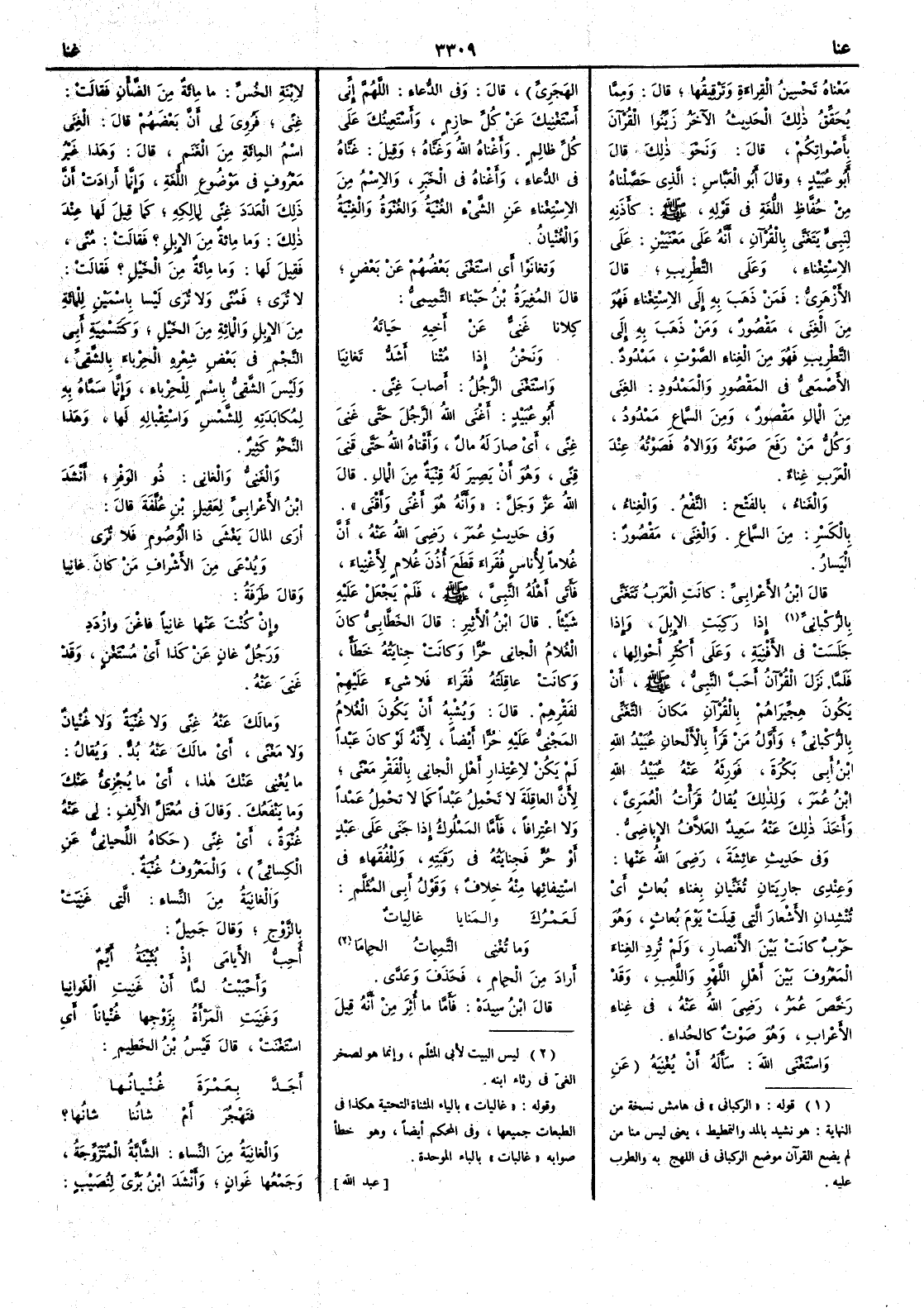 إذا رَكِبَت الإبلَ وإذا جَلَست في الأفْنِية وعلى أَكثر أَحوالها فلمَّا نَزَلَ القرآنُ أَحبَّ النبيُّ صلى الله عليه وسلم أَن يكون هِجِّيرَاهُم بالقرآن مكانَ التَّغَنِّي بالرُّكْبانيِّ وأَوْلُ مَن قرَأَ بالأَلحانِ عُبَيْدُ اللهِ بنُ أبي بَكْرة فَوَرِثَه عنه عَبَيْدُ الله بنُ عُمر ولذلك يقال قرأْتُ العُمَرِيَّ وأَخَذ ذلك عنه سعيدٌ العَلاَّفُ الإباضيُّ وفي حديث عائشة رضي الله عنها وعندي جارِيتان تُغَنِّيانِ بغِناءِ بُعاثَ أَي تُنْشِدانِ الأشعارَ التي قيلَتْ يومَ بُعاث وهو حربٌ كانت بين الأنصار ولم تُرِدِ الغِناء المعروفَ بين أَهلِ اللَّهْوِ واللَّعِبِ وقد رَخَّصَ عمر رضي الله عنه في غناءِ الأعرابِ وهو صوتٌ كالحُداءِ واسْتَغْنَى اللهَ سأَله أَن يُغْنِيهَ عن الهَجَري قال وفي الدعاء اللهمَّ إني أَسْتَغْنِيكَ عن كلِّ حازِمٍ وأَسْتَعِينُك على كلِّ ظالِمٍ وأَغْناهُ اللهُ وغَنَّاه وقيل غَنَّاه في الدعاء وأَغْناه في الخبر والاسم من الاستغناء عن الشيء الغُنْيَة والغُنْوة والغِنْية والغُنْيانُ وتَغانُوا أَي استغنى بعضهم عن بعض قال المُغيرة ابن حَبْناء التَّميمي كِلانا غَنِيٌّ عن أَخِيه حَياتَه ونَحْنُ إذا مُتْنا أَشَدُّ تَغانِيَا واستغنى الرجلُ أَصابَ غِنًى أَبو عبيد أَغْنَى اللهُ الرجلَ حتى غَنِيَ غِنًى أَي صار له مالٌ وأًقناه اللهُ حتى قَنِيَ قِنًى وهو أَن يَصيرَ له قِنيةٌ من المال قال الله عز وجل وأَنّهُ هو أَغْنَى وأَقْنى وفي حديث عمر رضي الله عنه أَنَّ غُلاماً لأَناسٍ فُقِراء قَطَع أُذُنَ غُلامٍ لأَغْنِياءَ فأَتَى أَهلُه النبي صلى الله عليه وسلم فلم يَجْعَلْ عليه شيئاً قال ابن الأثير قال الخطَّابي كانَ الغلامُ الجاني حُرًّا وكانت جِنايتُه خَطَأَ وكانت عاقِلَتُه فقراءَ فلا شيء عليهم لفَقْرِهم قال ويُشْبِه أَن يكون الغلامُ المَجْنيّ عليه حُرًّا أَيضاً لأنه لو كان عبداً لم يكن لاعتذارِ أَهلِ الجاني بالفَقْرِ معنًى لأن العاقلة لا تَحْمِلُ عبداً كما لا تحْمِلُ عَمْداً ولا اعترافاً فأمّا المَمْلوك إذا جنَى على عَبْدٍ أو حُرٍّ فجنايَتُه في رَقَبَتِه وللفُقهاء في اسْتِيفائها منه خلافٌ وقول أبي المُثَلّم