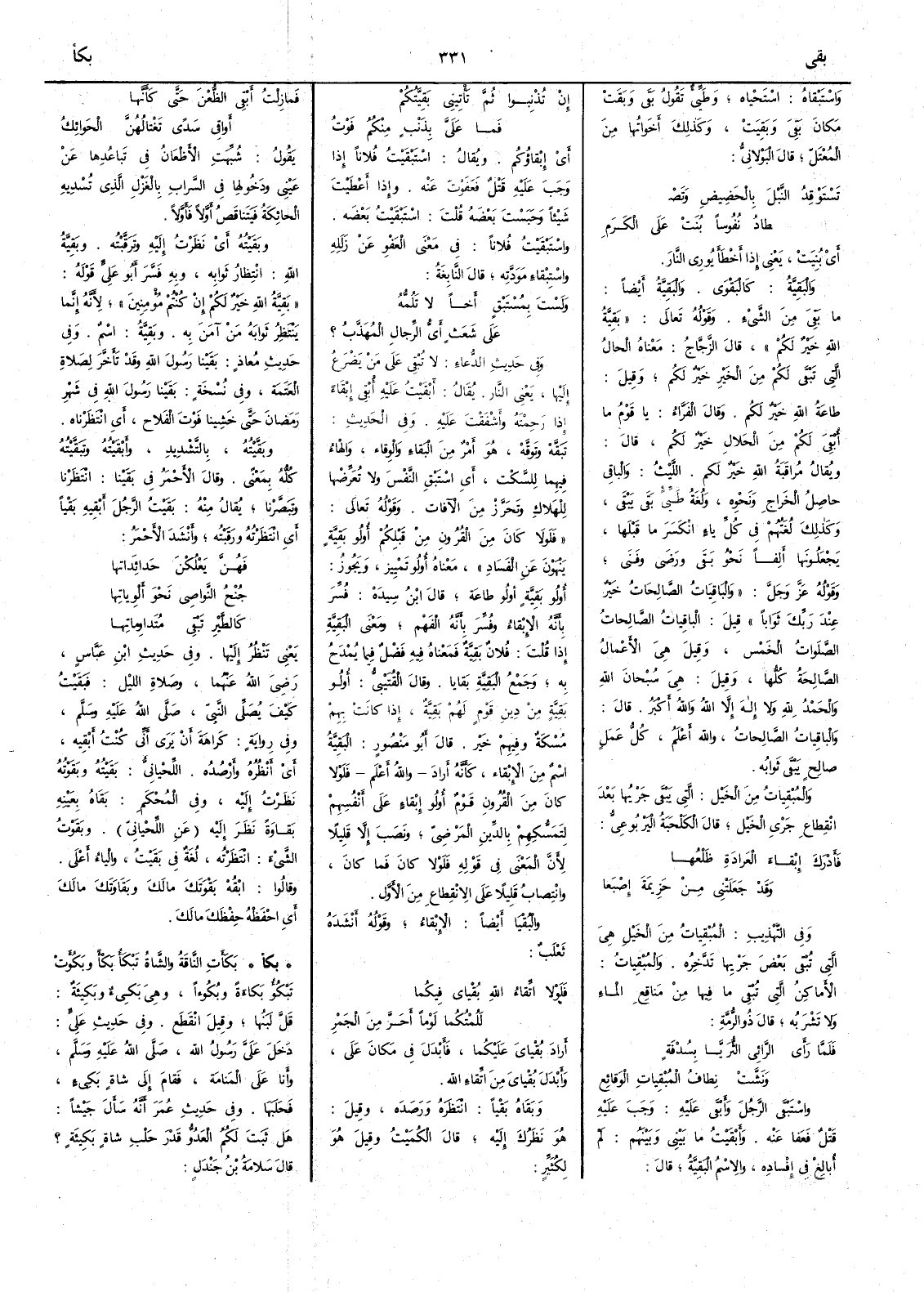 واسْتبقاه اسْتَحْياه وطيِّءٌ تقول بَقَى وبَقَتْ مكان بَقِيَ وبَقيَتْ وكذلك أَخواتها من المعتل قال البَولاني تَسْتَوْقِدُ النَّبْلَ بالحَضِيضِ وتَصْ طادُ نُفُوساً بُنَتْ على الكَرَمِ أَي بُنِيَتْ يعني إذا أَخطأَ يُورِي النارَ والبقيَّةُ كالبَقْوَى والبِقيَّة أَيضاً ما بقي من الشيء وقوله تعالى بَقِيَّةُ الله خير لكم قال الزجاج معناه الحالُ التي تبقى لكم من الخير خير لكم وقيل طاعة الله خير لكم وقال الفراء يا قوم ما أُبقي لكم من الحلال خير لكم قال ويقال مراقبة الله خير لكم الليث والباقي حاصل الخَراج ونحوه ولغة طيء بَقَى يَبْقى وكذلك لغتهم في كل ياء انكسر ما قبلها يجعلونها أَلفاً نحو بَقَى ورَضَى وفَنَى وقوله عز وجل والباقياتُ الصالحاتُ خير عند ربك ثواباً قيل الباقيات الصالحات الصلوات الخمس وقيل هي الأَعمال الصالحة كلها وقيل هي سبحان الله والحمد لله ولا إله إلا الله والله أَكبر قال والباقيات الصالحات والله أَعلم كل عمل صالح يَبْقَى ثوابه والمُبْقِياتُ من الخيل التي يَبْقَى جَريُها بعد انقطاع جَرْي الخيل قال الكَلْحَبةُ اليَرْبوعِيُّ فأَدْرَكَ إبْقاءَ العَرادَةِ ظَلْعُها وقد جَعَلَتْني من حزِيمةَ إصْبَعا وفي التهذيب المُبْقِياتُ من الخيل هي التي تُبْقِي بعضَ جَريها تَدَّخِره والمُبْقِياتُ الأَماكن التي تُبقِى ما فيها من مناقع الماء ولا تشربه قال ذو الرمة فلما رَأَى الرَّائي الثُّرَيَّا بسُدْفةٍ ونَشَّتْ نِطافُ المُبْقِياتِ الوقائع واسْتَبْقى الرجلَ وأَبقى عليه وجب عليه قتل فعفا عنه وأَبْقيْتُ ما بيني وبينهم لم أُبالغ في إفساده والإسم البَقِيَّةُ قال إنْ تُذْنِبُوا ثم تأْتِيني بَقِيَّتُكم فما عليَّ بذَنْبٍ منكُم فَوْتُ أَي إبقاؤكم ويقال اسْتَبْقَيْتُ فلاناً إذا وجب عليه قتل فعفوت عنه وإذا أَعطيت شيئاً وحَبَسْتَ بعضَه قلت استبقيت بعضه واسْتَبْقَيْتُ فلاناً في معنى العفو عن زلله واسْتِبْقاء مودَّته قال النابغة ولَسْتَ بمُسْتَبْقِ أَخاً لا تَلُمُّه على شَعَثٍ أَيُّ الرجالِ المُهَذَّبُ ؟ وفي حديث الدعاء لا تُبْقِي على من يَضْرَعُ إليها يعني النار يقال أَبْقَيْت عليه أُبْقِي إبْقاءً إذا رحمته وأَشفقت عليه وفي الحديث تَبَقَّهْ وتوَقَّهْ هو أَمر من البقاء والوِقاء والهاء فيهما للسكت أَي اسْتَبْق النفسَ ولا تُعَرِّضْها للهَلاك وتحرّز من الآفات وقوله تعالى فلولا كان من القرون من قبلكم أُولو بَقِيَّة ينهون عن الفساد معناه أُولو تمييز ويجوز أُولوا بقية أُولو طاعة قال ابن سيده فسر بأَنه الإبقاء وفسر بأَنه الفَهْم ومعنى البَقِيَّة إذا قلت فلان بَقِيَّة فمعناه فيه فَضْل فيما يُمْدَحُ به وجمع البَقِيَّة بقايا وقال القتيبي أُولو بَقِيَّة من دِينِ قوم لهم بَقِيَّة إذا كانت بهم مُسْكَة وفيهم خير قال أَبو منصور البَقيَّة اسم من الإبْقاء كأَنه أَراد والله أَعلم فلولا كان من القرون قوم أُولوا إبقاء على أَنفسهم لتمسكهم بالدين المرضي ونصب إلا قليلاً لأَن المعنى في قوله فلولا كان فما كان وانتصاب قليلاً على الانقاع من الأَول والبُقْيَا أَيضاً الإبْقاءُ وقوله أَنشده ثعلب فلولا اتِّقاءُ الله بُقْيايَ فيكما لَلُمْتُكما لَوْماً أَحَرَّ من الجَمْرِ أَراد بُقْيايَ عليكما فأَبدل في مَكانَ على وأَبدل بُقْيايَ من اتقاء الله وبَقَاهُ بَقْياً انتظره ورَصَدَه وقيل هو نظرك إليه قال الكُمَيْت وقيل هو لكثير فما زلْتُ أَبْقِي الظُّعْنَ حتى كأَنها أَواقِي سَدىً تَغْتالهُنَّ الحَوائِكُ يقول شبهت الأَظْعَان في تباعدها عن عيني ودخولها في السراب بالغزل الذي تُسْديه الحائكةُ فيتناقص أَوَّلاً فأَوّلاً وبَقَيْتُه أَي نظرت إليها وترقبته وبَقِيَّةُ الله انتظارُ ثوابه وبه فسر أَبو عليّ قوله بقيةُ الله خير لكم إن كنتم مؤمنين لأَنه وإنما ينتظر ثوابه من آمن به وبَقِيَّةُ اسم وفي حديث معاذ بَقَيْنا رسولَ الله وقد تأَخر لصلاة العَتَمة وفي نسخة بَقَيْنا رسولَ الله ف