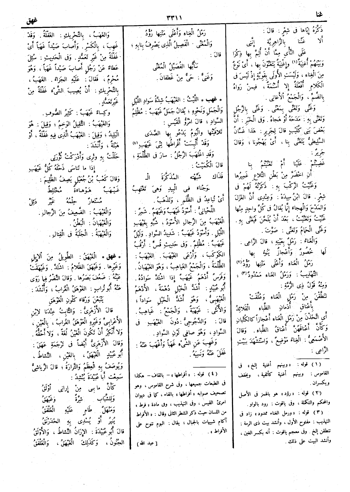 ( غهق ) الغَيْهق الطويل من الإِبل وغيرها وغَيْهَقَ الظلامُ اشتدَّ وغَيْهَقَتْ عينُه ضعف بصرها وقال النضر فيما روى عنه أَبو تراب الغَوْهَقُ الغراب وأَنشد يَتْبَعْنَ ورْقاء كلَوْنِ الغَوْهَقِ قال الأَزهري والثابت عندنا لابن الأَعرابي وغيره العَوْهَقُ الغراب بالعين ولا أُنكر أَن تكون الغين لغة ولا أَحقه وقال الأَزهري أَيضاً في ترجمة عهق أََبو عبيد الغَيْهق بالغين النشاط ويوصف به العِظَم والتَّرارةُ قال الرياشي سمعت أَبا عبيدة ينشد كأَنّ ما بي من إِراني أَوْلَقُ وللشبَاب شِرَّة وغَيْهقُ ومَنْهَل طَامٍ عليه الغَلْفَقُ يُنير أَو يُسْدِي به الخَدَرْنَقُ قال أَبو عبيدة الإِرَانُ النشاط والأَولق الجنون وكذلك الغَيْهق والغَلْفَق