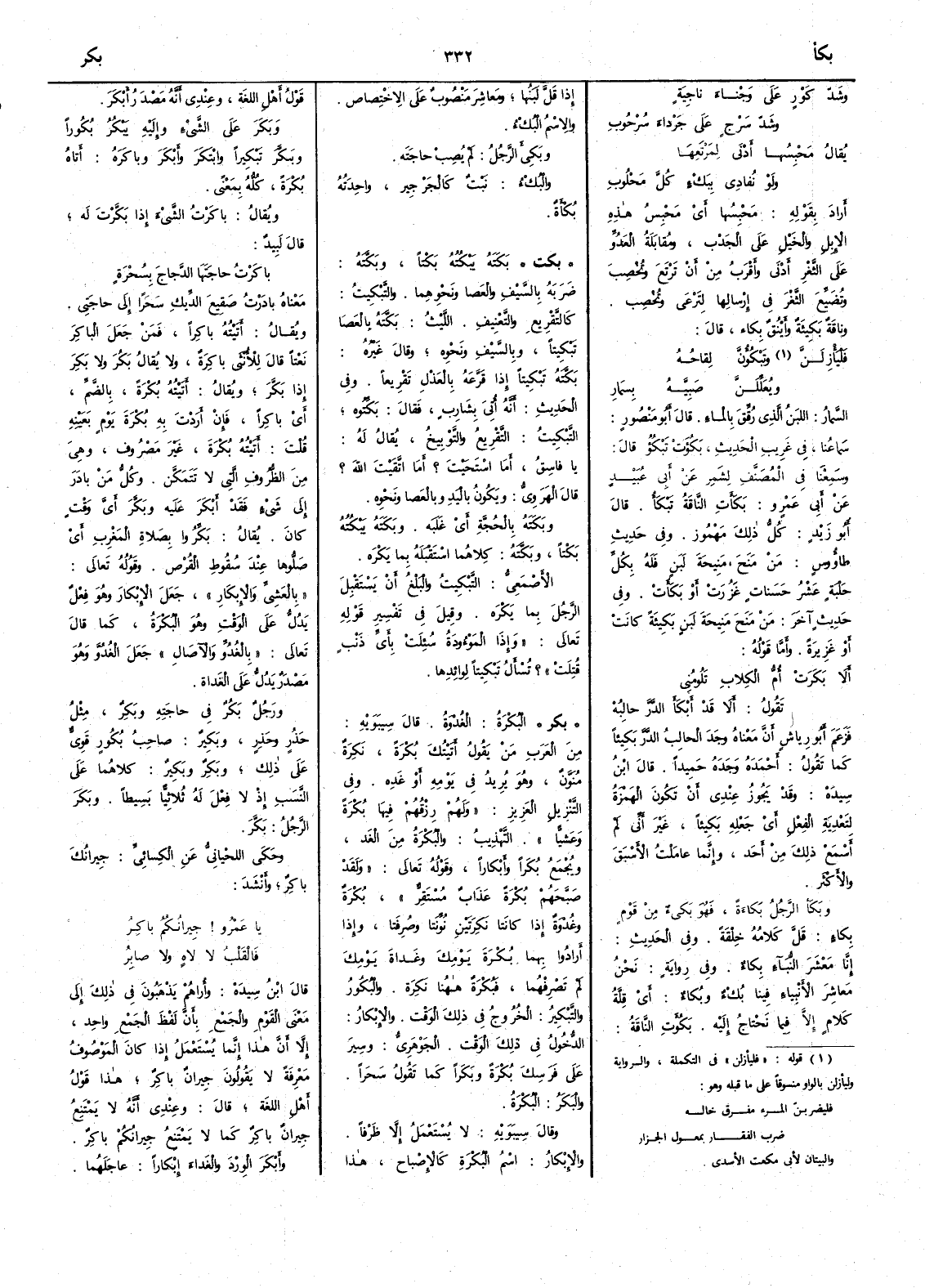 ( بكر ) البُكْرَةُ الغُدْوَةُ قال سيبويه من العرب من يقول أَتيتك بُكْرَةً نَكِرَةٌ مُنَوَّنٌ وهو يريد في يومه أَو غده وفي التنزيل العزيز ولهم زرقهم فيها بُكرة وعشيّاً التهذيب والبُكْرَةُ من الغد ويجمع بُكَراً وأَبْكاراً وقوله تعالى وَلَقَدْ صَبَّحَهُمْ بُكْرَةً عذابٌ مُسْتَقِرّ بُُكْرَةٌ وغُدْوَةٌ إِذا كانتا نكرتين نونتا وصرفتا وإذا أَرادوا بهما بكرة يومك وغداة يومك لم تصرفهما فبكرة ههنا نكرة والبُكُور والتَّبْكيرُ الخروج في ذلك الوقت والإبْكارُ الدخول في ذلك الوقت الجوهري وسِيرَ علي فرسك بُكْرَةً وبَكَراً كما تقول سَحَراً والبَكَرُ البُكْرَةُ وقال سيبويه لا يُستعمل الا ظرفاً والإبْكارُ اسم البُكْرَةِ الإصباح هذا قول أَهل اللغة وعندي أَنه مصدر أَبْكَرَ وبَكَرَ على الشي وإِليه يَبْكُرُ بُكُوراً وبكَّرَ تَبْكِيراً وابْتَكَرَ وأَبْكَرَ وباكَرَهُ أَتاهُ بُكْرةً كله بمعنى ويقال باكَرْتُ الشيء إِذا بكَّرُت له قال لبيد باكَرْتُ جاجَتَها الدجاجَ بِسُحْرَةٍ معناه بادرت صقيع الديك سحراً إِلى حاجتى ويقال أَتيته باكراً فمن جعل الباكر نَعْتاً قال للأُنثى باكِرَةٌ ولا يقال بَكُرَ ولا بَكِرَ إِذا بَكَّرَ ويقال أَتيته بُكرة بالضم أَي باكِراً فإِن أَردت به بُكْرَةَ يوم بعينه قلت أَتيته بُكْرَةَ غير مصروف وهي من الظروف التي لا تتمكن وكل من بادر إلى شيء فقد أَبكر عليه وبَكَّرَ أَيَّ وَقْتٍ كانَ يقال بَكِّرُوا بصلاة المغرب أَي صَلُّوها عند سقوط القُرْص وقوله تعالى بالعَشِيِّ والإِبْكارِ جعل الإِبكار وهو فعل يدل على الوقت وهو البُكْرَةُ كما قال تعالى بالغُدوّ والآصال جعل الغدوّ وهو مصدر يدل على الغداة ورجل بَكُرٌ في حاجته وبَكِرٌ مثل حَذُرٍ وحَذِرٍ وبَكِيرٌ صاحب بُكُورٍ قَوِيٍّ على ذلك وبَكِرٌ وبَكِيرٌ كلاهما على النسب إِذ لا فعل له ثلاثياً بسيطاً وبَكَرَ الرجلُ بَكَّرَ وحكى اللحياني عن الكسائي جِيرانُك باكِرٌ وأَنشد يا عَمْرُو جِيرانُكُمُ باكِرُ فالقلبُ لا لاهٍ ولا صابِرُ قال ابن سيده وأُراهم يذهبون في ذلك إِلى معنى القوم والجمع لأن لفظ الجمع واحد إِلاَّ أَن هذا إِنما يستعمل إِذا كان الموصوف معرفة لا يقولون جِيرانٌ باكِرٌ هذا قول أَهل اللغة قال وعندي أَنه لا يمتنع جِيرانٌ باكِرٌ كما لا يمتنع جِيرانُكُمْ باكِرٌ وأَبْكَرَ الوِرْدَ والغَداءَ إِبْكاراً عاجَلَهُما