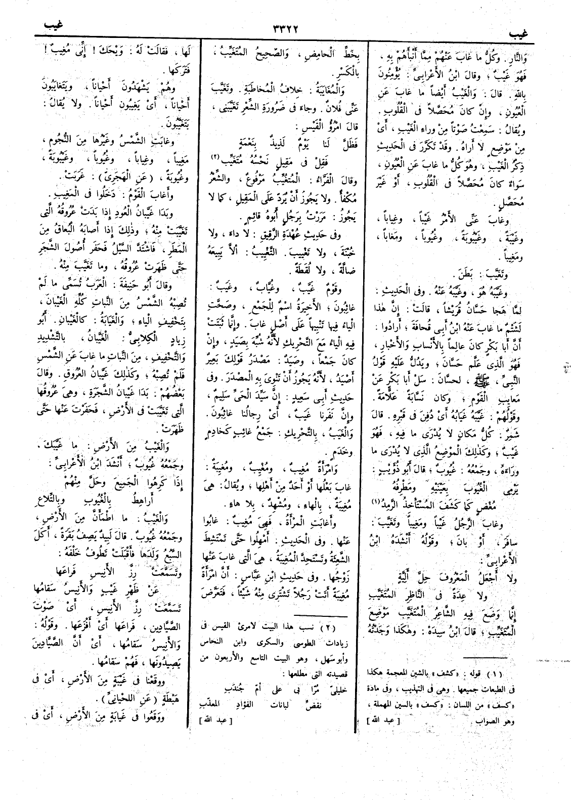 [ ص 655 ] وقال الفراءُ المُتَغَيِّبُ مرفوع والشعر مُكْفَأٌ ولا يجوز أَن يَرِدَ على المَقيلِ كما لا يجوز مررت برجل أَبوه قائم وفي حديث عُهْدَةِ الرَّقيقِ لا داءَ ولا خُبْنَة ولا تَغْييبَ التَّغْيِيب أَن لا يَبيعه ضالَّةً ولا لُقَطَة وقومٌ غُيَّبٌ وغُيَّابٌ وغَيَبٌ غائِبُون الأَخيرةُ اسم للجمع وصحت الياءُ فيها تنبيهاً على أَصل غابَ وإِنما ثبتت فيه الياء مع التحريك لأَنه شُبِّهَ بصَيَدٍ وإِن كان جمعاً وصَيَدٌ مصدرُ قولِك بعيرٌ أَصْيَدُ لأَنه يجوز أَن تَنْوِيَ به المصدر وفي حديث أَبي سعيد إِن سَيِّدَ الحيِّ سَلِيمٌ وإِن نَفَرنا غَيَبٌ أَي رجالُنا غائبون والغَيَبُ بالتحريك جمع غائبٍ كخادمٍ وخَدَمٍ وامرأَةٌ مُغِيبٌ ومُغْيِبٌ ومُغِيبةٌ غابَ بَعْلُها أَو أَحدٌ مِن أَهلها ويقال هي مُغِيبةٌ بالهاء ومُشْهِدٌ بلا هاء وأَغابَتِ المرأَةُ فهي مُغِيبٌ غابُوا عنها وفي الحديث أَمْهِلُوا حتى تَمْتَشِطَ الشَّعِثَةُ وتَسْتَحِدَّ المُغِيبةُ هي التي غاب عنها زوجُها وفي حديثِ ابنِ عَبَّاس أَنَّ امرأَةً مُغِيبةً أَتَتْ رَجُلاً تَشْتَري منه شيئاً فَتَعَرَّضَ لها فقالتْ له وَيْحَكَ إِني مُغِيبٌ فتَرَكها وهم يَشْهَدُون أَحْياناً ويَتَغايَبُونَ أَحْياناً أَي يَغِيبُون أَحْياناً ولا يقال يَتَغَيَّبُونَ وغابَتِ الشمسُ وغيرُها من النُّجوم مَغِيباً وغِياباً وغُيوباً وغَيْبُوبة وغُيُوبةً عن الهَجَري غَرَبَتْ وأَغابَ القومُ دخلوا في المَغِيبِ وبَدَا غَيَّبانُ العُود إِذا بَدَتْ عُروقُه التي تَغَيَّبَتْ منه وذلك إِذا أَصابه البُعَاقُ من المَطر فاشْتَدَّ السيلُ فحَفَر أُصولَ الشَّجر حتى ظَهَرَتْ عُروقُه وما تَغَيَّبَ منه وقال أَبو حنيفة العرب تسمي ما لم تُصِبْه الشمسُ من النَّبات كُلِّه الغَيْبانَ بتخفيف الياء والغَيَابة كالغَيْبانِ أَبو زياد الكِلابيُّ الغَيَّبانُ بالتشديد والتخفيف من النبات ما غاب عن الشمس فلم تُصِبْه وكذلك غَيَّبانُ العُروق وقال بعضهم بَدَا غَيْبانُ الشَّجرة وهي عُرُوقها التي تَغَيَّبَتْ في الأَرض فحَفَرْتَ عنها حتى ظَهَرَتْ والغَيْبُ من الأَرض ما غَيَّبك وجمعه غُيُوب أَنشد ابن الأَعرابي