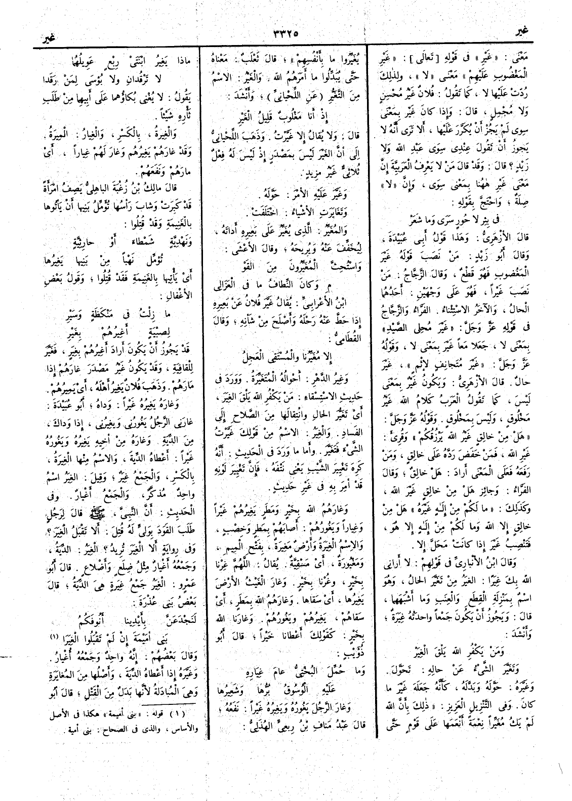 ( * قوله « هل من خالق إلخ » هكذا في الأصل ولعل أصل العبارة بمعنى هل من خالق إلخ ) غيرَ الله وكذلك ما لكم من إِله غيرَه هل مِنْ خالقٍ إِلا الله وما لكم من إِله إِلا هُوَ فتنصب غير إِذا كانت محلَّ إِلا وقال ابن الأَنباري في قولهم لا أَراني الله بك غِيَراً الغِيَرُ من تغيَّر الحال وهو اسم بمنزلة القِطَع والعنَب وما أَشبههما قال ويجوز أَن يكون جمعاً واحدته غِيرَةٌ وأَنشد ومَنْ يَكْفُرِ اللهَ يَلْقَ الغِيَرْ وتغيَّر الشيءُ عن حاله تحوّل وغَيَّرَه حَوَّله وبدّله كأَنه جعله غير ما كان وفي التنزيل العزيز ذلك بأَن الله لم يَكُ مُغَيِّراً نِعْمةً أَنعمها على قوم حتى يُغَيِّروا ما بأَنفسهم قال ثعلب معناه حتى يبدِّلوا ما أَمرهم الله والغَيْرُ الاسم من التغيُّر عن اللحياني وأَنشد إِذْ أَنا مَغْلوب قليلُ الغيَرْ قال ولا يقال إِلا غَيَّرْت وذهب اللحياني إِلى أَن الغَيْرَ ليس بمصدر إِذ ليس له فعل ثلاثي غير مزيد وغَيَّرَ عليه الأَمْرَ حَوَّله وتَغَايرتِ الأَشياء اختلفت والمُغَيِّر الذي يُغَيِّر على بَعيره أَداتَه ليخفف عنه ويُريحه وقال الأَعشى واسْتُحِثَّ المُغَيِّرُونَ من القَوْ مِ وكان النِّطافُ ما في العَزَالي ابن الأَعرابي يقال غَيَّر فلان عن بعيره إِذا حَطّ عنه رَحْله وأَصلح من شأْنه وقال القُطامي إِلا مُغَيِّرنا والمُسْتَقِي العَجِلُ وغِيَرُ الدهْرِ أَحوالُه المتغيِّرة وورد في حديث الاستسقاء مَنْ يَكْفُرِ اللهَ يَلْقَ الغِيَرَ أَي تَغَيُّر الحال وانتقالَها من الصلاح إِلى الفساد والغِيَرُ الاسم من قولك غَيَّرْت الشيء فتغيَّر وأَما ما ورد في الحديث أَنه كَرِه تَغْيِير الشَّيْب يعني نَتْفَه فإِنّ تغيير لونِه قد أُمِر به في غير حديث وغارَهُم الله بخير ومطَرٍ يَغِيرُهم غَيْراً وغِياراً ويَغُورهم أَصابهم بمَطر وخِصْب والاسم الغِيرة وأَرض مَغِيرة بفتح الميم ومَغْيُورة أَي مَسْقِيَّة يقال اللهم غِرْنا بخير وعُرْنا بخير وغارَ الغيثُ الأَرض يَغِيرها أَي سقاها وغارَهُم الله بمطر أَي سقاهم يَغِيرهم ويَغُورهم وغارَنا الله بخير كقولك أَعطانا خيراً قال أَبو ذؤيب وما حُمِّلَ البُخْتِيُّ عام غِيَارهِ عليه الوُسُوقُ بُرُّها وشَعِيرُها وغارَ الرجلَ يَغُورُه ويَغِيره غَيْراً نفعه قال عبد مناف بن ربعيّ الهُذَلي