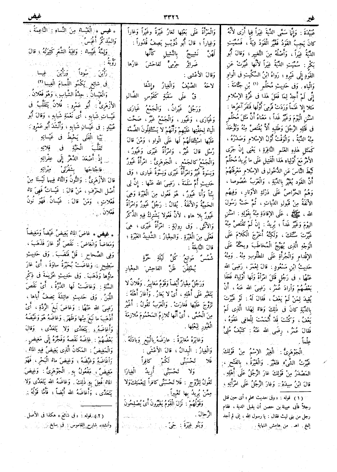 ( * قوله « وفي حديث محلم » أي حين قتل رجلاً فأبى عيينة بن حصن أن يقبل الدية فقام رجل من بني ليث فقال يا رسول الله اني لم أجد إلخ ا ه من هامش النهاية ) بن جثَّامة إني لم أَجد لِمَا فعَل هذا في غُرَّة الإِسلام مثلاً إِلا غَنَماً وردَتْ فَرُمِيَ أَوَّلُها فنَفَرَ آخرُها اسْنُن اليومَ وغَيِّر غداً معناه أَن مثَل مُحَلِّمٍ في قتْله الرجلَ وطلَبِه أَن لا يُقْتَصَّ منه وتُؤخذَ منه الدِّية والوقتُ أَول الإِسلام وصدرُه كمَثل هذه الغَنَم النافِرة يعني إِنْ جَرى الأَمر مع أَوْلِياء هذا القتيل على ما يُريد مُحَلِّم ثَبَّطَ الناسَ عن الدخول في الإِسلام معرفتُهم أَن القَوَد يُغَيَّر بالدِّية والعرب خصوصاً وهمُ الحُرَّاص على دَرْك الأَوْتار وفيهم الأَنَفَة من قبول الديات ثم حَثَّ رسولَ الله صلى الله عليه وسلم على الإِقادة منه بقوله اسْنُن اليوم وغَيِّرْ غداً يريد إِنْ لم تقتَصَّ منه غَيَّرْت سُنَّتَك ولكنَّه أَخرج الكلام على الوجه الذي يُهَيّج المخاطَب ويحثُّه على الإِقْدام والجُرْأَة على المطلوب منه ومنه حديث ابن مسعود قال لعمر رضي الله عنهما في رجل قتل امرأَة ولها أَولياء فعَفَا بعضهم وأَراد عمر رضي الله عنه أَن يُقِيدَ لمن لم يَعْفُ فقال له لو غَيَّرت بالدية كان في ذلك وفاءٌ لهذا الذي لم يَعْفُ وكنتَ قد أَتممت لِلْعافي عَفْوَه فقال عمر رضي الله عنه كَنِيفٌ مُلئ عِلْماً الجوهري الغِيَرُ الاسم من قولك غَيَّرت الشيء فتَغَيَّر والغَيْرة بالفتح المصدر من قولك غار الرجل على أَهْلِه قال ابن سيده وغار الرجل على امرأَته والمرأَة على بَعْلها تَغار غَيْرة وغَيْراً وغاراً وغِياراً قال أَبو ذؤيب يصِف قُدوراً لَهُنَّ نَشِيجٌ بالنَّشِيلِ كأَنَّها ضَرائِرُ حِرْمِيٍّ تَفاحَشَ غارُها وقال الأَعشى لاحَهُ الصَّيْفُ والغِيارُ وإِشْفا قٌ على سَقْبَةٍ كقَوْسِ الضَّالِ ورجل غَيْران والجمع غَيارَى وغُيَارَى وغَيُور والجمع غُيُرٌ صحَّت الياء لخفّتها عليهم وأَنهم لا يستثقلون الضمة عليها استثقالهم لها على الواو ومن قال رُسْل قال غُيْرٌ وامرأَة غَيْرَى وغَيُور والجمع كالجمع الجوهري امرأَة غَيُور ونسوة غُيُرٌ وامرأَة غَيْرَى ونسوة غَيارَى وفي حديث أُم سلمة رضي الله عنها إِنَّ لي بِنْتاً وأَنا غَيُور هو فَعُول من الغَيْرة وهي الحَمِيّة والأَنَفَة يقال رجل غَيور وامرأَة غَيُور بلا هاء لأَنّ فَعُلولاً يشترِك فيه الذكر والأُنثى وفي رواية امرأَة غَيْرَى هي فَعْلى من الغَيْرة والمِغْيارُ الشديد الغَيْرة قال النابغة شُمُسٌ موانِعُ كُلِّ لَيْلَةِ حُرَّةٍ يُخْلِفْنَ ظَنَّ الفاحِشِ المِغْيارِ ورجل مِغْيار أَيضاً وقوم مَغايِير وفلان لا يَتَغَيَّر على أَهله أَي لا يَغار وأَغارَ أَهلَه تزوّج عليها فغارت والعرب تقول أَغْيَرُ من الحُمَّى أَي أَنها تُلازِم المحموم مُلازَمَةَ الغَيُور لبعْلها وغايَرَه مُغايَرة عارضه بالبيع وبادَلَه والغِيارُ البِدالُ قال الأَعشى فلا تَحْسَبَنّي لكمْ كافِراً ولا تَحْسبَنّي أُرِيدُ الغِيارَا تقول للزَّوْج فلا تحسَبَنّي كافراً لِنعْمتك ولا مِمَّن يريد بها تَغْيِيراً وقولهم نزل القوم يُغَيِّرون أَي يُصْلِحون الرحال وبَنُو غِيَرة حيّ ( غيس ) الغَيْساء من النِّساء النَاعِمَة والمذكَّر أَغْيَس ولِمَّة غَيْساء وافية الشِّعر كثيرته قال رؤبة رَأَيْنَ سُوداً ورَأَيْنَ غِيسا في شائعٍ يَكْسُو اللِّمام الغِيسا والغَيْسانُ حِدَّة الشباب وهو فَعْلان الأَزهري أَبو عمرو فلان يتقلَّبُ في غَيْساتِ شَبابِه أَي نَعْمَة شَبابِه وقال أَبو عبيد في غَيْسان شَبابِه وأَنشد أَبو عمرو بَيْنا الفتى يَخْبِسطُ في غَيْساتِهِ تَقَلُّبَ الحَيَّةِ في قِلاتِه إِذ أَصْعَدَ الدَّهْرُ إِلى عِفْراتِهِ فاجْتاحَها بِشَفْرَتيْ مِبْراتِه قال الأَزهري والنون والتاء فيهما لَيْستا من أَصل الحرف من قال غَيْسات فهي تاء فَعْلات ومن قال غَيْسان فهو نون فعلان ( غيض ) غاضَ الماءُ يَغ