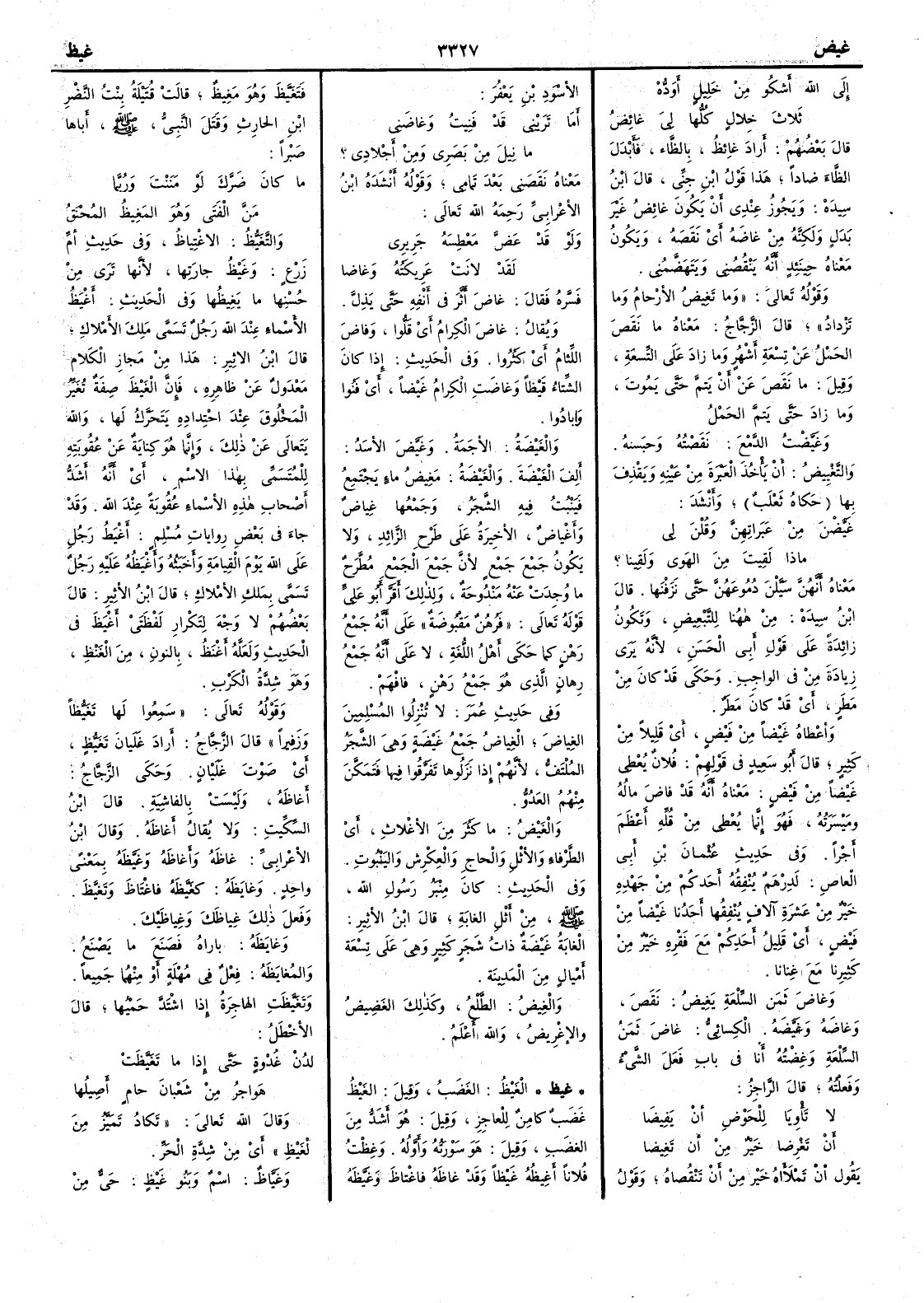( * كذا بالأضل ) وفي حديث عثمان بن أَبي العاصي لَدِرْهمٌ يُنْفِقُه أَحدكم من جَهْدِه خيرٌ من عشرة آلاف ينفقُها أَحَدُنا غَيْضاً من فَيْضٍ أَي قليلُ أَحدكم مع فَقْرِه خير من كثيرِنا مع غنانا وغاضَ ثَمنُ السِّلْعة يَغِيضُ نقَص وغاضَه وغَيَّضَه الكسائي غاضَ ثمنُ السِّلْعة وغِضْتُه أَنا في باب فعَلَ الشيءُ وفعَلْته قال الراجز لا تأْويَا للحَوْضِ أَن يَفِيضَا أَن تَغْرِضا خيرٌ من أَن تَغِيضا يقول أَنَ تَمْلآه خير من أَن تَنْقُصاه وقول الأَسود بن يعفر أَما تَرَيْني قد فَنِيتُ وغاضَني ما نِيل من بَصَرِي ومن أَجْلادِي ؟ معناه نَقَصَني بعد تمامي وقوله أَنشده ابن الأَعرابي رحمه اللّه تعالى ولو قد عَضَّ مَعْطِسَه جَرِيرِي لقدْ لانَتْ عَرِيكَتُه وغاضا فسَّره فقال غاضَ أَثَّرَ في أَنفه حتى يَذِلَّ ويقال غاضَ الكِرامُ أَي قَلُّوا وفاضَ اللِّئام أَي كَثُرُوا وفي الحديث إِذا كان الشِّتاء قَيْظاً وغاضَت الكِرام غَيْضاً أَي فَنُوا وبادُوا والغَيْضَةُ الأَجَمةُ وغَيَّضَ الأَسَدُ أَلِفَ الغَيْضَة والغَيْضَة مَغِيضُ ماءٍ يجتمع فيَنْبت فيه الشجر وجمعها غِياضٌ وأَغْياضٌ الأَخيرة على طرْح الزائد ولا يكون جَمْعَ جمعٍ لأَن جمع الجمع مُطَّرح ما وُجِدَت عنه مَنْدوحة ولذلك أَقَرَّ أَبو عليّ قوله فَرُهُنٌ مقبُوضة على أَنه جمع رَهْن كما حكى أَهل اللغة لا على أَنه جمع رِهان الذي هو جمع رَهْن فافهم وفي حديث عمر لا تُنْزِلُوا المسلمين الغِياض الغِياضُ جمع غَيْضة وهي الشجر المُلْتَفّ لأَنهم إِذا نزَلُوها تفرّقوا فيها فتمكَّن منهم العدوّ والغَيْضُ ما كثُرَ من الأَغْلاثِ أَي الطَّرْفاء والأَثْل والحاجِ والعِكْرِش واليَنْبُوت وفي الحديث كان مِنْبَر رسول اللّه صلّى اللّه عليه وسلّم من أَثْلِ الغابة قال ابن الأَثير الغابة غَيْضة ذات شجر كثير وهي على تسعة أَميال من المدينة والغِيضُ الطَّلْع وكذلك الغَضِيضُ والإِغْرِيض واللّه أَعلم
