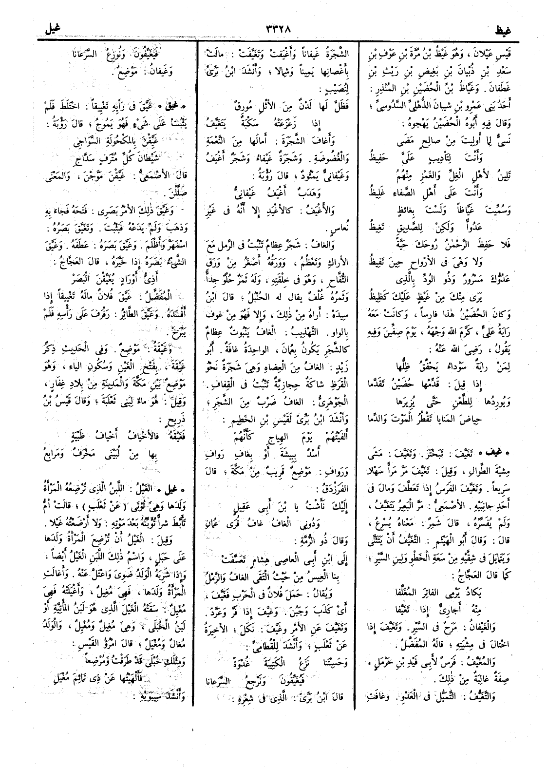 ( غيف ) تَغَيَّفَ تَبَخْتَر وتَغَيَّفَ مشى مِشْية الطِّوال وقيل تَغَيَّف مَرَّ مَرّاً سَهْلاً سريعاً وتَغَيَّفَ الفَرَسُ إذا تَعطَّفَ ومال في أَحد جانبيه الأَصمعي مَرَّ البعيرُ يَتَغيَّفُ ولم يفسره قال شمر معناه يُسْرِع قال وقال أَبو الهيثم التَّغَيُّفُ أَن يَتَثَنَّى ويَتَمايَلَ في شِقَّيْه من سَعَة الخَطْوِ ولِين السَّيْر كما قال العِجاج يكادُ يَرْمي الفاتِرَ المُغَلَّفا منه احارِيّ إذا تَغَيَّفا والغَيْفان مَرَحٌ في السَّيْر وتَغَيَّفَ إذا اختال في مِشْيَته قاله المفضل والمُغَيَّف فرس لأَبي فَيْد بن حَرْمَلٍ صفة غالبة من ذلك والتَّغَيُّفُ التَّمَيُّل في العَدْوِ وغافت الشجرةُ غَيَفاناً وأَغْيَفت وتَغَيَّفَت مالت بأَغصانها يميناً وشِمالاً وأَنشد ابن بري لنُصَيْب فظَلَّ لها لَدْنٌ من الأَثْل مُورِق إذا زَعْزَعَتْه سَكْبَةٌ يتَغَيَّفُ وأَغافَ الشجرةَ أَمالها من النَّعْمة والغُضُوضة وشجرة غَيْفاء وشجر أَغْيَفُ وغَيْفانيٌّ يَمْؤودٌ قال رؤبة وهَدَبٌ أَغْيَفُ غَيْفانيُّ والأَغْيَف كالأَغْيَد إلا أَنه في غير نُعاسٍ والغافُ شجر عظام تَنْبُتُ في الرمل مع الأَراك وتَعْظُم وورقه أَصغر من ورق التُّفّاح وهو في خلقته وله ثَمَر حُلْو جدّاً وثمره غلف يقال له الحُنْبُل قال ابن سيده أَراه من ذلك وإلا فهو من غوف بالواو والتهذيب الغاف يَنْبُوت عظام كالشجر يكون بعُمان الواحدة غافة أَبو زيد الغاف من العِضاه وهي شجرة نحو القَرَظ شاكة حجازية تَنْبُت في القِفاف الجوهري الغاف ضرب من الشجر وأَنشد ابن بري لقيس بن الخطيم أَلفَيْتُهُمْ يَوْمَ الهِياجِ كأَنهُمْ أُسْدٌ بِبِيشَةَ أَو بِغافِ رَوافِ ورَواف موضع قريب من مكة قال الفرزدق إليك نَأَْشْتُ يا ابنَ أَبي عَقِيلٍ ودُوني الغافُ غافُ قُرى عُمانِ وقال ذو الرمة إلى ابنِ أَبي العاصي هشامٍ تَعَسَّفَتْ بِنا العِيسُ من حيثُ الْتقى الغافُ والرملُ ويقال حَمَل فلان في الحرب فَغَيَّفَ أَي كَذَبَ وجَبُنَ وغَيَّفَ إذا فرَّ وعَرَّد وتغيَّف عن الأَمر وغَيَّف نَكَل الأَخيرة عن ثعلب وأَنشد القطامي وحَسِبْتنا نَزَعُ الكَتيبةَ غُدْوَةً فيُغَيِّفونَ ونَرْجِعُ السَّرَعانا قال ابن بري الذي في شعره فيغَيِّفون ونُوزِعُ السَّرَعانا وغَيفان موضع