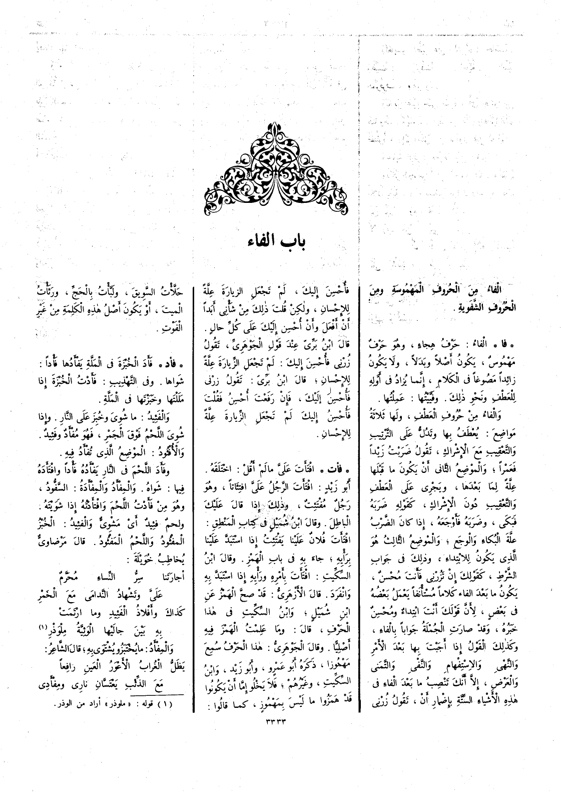 (فا) الفاء حرف هجاء وهو حرفٌ مَهْمُوسٌ يكون أَصلاً وبَدلاً ولا يكون زائداً مصوغاً في الكلام إِنما يُزاد في أَوَّله للعطف ونحو ذلك وفَيَّيْتُها عَمِلتها والفاء من حروف العطف ولها ثلاثة مواضع يُعطَف بها وتَدلّ على الترتيب والتعقيب مع الإِشْراك تقول ضَرَبْت زَيْداً فعَمْراً والموضِع الثاني أَن يكون ما قبلها علة لما بعدها ويجري على العطف والتعقيب دون الإِشراك كقوله ضَرَبه فبكى وضَرَبه فأَوْجَعَه إِذا كان الضرب عِلَّةَ البُكاء والوَجَع والموضع الثالث هو الذي يكون للابتداء وذلك في جواب الشرط كقولك إِنْ تَزُرْني فأَنْتَ محسِن يكون ما بعد الفاء كلاماً مستأْنَفاً يعمل بعضه في بعض لأَن قولك أَنتَ ابْتِداء ومُحْسِن خبره وقد صارت الجملة جواباً بالفاء وكذلك القول إِذا أَجبت بها بعد الأَمْر والنَّهْي والاستفهام والنَّفْي والتَّمَنِّي والعَرْض إِلاَّ أَنك تنصب ما بعد الفاء في هذه الأَشياء الستة بإضمار أَن تقول زُرْني فأُحْسِنَ إِليك لم تجعل الزيارة علة للإِحسان ولكن قلت ذلك مِن شأْني أَبداً أَنْ أَفعل وأَن أُحْسِنَ إِليك على كل حال قال ابن بري عند قول الجوهري تقول زُرْني فأُحْسِنَ اليك لم تجعل الزيارة علة للإِحسان قال ابن بري تقول زُرْني فأُحْسِن إليك فإِن رفعت أُحْسِنُ فقلت فأُحْسِنُ إِليك لم تجعل الزيارة علة للإِحسان