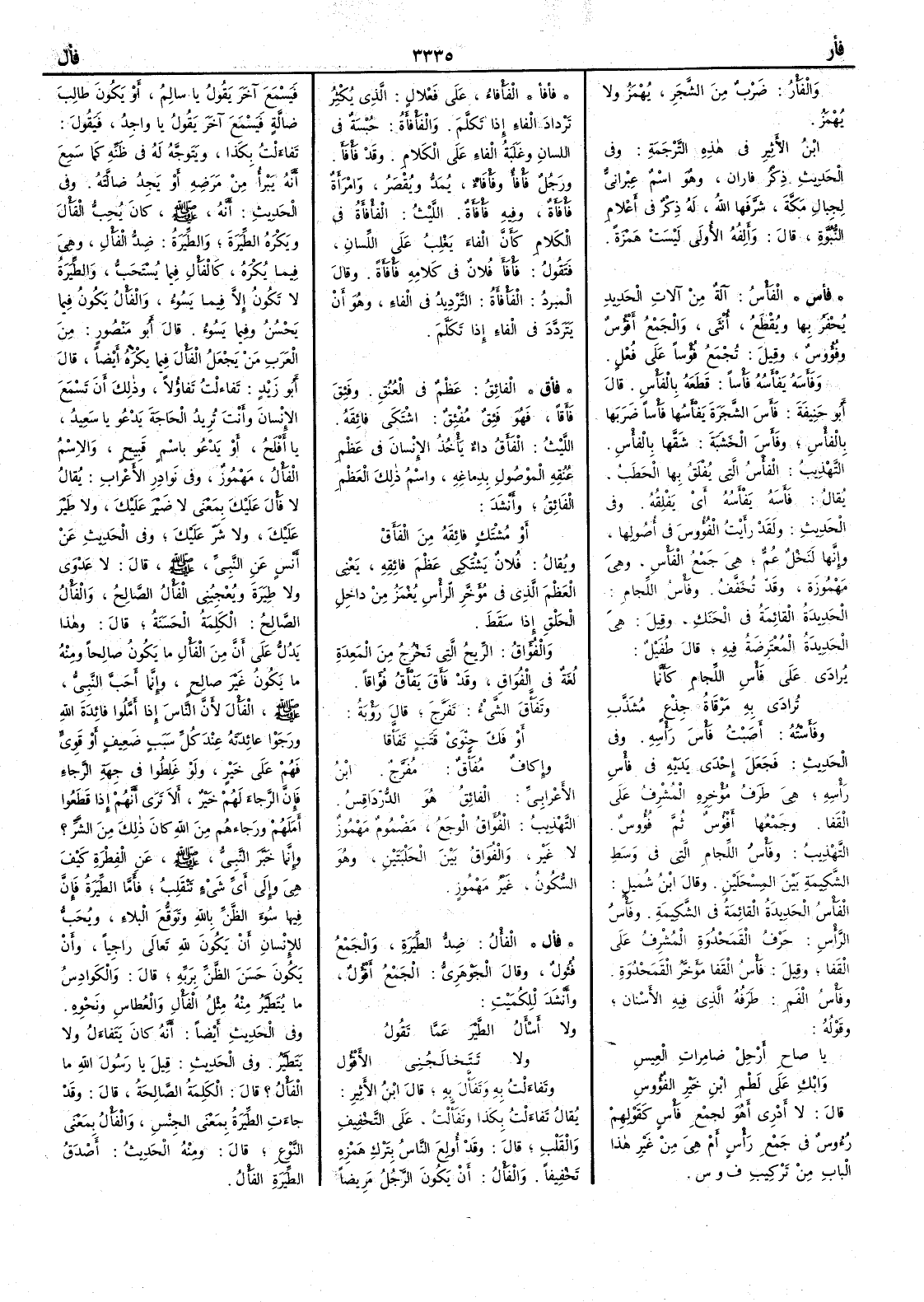 والفَأْرُ ضرب من الشجر يهمز ولا يهمز ابن الأَثير في هذه الترجمة وفي الحديث ذكر فاران هو اسم عبراني لجبال مكة شرفها الله له ذكر في أَعلام النبوة قال وأَلفه الأُولى ليست همزة ( فأس ) الفَأْسُ آلة من آلات الحديد يُحْفَرُ بها ويُقطَع أُنثى والجمع أَفْؤُس وفؤُوس وقيل تجمع فُؤُوساً على فُعْلٍ وفأَسَه يَفأَسُه فَأْساً قطعَه بالفَأْس قال أَبو حنيفة فأَسَ الشجرة يَفأَسُها فأْساً ضربها بالفأْس وفأَسَ الخشبةَ شَقَّها بالفأْس التهذيب الفأْس الذي يُفْلَق به الحطَب يقال فأَسَه يفأَسُه أَي يَفْلِقُه وفي الحديث ولقد رأَيت الفُؤُوس في أُصُولها وإِنَّها لَنَخْلٌ عُمٌّ هي جمع الفَأْس وهو مهموز وقد يُخَفَّف وفَأْس اللِّجام الحَديدَةُ القائمةُ في الحَنَك وقيل هي الحديدة المعترضة فيه قال طُفَيل يُرادى على فَأْسِ اللِّجامِ كأَنَّما تُرادى بِه مَرْقَاةُ جِذْعٍ مُشَذَّبِ وفَأَسْته أَصبت فأْس رأْسِه وفي الحديث فَجَعَل إِحْدى يَدَيه في فأْس رأْسه هو طرَف مُؤَخِرِه المُشْرِفُ على القَفا وجمعُه أَفْؤُس ثم فُؤُوس التهذيب وفأْس اللِّجام الذي في وسَط الشَكِيمَة بين المِسْحَلَيْن وقال ابن شميل الفَأْسُ الحديدة القائمة في الشَّكِيمة وفَأْس الرأْس حَرْف القَمَحْدُوَة المُشْرِف على القَفا وقيل فَأْس القَفا مؤَخَّر القَمَحْدُوَة وفَأْسُ الفَمِ طرَفه الذي فيه الأَسنان وقوله يا صاحِ أَرْحِلْ ضامِرات العِيسِ وابْكِ على لَطْم ابن خَيرِ الفُؤُوسِ قال لا أَدري أَهو لجمع فَأْسٍ كقولهم رُؤُوس في جمع رأْس أَم هي من غير هذا الباب من تركيب ف و س ( فأفأ ) الفَأْفاءُ على فَعْلالٍ الذي يُكْثِر ترْدادَ الفاء إِذا تَكلَّم والفَأْفأَةُ حُبْسةٌ في اللسان وغَلَبةُ الفاءِ على الكلام وقد فَأْفَأَ ورَجل فَأْفأٌ وفَأْفَاءٌ يمدّ ويقصر وامرأَة فَأْفَأَةٌ وفيه فَأْفَأَة الليث الفأْفَأَةُ في الكلام كأَنَّ الفاءَ يَغْلِبُ على اللِّسان فتقول فَأْفَأَ فلان في كلامه فَأْفَأَةٍ وقال المبرد الفَأْفأَةُ التَّرْدِيدُ في الفاءِ وهو أَن يَتَرَدَّدَ في الفاءِ إِذا تَكَلَّمَ ( فأق ) الفائِقُ عظم في العنق وفَئِق فَأَقاً فهو فَئِقٌ مفِئقٌ اشتكى فائقه الليث الفَأَقُ داء يأْخذ الإِنسان في عظم عنقه الموصول بدماغه واسم ذلك العظم الفَائِقُ وأَنشد أَو مُشْتَكِي فائِقَه من الفَأَقْ ويقال فلان يشتكي عظم فائِقِه يعني العظم الذي في مؤخر الرأْس يغمز من داخل الحلق إِذا سقط والفُؤَاقُ الريح التي تخرج من المعدة لغة في الفُوَاقِ وقد فَأَقَ يَفْأَقُ فُؤَاقاً وتَفَأْق الشيء تفرّج قال رؤبة أَو فَكّ حِنْوَيْ قَتَبٍ تَفَأْقا وإِكافٌ مُفَأْق مفرّج ابن الأَعرابي الفائِقُ هو الدُّرْدَاقِسُ التهذيب الفُؤَاقُ الوجع مضموم مهموز لا غير والفُوَاق بين الحلبتين وهو السكون غير مهموز ( فأل ) الفأْل ضد الطِّيَرَة والجمع فُؤول وقال الجوهري الجمع أَفْؤُل وأَنشد للكميت ولا أَسْأَلُ الطَّيرَ عما تقول ولا تَتَخالَجُني الأَفْؤُل وتَفاءلْت به وتفأْل به قال ابن الأَثير يقال تَفاءلْت بكذا وتفأْلت على التخفيف والقلْب قال وقد أُولع الناس بترك همزه تخفيفاً والفَأْل أَن يكون الرجل مريضاً فيسمع آخر يقول يا سالِمُ أَو يكون طالِبَ ضالَّة فيسمع آخر يقول يا واجِد فيقول تَفاءلْت بكذا ويتوجه له في ظنِّه كما سمع أَنه يبرأُ من مرضه أَو يجد ضالَّته وفي الحديث أَنه صلى الله عليه وسلم كان يحبُّ الفَأْل ويكره الطِّيَرَة والطِّيَرَة ضد الفَأْل وهي فيما يكره كالفَأْل فيما يستحَب والطِّيرَة لا تكون إِلا فيما يسوء والفَأْل يكون فيما يحسُن وفيما يسوء قال أَبو منصور من العرب من يجعل الفَأْل فيما يكرَه أَيضاً قال أَبو زيد تَفاءَلْت تَفاؤُلاً وذلك أَن تسمع الإِنسان وأَنت تريد الحاجة يدعو يا سعيد يا أَفْلَح أَو يدعو باسم قبيح والاسم الفَأْل مهموز وفي نوادر الأَعراب يقال لا فَأْل عليك بمعنى لا ضَيْر عليك ولا طَيْر عليك ولا شر عليك وفي الحديث عن أَنس عن النب