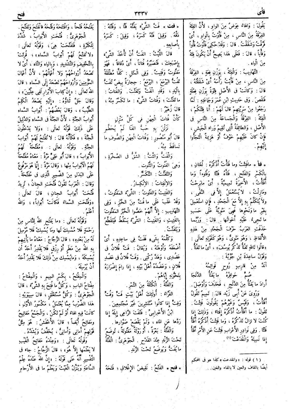 أَراد ما يَفْتَأُ مِنَ الدَّلَجِ فَحَذف وأَوْصَلَ وروي عن أَبي زيد قال تميم تقول أَفْتَأْتُ وقيس وغيرهم يقولون فَتِئْتُ تقول ما أَفْتَأْتُ أَذكره إِفْتاءً وذلك إِذا كنت لا تزالُ تَذْكره وما فَتِئْت أَذكره أَفْتَأُ فَتْأً وفي نوادر الأعراب فَتِئْتُ عن الأمر أَفْتَأُ إِذا نَسِيتَه وانْقَدَعْتَ ( فتت ) فَتَّ الشيءَ يَفُتُّه فَتّاً وفَتَّتَه دَقَّه وقيل فَتَّه كَسَره وقيل كسره بأَصابعه قال الليث الفَتُّ أَن تأْخذ الشيء بإِصبعك فَتُصَيِّرَه فُتاتاً أَي دُقاقاً فهو مَفْتُوتٌ وفَتِيتٌ وفي المثل كَفّاً مُطْلَقةً تَفُتُّ اليَرْمَعَ اليَرْمَع حجارة بيض تُفَتُّ باليد وقد انْفَتَّ وتَفَتَّتَ والفُتاتُ ما تَفَتَّت وفُتاتُ الشيء ما تكسر منه قال زهير كأَنَّ فُتاتَ العِهْنِ في كُلِّ مَنْزِلٍ نَزَلْنَ به حَبُّ الفَنَا لم يُحَطَّمِ قال أَبو منصور وفُتاتُ العِهْنِ والصوف ما تساقط منه والفَتُّ والتَّتُّ الشَّقُّ في الصَّخْرة وهي الفُتُوتُ والثُّتُوتُ والتَفَتُّتُ التَّكَسُّر والانْفِتاتُ الانكسار والفَتِيتُ والفَتُوتُ الشيءُ المَفْتُوتُ وقد غَلَبَ على ما فُتَّ من الخُبْز وفي التهذيب إِلا أَنهم خَصُّوا الخُبْز المَفْتُوتَ بالفَتِيتِ والفَتِيتُ الشيءُ يَسْقُطُ فيَتَقَطَّعُ ويَتَفَتَّتُ وكلَّمه بشيءٍ ففَتَّ في ساعده أَي أَضْعَفَه وأَوْهَنَه ويقال فَتَّ فلانٌ في عَضُدِي وهَدَّ رُكْني وفَتَّ فلانٌ في عَضُدِ فلانٍ وعَضُدُه أَهلُ بيتِه إِذا رام إِضْرارَه بتَخَوُّنِه إِياهم والفُتَّة الكُتْلةُ من التمر الفراء أُولئك أَهلُ بيتٍ فَتٍّ وفُتٍّ وفِتٍّ إِذا كانوا مُنْتَشرين غير مجتمعين ابن الأَعرابي فَتْفَتَ الراعي إِبلَه إِذا رَدَّها عن الماء ولم يَقْصَعْ صَوَّارها والفُتَّة بَعْرة أَو رَوْثة مَفْتوتة تُوضَع تحتَ الزَّنْدِ عند القَدْح الجوهري الفُتَّةُ ما يُفَتُّ ويوضَع تحت الزَّنْدِ