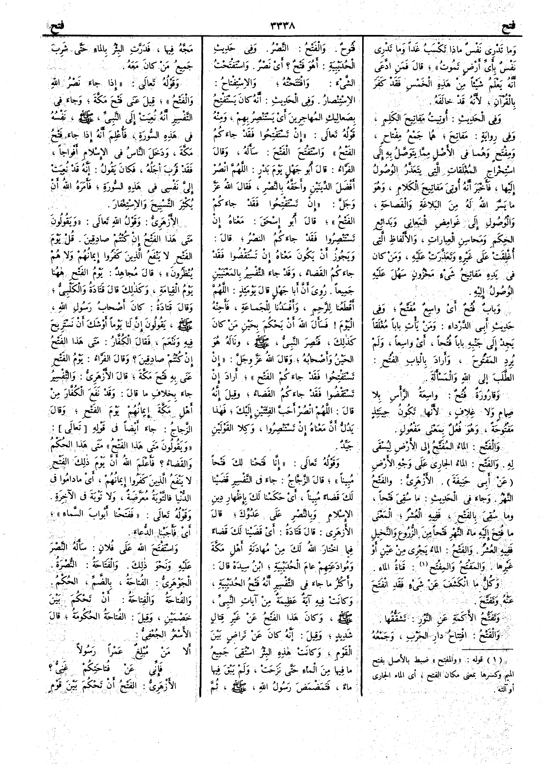 وما تدري نفسٌ ماذا تَكْسِبُ غداً وما تدْرِي نَفْسٌ بأَيِّ أَرض تموت } قال : فمن ادَّعى أَنه يعلم شيئاً من هذه الخمس فقد كفر بالقرآن لأَنه قد خالفه وفي الحديث : أُوتِيتُ مَفاتيح الكَلِم وفي رواية : مَفاتِحَ هما جمع مِفْتاح و مِفْتَح وهما في الأَصل مما يتوصل به إِلى استخراج المُغْلَقات التي يتعذر الوصول إِليها فأَخبر أَنه أُوتي مفاتيح الكلام وهو ما يسَّر الله له من البلاغة والفصاحة والوصول إِلى غوامض المعاني وبدائع الحكم ومحاسن العبارات والأَلفاظ التي أُغلقت على غيره وتعذرت عليه ومن كان في يده مفاتيح شيء مخزون سهل عليه الوصول إِليه . وبابٌ فُتُحٌ أَي واسِع مُفَتَّحٌ وفي حديث أَبي الدرداء : ومن يأْت باباً مُغْلَقاً يَجِدْ إِلى جنبه باباً فُتُحاً أَي واسعاً ولم يُرِد المفتوحَ وأَراد بالباب الفُتُح : الطَّلَب إِلى الله والمسأَلة . وقارورةٌ فُتُحٌ : واسعة الرأْس بلا صِمامٍ ولا غِلاف لأَنها تكون حينئذ مفتوحة وهو فُعُلٌ بمعنى مَفْعول . و الفَتْحُ : الماء المُفَتَّحُ إِلى الأَرض ليُسْقَى به . و الفَتْحُ : الماء الجاري على وجه الأَرض عن أَبي حنيفة . الأَزهري : و الفَتْحُ النهر . وجاء في الحديث : ما سُقِيَ فَتْحاً وما سُقِي بالفَتْحِ ففيه العُشْر المعنى ما فتحَ إِليه ماءُ النهر فَتْحاً من الزروع والنخيل ففيه العشر . و الفَتْحُ : الماء يجري من عين أَو غيرها . و المَفْتَحُ و المِفْتَح : قَناةُ الماء . وكلُّ ما انكشف عن شيء فقد انفتح عنه و تَفتَّح . و تَفَتُّحُ الأَكمة عن النَّوْر : تَشَقُّقُها . و الفَتْحُ : افتتاح دار الحرب وجمعه فُتُوحٌ . و الفَتْحُ : النصر . وفي حديث الحديبية : أَهو فَتْحٌ أَي نصر . و اسْتَفْتَحْتُ الشيءَ و افْتَتَحْتُه و الاستفتاح : الاستنصار . وفي الحديث : أَنه كان يَسْتَفْتِحُ بصعاليك المهاجرين أَي يستنصر بهم ومنه قوله تعالى : { إِن تَسْتَفْتِحُوا فقد جاءكم الفَتْحُ } . و اسْتَفْتَحَ الفَتْحَ : سأَله . وقال الفراء : قال أَبو جهل يوم بدر : اللهم انْصُر أَفضلَ الدينين وأَحَقَّه بالنصر فقال الله عز وجل : { إِن تَسْتَفْتِحُوا فقد جاءكم الفَتْحُ } قال أَبو إِسحق : معناه إِن تستنصروا فقد جاءكم النصر قال : ويجوز أَن يكون معناه : إِن تَسْتَقْضُوا فقد جاءكم القَضاءُ وقد جاء التفسير بالمعنيين جميعاً . وروي أَن أَبا جهل قال يومئذ : اللهم أَقْطَعُنا للرحم وأَفْسَدُنا للجماعة فأَحِنْه اليومَ فسأَل الله أَن يَحْكُمَ بحَيْنِ من كان كذلك فنصر النبي وناله هو الحَيْنُ وأَصحابُه وقال الله عز وجل : { إِن تستفتحوا فقد جاءكم الفتح } أَراد أَن تستقضوا فقد جاءكم القضاء وقيل إِنه قال : اللهم انْصُرْ أَحَبَّ الفِئَتَينِ إِليك فهذا يدل أَن معناه إِن تستنصروا وكلا القولين جَيِّدٌ . وقوله تعالى : { إِنا فتحنا لك فتحاً مبيناً } قال الزجاج : جاء في التفسير قضينا لك قضاءً مبيناً أَي حكمنا لك بإِظهار دين الإِسلام وبالنصر على عدوِّكَ قال الأَزهري : قال قتادة : أَي قضينا لك قضاءً فيما اختار الله لك من مُهادَنةِ أَهل مكة وموادعتهم عام الحديبية ابن سيده قال : وأَكثر ما جاء في التفسير أَنه فَتْحُ الحُدَيْبية وكانت فيه آية عظيمة من آيات النبي وكان هذا الفتح عن غير قتال شديد وقيل : إِنه كان عن تراض بين القوم وكانت هذه البئر اسْتُقِيَ جميعُ ما فيها من الماء حتى نَزَحَتْ ولم يبق فيها ماء فتمضمض رسول الله ثم مَجَّه فيها فَدَرَّتِ البئرُ بالماء حتى شرب جميع من كان معه . وقوله تعالى : { إِذا جاء نصر الله و الفتح } قيل عنى فتح مكَّة وجاء في التفسير أَنه نُعِيَتْ إِلى النبي نَفْسُه في هذه السورة فَأُعْلِمَ أَنه إِذا جاء فتح مكّة ودخل الناس في الإِسلام أَفواجاً فقد قرب أَجله فكان يقول : إِنه قد نُعِيَتْ إِليَّ نفسي في هذه السورة فأَمر الله أَن يكثر التسبيح والاستغفار . الأَزهري : وقول الله تعالى : { ويقولون متَى هذا الفَتْحُ إِن كنتم صادقين قل يوم الفتح لا يَنْفَعُ الذين كفروا إِيمانُهم ولا هم يُنْظَرونَ } قال مجاهد : يوم ال