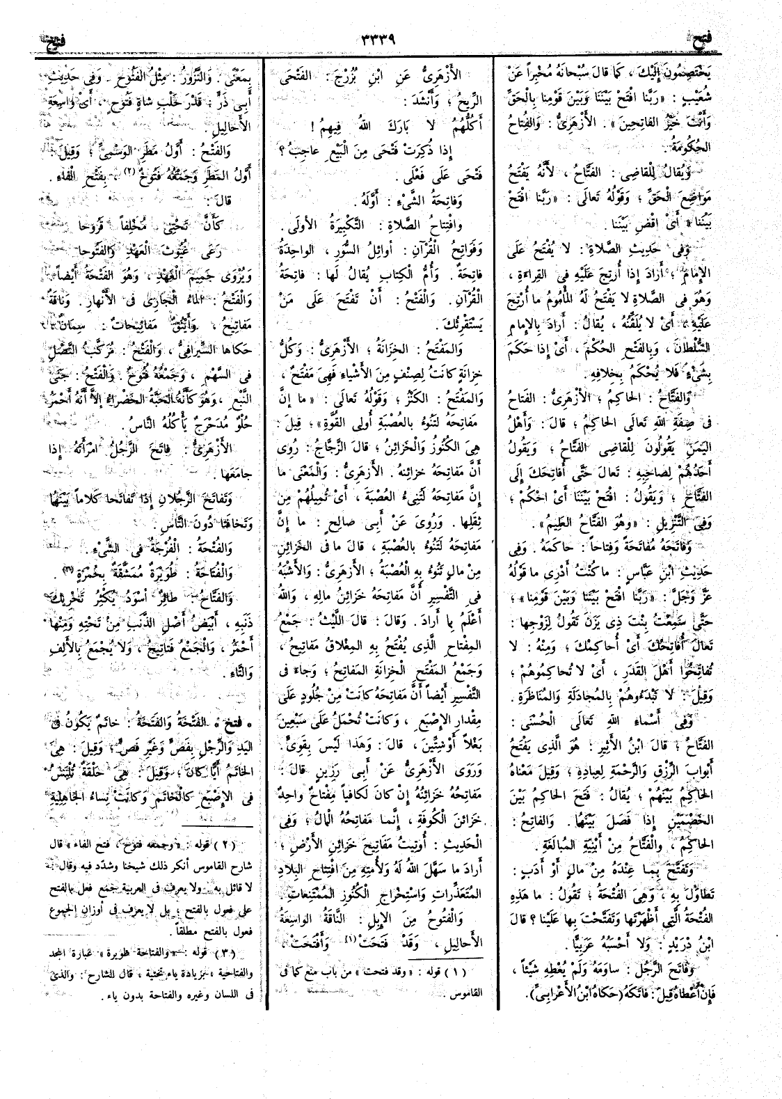 يختصمون إِليك كما قال سبحانه مخبراً عن شعيب : { ربنا افْتَحْ بيننا وبين قومنا بالحق وأَنت خير الفاتحين } . الأَزهري : و الفُتاح الحكومة . ويقال للقاضي : الفَتَّاحُ لأَنه يَفْتُحُ مواضع الحق وقوله تعالى : { ربنا افْتَحْ بيننا } أَي اقْض بيننا . وفي حديث الصلاة : لا يُفْتَحُ على الإِمام أَراد إِذا أُرتِجَ عليه في القراءة وهو في الصلاة لا يَفْتَح له المأْموم ما أُرْتِجَ عليه أَي لا يُلَقِّنُه يقال : أَراد بالإِمام السلطان وبالفتْحِ الحكم أَي إِذا حكم بشيء فلا يُحْكَمُ بخلافه و الفتَّاحُ : الحاكِمُ الأَزهري : الفَتَّاح في صفة الله تعالى الحاكم قال : وأَهل اليمن يقولون للقاضي الفَتَّاحُ ويقول أَحدهم لصاحبه : تعال حتى أُفاتحكَ إِلى الفَتَّاح ويقول : افْتَحْ بيننا أَي احكم وفي التنزيل : { وهو الفَتَّاحُ العليم } . و فاتَحه مُفاتحة و فِتاحاً : حاكمه . وفي حديث ابن عباس : ما كنت أَدري ما قوله عز وجل : { ربنا افتح بيينا وبين قومنا } حتى سمعت بنتَ ذِي يَزَنَ تقول لزوجها : تعالَ أُفاتِحْكَ أَي أُحاكمكَ ومنه : لا تُفاتِحوا أَهل القَدَر أَي لا تحاكموهم وقيل : لا تَبْدَؤُوهُمْ بالمجادلة والمناظرة . وفي أَسماء الله تعالى الحسنى : الفَتَّاحُ قال ابن الأَثير : هو الذي يفتح أَبواب الرزق والرحمة لعباده وقيل : معناه الحاكم بينهم يقال : فَتَحَ الحاكم بين الخصمين إِذا فصل بينهما . و الفاتحُ : الحاكم . و الفَتَّاحُ من أَبنية المبالغة . و تَفَتَّحَ بما عنده من مال أَو أَدب : تطاول به وهي الفُتْحة تقول : ما هذه الفُتْحَةُ التي أَظهرتها و تَفَتَّحْتَ بها علينا قال ابن دريد : ولا أَحسبه عربيّاً . و فاتَحَ الرجلَ : ساوَمَه ولم يعطه شيئاً فإِن أَعطاه قيل : فاتَكه حكاه ابن الأَعرابي . الأَزهري عن ابن بُزُرْجٍ : الفَتْحَى الريح وأَنشد : أَكُلُّهُمُ لا بارك اللَّهُ فيهمُ إِذا ذُكِرَتْ فَتْحَى من البَيْعِ عاجِبُ فَتْحَى على فَعْلَى . و فاتحة الشيء : أَوَّله . و افتتاح الصلاة : التكبيرة الأُولى . و فَواتِحُ القرآن : أَوائل السور الواحدة فاتحة . وأُم الكتاب يقال لها : فاتحة القرآن . و الفتح : أَن تفتح على من يستقرئك . و المَفْتَحُ : الخِزانة الأَزهري : وكلُّ خزانة كانت لِصِنْفٍ من الأَشياء فهي مَفْتَحٌ و المَفْتَحُ : الكَنز وقوله تعالى : { ما إِنَّ مَفاتِحَه لتَنُوءُ بالعُصْبة أُولي القوّة } قيل : هي الكنوز والخزائن قال الزجاج : روي أَن مفاتحه خزائنه . الأَزهري : والمعنى ما إِن مفاتحه لتُنِيءُ العُصْبَةَ أَي تُميلهم من ثِقَلها . وروي عن أَبي صالح : ما إِن مفاتحه لتَنُوءُ بالعُصْبة قال ما في الخزائن من مال تَنُوءُ به العُصْبةُ الأَزهري : والأَشبه في التفسير أَن مفاتحه خزائن ماله والله أَعلم بما أَراد . وقال : قال الليث : جمع المِفْتاح الذي يُفتح به المِغْلاقُ مَفاتِيحُ وجمع المَفْتَح الخِزانةِ المَفاتِحُ وجاء في التفسير أَيضاً أَن مفاتحه كانت من جلود على مقدار الإِصبع وكانت تحمل على سبعين بغلاً أَو ستّين قال : وهذا ليس بقوي . وروى الأَزهري عن أَبي رَزين قال : مفاتحه خزائنه إِن كان لكافياً مِفْتاحٌ واحد خَزائنَ الكوفة إِنما مفاتحه المال وفي الحديث : أُوتيت مفاتيح خَزائِن الأَرض أَراد ما سَهَّل الله له ولأُمَّته من افتتاح البلاد المتعذرات واستخراج الكنوز الممتنعات . و الفَتُوحُ من الإِبل : الناقة الواسعة الأَحاليل وقد فَتَحَت و أَفْتَحَتْ بمعنىً . والنَّزُور : مثل الفَتُوح . وفي حديث أَبي ذرّ : قَدْر حَلْبِ شاةٍ فَتُوحٍ أَي واسعة الأَحاليل . و الفَتْحُ : أَوَّل مطر الوَسْمِيِّ وقيل : أَول المطر وجمعه فَتُوحٌ بفتح الفاء قال : كأَنَّ تحتي مُخْلِفاً قَرُوحا رَعَى غُيُوثَ العَهْدِ والفَتُوحا ويروى جَمِيمَ العَهْدِ وهو الفَتْحةُ أَيضاً . و الفَتْحُ : الماءُ الجاري في الأَنهار . وناقةٌ مَفاتِيحٌ وأَيْنُقٌ مَفاتِيحاتٌ : سِمَانٌ حكاها السيرافي . و الفَتْحُ : مُرَكَّبُ النَّصلِ في السَّهْمِ وجمعه فُتُوح . و الفتحُ : جَنَى النَّبْعِ وهو كأَ