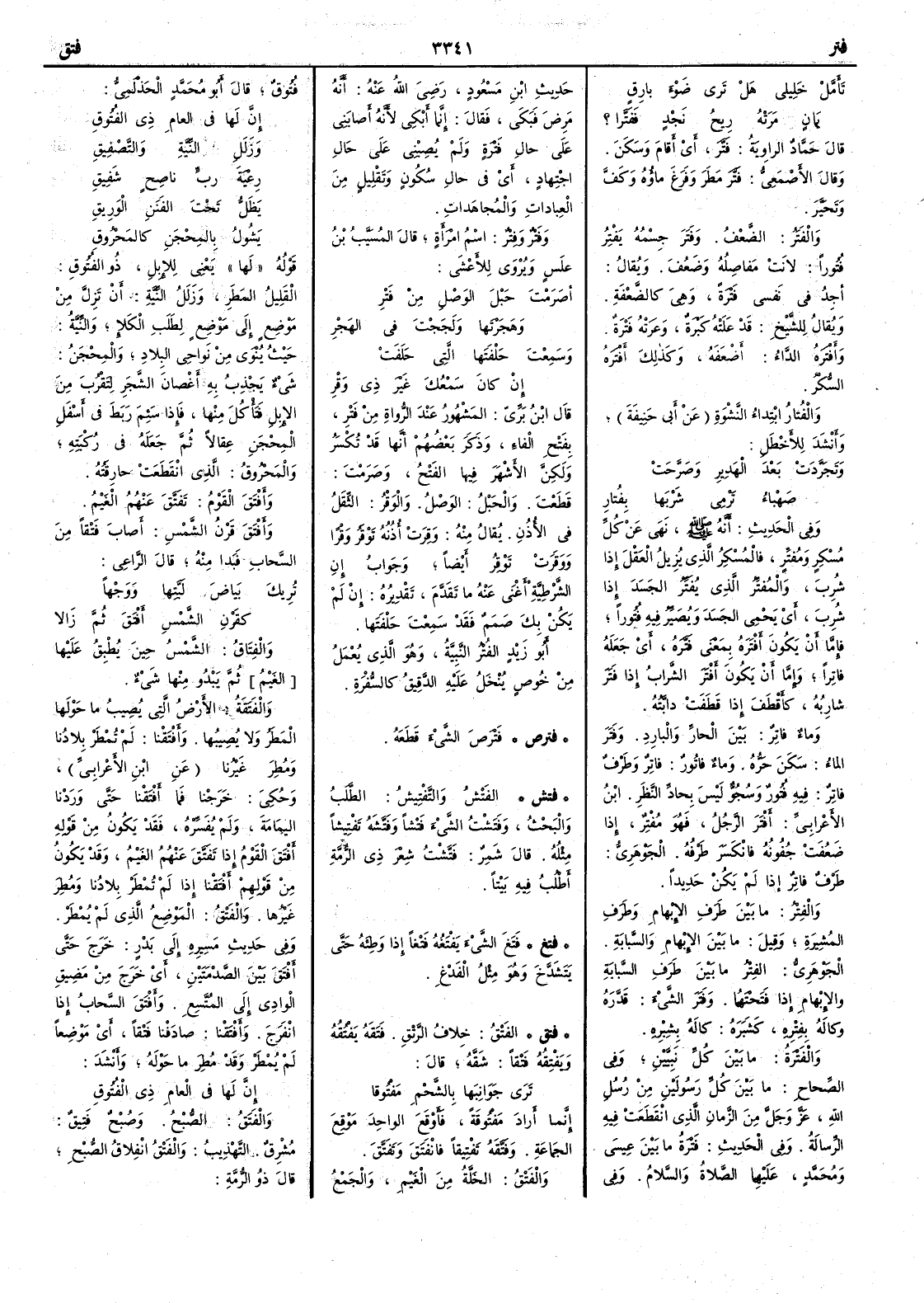 ( فترص ) فَتْرَصَ الشيءَ قَطَعه ( فتش ) الفَتْشُ والتَّفْتيشُ الطلبُ والبحثُ وفتَشْت الشيء فتْشاً وفتَّشَه تفْتيشاً مثله قال شمر فتَّشْت شعر ذي الرّمة أَطلُب فيه بيتاً ( فتغ ) فَتَغَ الشيءَ يَفْتَغُه فَتْغَاً إِذا وَطِئَه حتى يَتَشَدَّخَ وهو مثل الفَدْغِ ( فتق ) الفَتْق خلاف الرَّتْق فَتَقَهُ يَفْتُقُه ويَفْتِقُه فَتْقاً شقه قال ترى جَوَابها بالشحم مَفْتُوقا إِنما أَراد مفتوقة فأَوقع الواحد موقع الجماعة وفَتَّقهُ تَفْتيِقاً فانْفتَقَ وتَفَتَّق والفَتْقُ الخَلَّةُ من الغيم والجمع فُتُوق قال أَبو محمد الحذلمي إِنَّ لها في العامِ ذي الفُتُوقِ وزَلَلِ النيَّةِ والتَّصْفِيقِ رِعْيةَ ربٍّ ناصحٍ شَفِيقِ يَظَلُّ تحت الفَنَنِ الوَرِيقِ يَشُولُ بالمِحْجَنِ كالمَحْروقِ قوله لها يعني للإِبل ذو الفُتُوق القليل المطر وزَلَلُ النيَّة أَن تَزِلَّ من موضع إِلى موضع لطلب الكَلأِ والنيَّةُ حيث يُنْوى من نواحي البلاد والمِحْجَنُ شيء يجذب به أَغصان الشجر لتقرب من الإِبل فتأْكل منها فإِذا سئم ربط في أَسفل المِحْجَن عقالاً ثم جعله في ركبته والمَحْروق الذي انقطعتِ حارقته وأَفْتَقَ القومُ تَفَتَّق عنهم الغيم وأَفْتَقَ قَرْنُ الشمس أَصاب فَتْقاً من السحاب فبدا منه قال الراعي تُرِيكَ بياضَ لَبَّتِها ووَجْهاً كقَرْنِ الشمس أَفْتَقَ ثم زَالا والفِتَاقُ الشمس حين يُطْبقُ عليها ثم يبدو منها شيء والفَتَقَةُ الأَرض التي يصيب ما حولها المطر ولا يصيبها وأَفْتَقْنا لم تُمْطَر بلادُنا ومُطِرَ غيرُنا عن ابن الأَعرابي وحكي خرجنا فما أَفْتَقْنا حتى وردنا اليمامة ولم يفسره فقد يكون من قوله أَفْتَقَ القوم إِذا تَفَتَّقَ عنهم الغيم وقد يكون قولهم أَفْتَقْنا إِذا لم تُمْطَر بلادُنا ومُطِر غيرُها والفَتْقُ الموضع الذي لم يمطر وفي حديث مسيره إِلى بدر خرج حتى أَفْتَقَ بين الصَّدْمتين أَي خرج من مَضيق الوادي إِلى المُتَّسع وأَفْتَقَ السحابُ إِذا انفرج وأَفْتَقْنا صادفنا فَتْقاً أَي موضعاً لم يمطر وقد مُطِرَ ما حوله وأَنشد إِنَّ لها في العام ذي الفُتوقِ والفَتَقُ الصبح وصبح فَتِيقٌ مُشرق التهذيب والفَتْق انفلاق الصبح قال ذو الرمة
