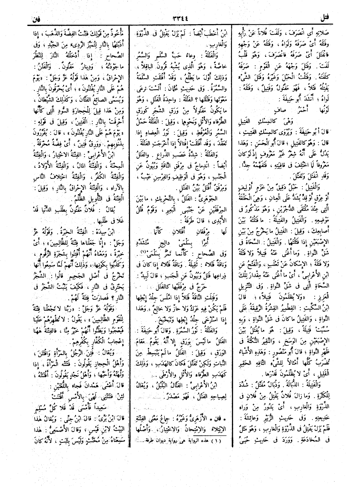 ( * هذه الرواية هي كذلك رواية ديوان طرفة ) وناقة فَتْلاء ثقيلة وناقة فَتْلاء إِذا كان في ذراعها فَتَل وبُيُون عن الجنب قال لبيد حَرَجٌ من مِرْفقيْها كالفَتَل وفَتِلَت الناقة فَتَلاً إِذا امَّلَس جلد إِبْطها فلم يكن فيه عَرَك ولا حازّ ولا خالِعٌ وهذا إِذا استرخى جلد إِبْطها وتَبَخْبَخَ والفَتْلة نَوْرُ السَّمُرة وقال أَبو حنيفة الفَتَل ما ليس بورق إِلا أَنه يقوم مقام الورق وقيل الفَتَل ما لم ينبسط من النبات ولكن تَفَتَّل فكان كالهَدَب وذلك كهَدَب الطَّرْفاء والأَثْل والأَرْطى ابن الأَعرابي الفَتَّال البُلْبُل ويقال لِصياحه الفَتْل فهو مصدر ( فتن ) الأَزهري وغيره جِماعُ معنى الفِتْنة الابتلاء والامْتِحانُ والاختبار وأَصلها مأْخوذ من قولك فتَنْتُ الفضة والذهب إِذا أَذبتهما بالنار لتميز الرديء من الجيِّدِ وفي الصحاح إِذا أَدخلته النار لتنظر ما جَوْدَتُه ودينار مَفْتُون والفَتْنُ الإِحْراقُ ومن هذا قوله عز وجل يومَ هم على النارِ يُفْتَنُونَ أَي يُحْرَقون بالنار ويسمى الصائغ الفَتَّان وكذلك الشيطان ومن هذا قيل للحجارة السُّود التي كأَنها أُحْرِقَتْ بالنار الفَتِينُ وقيل في قوله يومَ همْ على النار يُفْتَنُونَ قال يُقَرَّرونَ والله بذنوبهم ووَرِقٌ فَتِينٌ أَي فِضَّة مُحْرَقَة ابن الأَعرابي الفِتْنة الاختبار والفِتْنة المِحْنة والفِتْنة المال والفِتْنة الأَوْلادُ والفِتْنة الكُفْرُ والفِتْنةُ اختلافُ الناس بالآراء والفِتْنةُ الإِحراق بالنار وقيل الفِتْنة في التأْويل الظُّلْم يقال فلان مَفْتُونٌ بطلب الدنيا قد غَلا في طلبها ابن سيده الفِتْنة الخِبْرَةُ وقوله عز وجل إِنا جعلناها فِتْنةً للظالمين أي خِبْرَةً ومعناه أَنهم أُفْتِنوا بشجرة الزَّقُّوم وكذَّبوا بكونها وذلك أَنهم لما سمعوا أَنها تخرج في أَصل الجحيم قالوا الشجر يَحْتَرِقُ في النار فكيف يَنْبُت الشجرُ في النار ؟ فصارت فتنة لهم وقوله عز وجل ربَّنا لا تَجْعَلْنا فِتْنةً للقوم الظالمين يقول لا تُظْهِرْهُم علينا فيُعْجبُوا ويظنوا أَنهم خير منا فالفِتْنة ههنا إِعجاب الكفار بكفرهم ويقال فَتَنَ الرجلُ بالمرأَة وافْتَتَنَ وأَهل الحجاز يقولون فتَنَتْه المرأَةُ إِذا وَلَّهَتْه وأَحبها وأَهل نجد يقولون أَفْتَنَتْه قال أَعْشى هَمْدانَ فجاء باللغتين لئِنْ فتَنَتْني لَهْيَ بالأَمْسِ أَفْتَنَتْ سَعِيداً فأَمْسَى قد قَلا كلَّ مُسْلِم قال ابن بري قال ابن جني ويقال هذا البيت لابن قيسٍ وقال الأَصمعي هذا سمعناه من مُخَنَّثٍ وليس بثَبَتٍ لأَنه كان