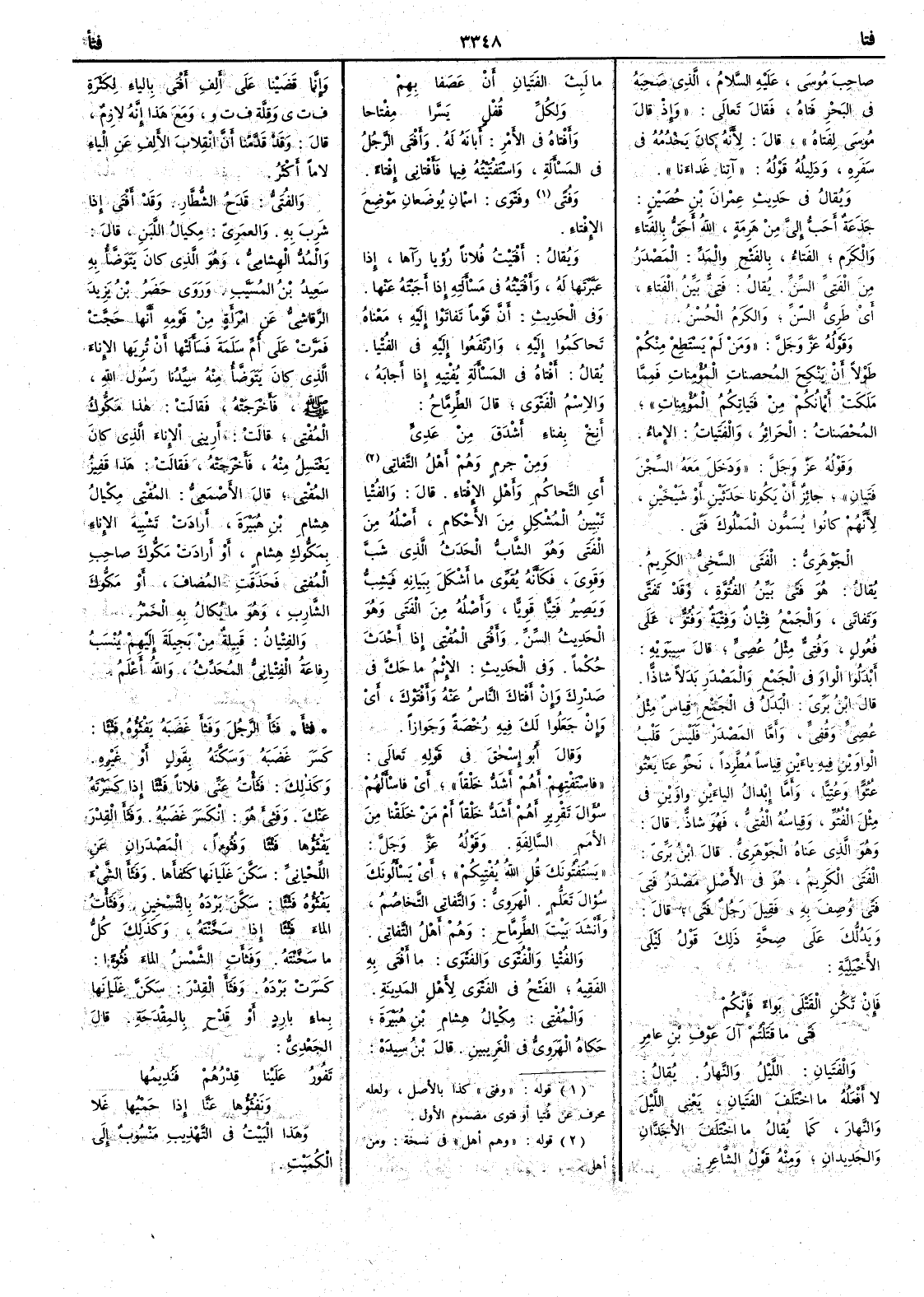 ( * قوله « وهم أهل » في نسخة ومن أهل ) أَي التَّحاكُم وأَهل الإِفتاء قال والفُتيا تبيين المشكل من الأَحكام أَصله من الفَتَى وهو الشاب الحدث الذي شَبَّ وقَوِي فكأَنه يُقَوّي ما أَشكل ببيانه فيَشِبُّ ويصير فَتِيّاً قوّياً وأَصله من الفتى وهو الحديث السنّ وأَفْتَى المفتي إِذا أَحدث حكماً وفي الحديث الإِثْمُ ما حَكَّ في صدرك وإِن أَفْتاك الناسُ عنه وأَفْتَوكَ أَي وإِن جعلوا لك فيه رُخْصة وجَوازاً وقال أَبو إِسحق في قوله تعالى فاسْتَفْتِهِم أَهم أَشدُّ خَلقاً أَي فاسْأَلهم سؤال تقرير أَهم أَشد خلقاً أَمْ مَن خلقنا من الأُمم السالفة وقوله عز وجل يَسْتَفْتُونك قل اللهُ يُفْتِيكم أَي يسأَلونك سؤالَ تَعَلُّم الهروي والتَّفاتي التخاصم وأَنشد بيت الطرماح وهم أَهل التفاتي والفُتْيا والفُتْوَى والفَتْوَى ما أَفتى به الفقيه الفتح في الفَتوى لأَهل المدينة والمُفْتِي مِكيال هشام بن هبيرة حكاه الهروي في الغريبين قال ابن سيده وإِنما قضينا على أَلف أَفتى بالياء لكثرة ف ت ي وقلة ف ت و ومع هذا إِنه لازم قال وقد قدمنا أَن انقلاب الأَلف عن الياء لاماً أَكثر والفُتَيُّ قَدَحُ الشُّطَّارِ وقد أَفْتَى إِذا شرب به والعُمَرِيّ مِكيال اللبن قال والمد الهشامي وهو الذي كان يتوضأُ به سعيد بن المسيب وروى حضر بن يزيد الرَّقاشِي عن امرأَة من قومه أَنها حجَّت فمرَّت على أُمّ سلمة فسأَلتها أَن تُرِيَها الإِناء الذي كان يتوضَّأُ منه سيدنا رسول الله صلى الله عليه وسلم فأَخْرجته فقالت هذا مَكُّوك المُفتِي قالت أَرِيني الإِناء الذي كان يغتسل منه فأَخرجته فقالت هذا قفيز المُفْتِي قال الأَصمعي المُفْتِي مِكيال هشام بن هبيرة أَرادت تشبيه الإِناء بمكوك هشام أَو أَرادت مكوك صاحب المفتي فحذفت المضاف أَو مكوك الشارب وهو ما يكال به الخمر والفِتْيانُ قَبيلة من بَجِيلة إِليهم ينسب رِفاعةُ الفتياني المحدّث والله أَعلم