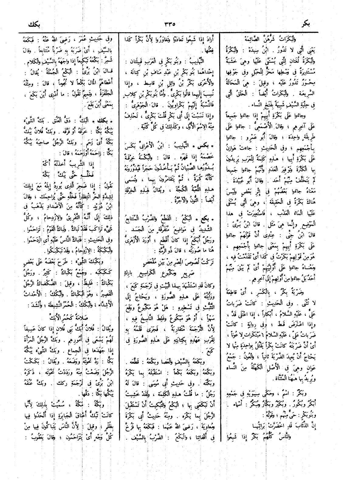 والبَكَرَاتُ شَرُّهُنَّ الصَّائِمَهْ يعني التي لا تدور ابن سيده والبَكْرَةُ والبَكَرَةُ لغتان للتي يستقى عليها وهي خشبة مستديرة في وسطها مَحْزُّ للحبل وفي جوفها مِحْوَرٌ تدور عليه وقيل هي المَحَالَةُ السَّريعة والبَكَراتُ أَيضاً الحَلَقُ التي في حِلْيَةِ السَّيْفِ شبيهة بِفَتَخِ النساء وجاؤوا على بَكْرَةِ أَبيهم إِذا جاؤوا جميعاً على آخرهم وقال الأَصمعي جاؤوا على طريقة واحدة وقال أَبو عمرو جاؤوا بأَجمعهم وفي الحديث جاءت هوازنُ على بَكْرَةِ أَبيها هذه كلمة للعرب يريدون بها الكثرة وتوفير العدد وأَنهم جاؤوا جميعاً لم يتخلف منهم أَحد وقال أَبو عبيدة معناه جاؤوا بعضهم في إِثر بعض وليس هناك بَكْرَةٌ في الحقيقة وهي التي يستقى عليها الماء العذب فاستعيرت في هذا الموضع وإِنما هي مثل قال ابن بري قال ابن جني عندي أَن قولهم جاؤوا على بكرة أَبيهم بمعنى جاؤوا بأَجمعهم هو من قولهم بَكَرْتُ في كذا أَي تقدّمت فيه ومعناه جاؤوا على أَوليتهم أَي لم يبق منهم أَحد بل جاؤوا من أَولهم إِلى آخرهم وضربة بِكْرٌ بالكسر أَي قاطعة لا تُثْنَى وفي الحديث كانت ضربات عليّ عليه السلام أَبْكاراً إِذا اعْتَلَى قَدَّ وإِذا اعْتَرَضَ قَطَّ وفي رواية كانت ضربات عليّ عليه السلام مبتكرات لا عُوناً أَي أَن ضربته كانت بِكراً يقتل بواحدة منها لا يحتاج أَن يعيد الضربة ثانياً والعُون جمع عَوانٍ هي في الأَصل الكهلة من النساء ويريد بها ههنا المثناة وبَكْرٌ اسم وحكي سيبويه في جمعه أَبْكُرٌ وبُكُورٌ وبُكَيْرٌ وبَكَّارٌ ومُبَكِّر أَسماء وبَنُو بَكْرٍ حَيٌّ منهم وقوله إِنَّ الذِّئَابَ قَدِ اخْضَرَّتْ بَراثِنُها والناسُ كُلُّهُمُ بَكْرٌ إِذا شَبِعُوا أَراد إِذا شبعوا تعادوا وتغاوروا لأَن بكراً كذا فعلها التهذيب وبنو بكر في العرب قبيلتان إِحداهما بنو بكر بن عبد مناف بن كنانة والأُخرى بكر بن واثل بن قاسط وإِذا نسب إِليهما قالوا بَكْرِيُّ وأَما بنو بكر بن كلاب فالنسبة إِليهم بَكْرْاوِيُّونَ قال الجوهري وإِذا نسبت إِلى أَبي بكر قلت بَكْرِيٌّ تحذف منه الاسم الأَول وكذلك في كل كنية