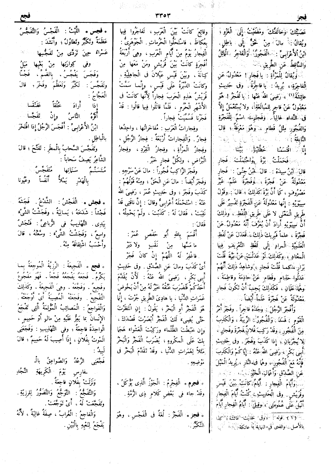 ( * قوله « وفي حديث عائشة » كذا بالأصل والذي في النهاية عاتكة ) رضي اللَّه عنها يا لَفُجَر هو معدول عن فاجِرٍ للمبالغة ولا يستعمل إِلا في النداء غالباً وفَجارِ اسم للفَجْرَة والفُجورِ مثل قَطامِ وهو معرفة قال النابغة إِنا اقْتَسَمْنا خُطَّتَيْنا بيننا فَحَمَلْتُ بَرَّةَ واحتملتَ فَجارِ قال ابن سيده قال ابن جني فَجارِ معدولة عن فَجْرَةَ وفَجْرَةُ علم غير مصروف كما أَن بَرَّةَ كذلك قال ووقول سيبويه إِنها معدولة عن الفَجْرَةِ تفسير على طريق المعنى لا على طريق اللفظ وذلك أَن سيبويه أَراد أَن يعرِّف أَنه معدول عن فَجْرَةَ علماً فيريك ذلك فعدل عن لفظ العلمية المراد إِلى لفظ التعريف فيها المعتاد وكذلك لو عدلتَ عن بَرَّةَ قلت بَرَارِ كما قلت فَجارِ وشاهد ذلك أَنهم عدلوا حَذام وقَطام عن حاذمة وقاطمة وهما علمان فكذلك يجب أَن تكون فَجارِ معدولة عن فَجْرَةَ علماً أَيضاً وأَفْجَرَ الرجلَ وجده فاجِراً وفَجَرَ أَمرُ القوم فسد والفُجور الرِّيبة والكذب من الفُجُورِ وقد ركب فلان فَجْرَةَ وفَجارِ لا يُجْرَيان إِذا كذب وفَجَرَ وفي حديث أَبي بكر رضي الله عنه إِياكم والكذب فإِنه مع الفُجُورِ وهما في النار يريد الميل عن الصدق وأَعمال الخير وأَيامُ الفِجارِ أَيامٌ كانت بين قَيْسٍ وقريش وفي الحديث كنت أَيام الفِجارِ أَنْبُلُ على عمومتي وقيل أَيام الفِجارِ أَيام وقائع كانت بين العرب تفاجروا فيها بعُكاظَ فاسْتَحَلُّوا الحُرُمات الجوهري الفِجارُ يوم من أَيام العرب وهي أَربعة أَفْجِرَةٍ كانت بين قريش ومَن معها من كِنانَةَ وبين قَيْس عَيْلان في الجاهلية وكانت الدَّبْرة على قيس وإِنما سَمَّتْ قريش هذه الحرب فِجاراً لأَنها كانت في الأَشهر الحرم فلما قاتلوا فيها قالوا قد فَجَرْنا فسميت فِجاراً وفِجاراتُ العرب مفاخراتها واحدها فِجارٌ والفِجاراتُ أَربعة فِجار الرجل وفِجار المرأَة وفِجار القِرْد وفِجار البَرَّاضِ ولكل فِجار خبر وفَجَرَ الراكبُ فُجوراً مال عن سرجه وفَجَرَ وفي حديث عمر رضي الله عنه اسْتَحْمَلَه أَعرابي وقال إِن ناقتي قد نَقِبتْ فقال له كذبتَ ولم يحمله فقال أَقْسَمَ بال أَبو حَفْصٍ عُمَرْ ما مَسَّها من نَقَبٍ ولا دَبَرْ فاغفر له اللهمَّ إِن كان فَجَرْ أَي كذب ومال عن الصدق وفي حديث أَبي بكر رضي الله عنه لأَن يُقَدَّمَ أَحدُكم فتُضْرَب عُنُقُه خير له من أَن يَخُوض غَمَراتِ الدنيا يا هادي الطريق جُرْتَ إِنما الفَجْر أَو البحر يقول ان انتظرت حتى يضيء لك الفجرُ أَبْصَرْتَ قصدك وإِن خَبَطت الظلماء وركبت العَشْواء هجما بك على المكروه يضرب الفَجْر والبحر مثلاً لغمرات الدنيا وقد تقدم البحرُ في موضعه
